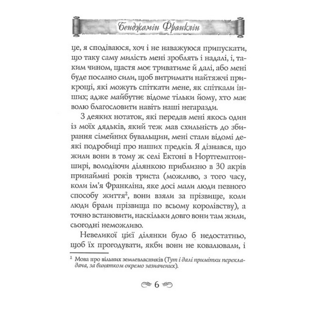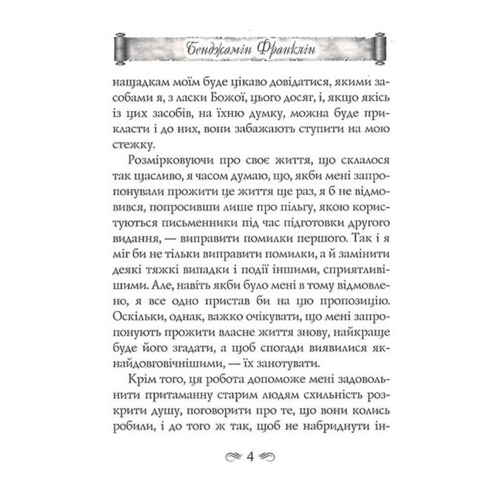 У пропонованій книзі Бенджаміна Франкліна, політичного діяча, письменника, науковця, видавця, одного із засновників Сполучених Штатів Америки, в автобіографічній формі викладено ті принципи, які допоможуть кожній сумлінній людині досягти життєвого успіху. Це, зокрема, працьовитість, поміркованість, ощадливість, стриманість, справедливість, рішучість, внутрішня рівновага, моральна стійкість. Утілюючи ці чесноти в життя, Бенджамін Франклін, навіть зазнаючи невдач і розчарувань, зазвичай досягав успіху в усіх своїх справах і проєктах: створенні власної друкарні, видавництві й редагуванні «Пенсильванської газети», заснуванні Філадельфійської публічної бібліотеки та Філадельфійського університету, Американського філософського товариства, організації народного ополчення в боротьбі за незалежність Сполучених Штатів Америки, винайденні печі для обігріву будинків і вдосконаленні ліхтарів вуличного освітлення, результативних наукових експериментах із електрикою тощо.