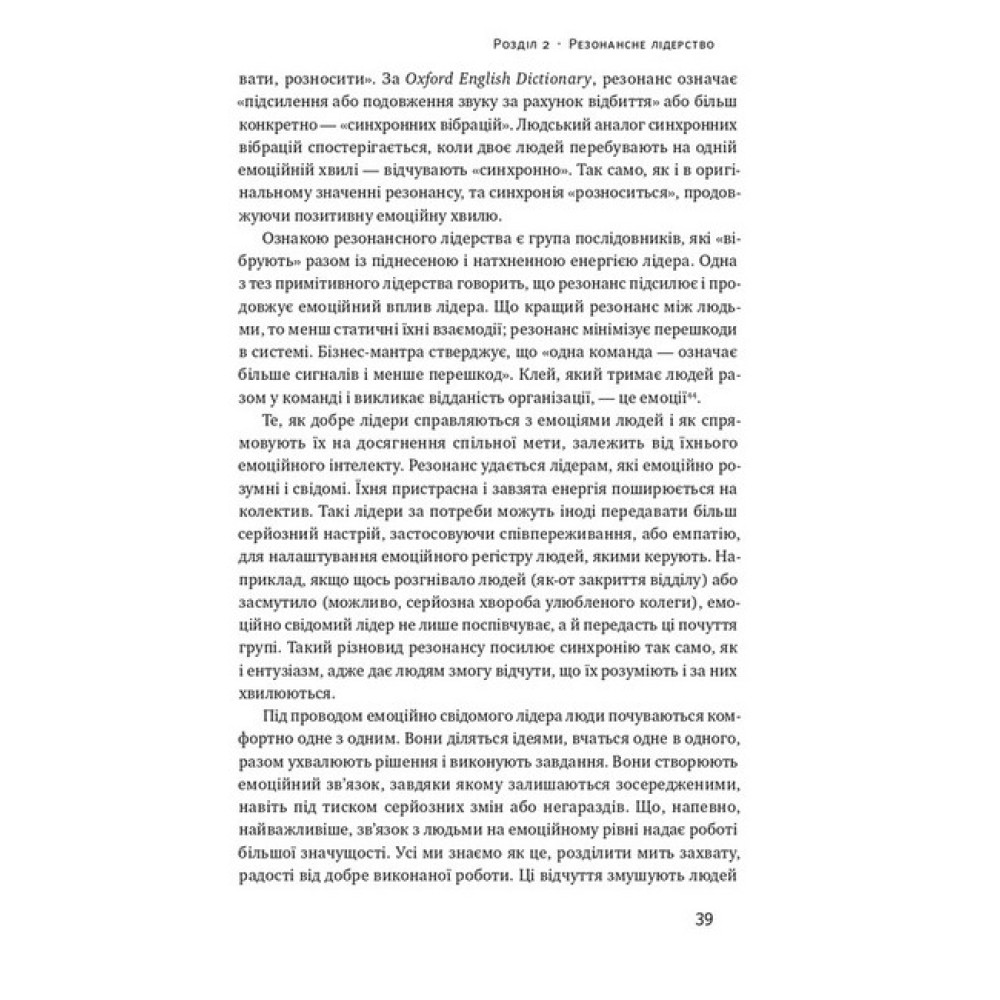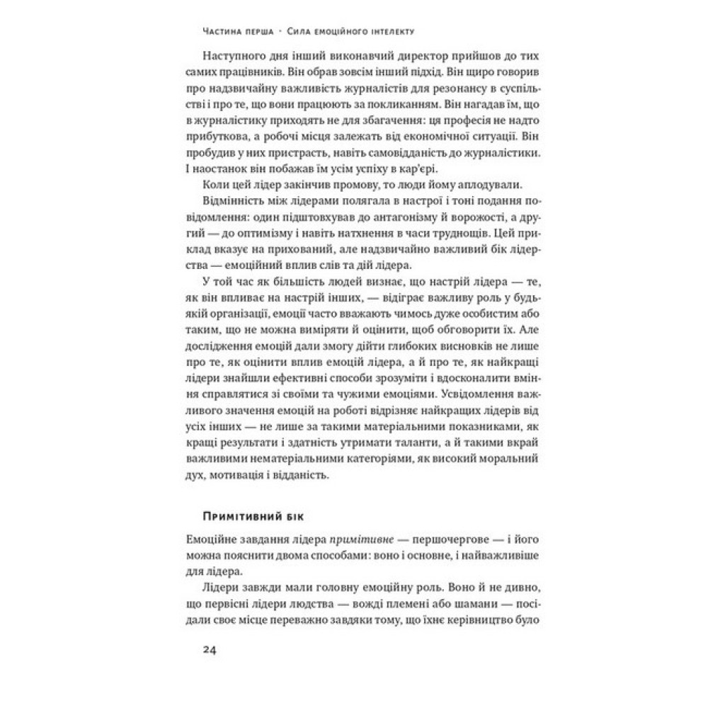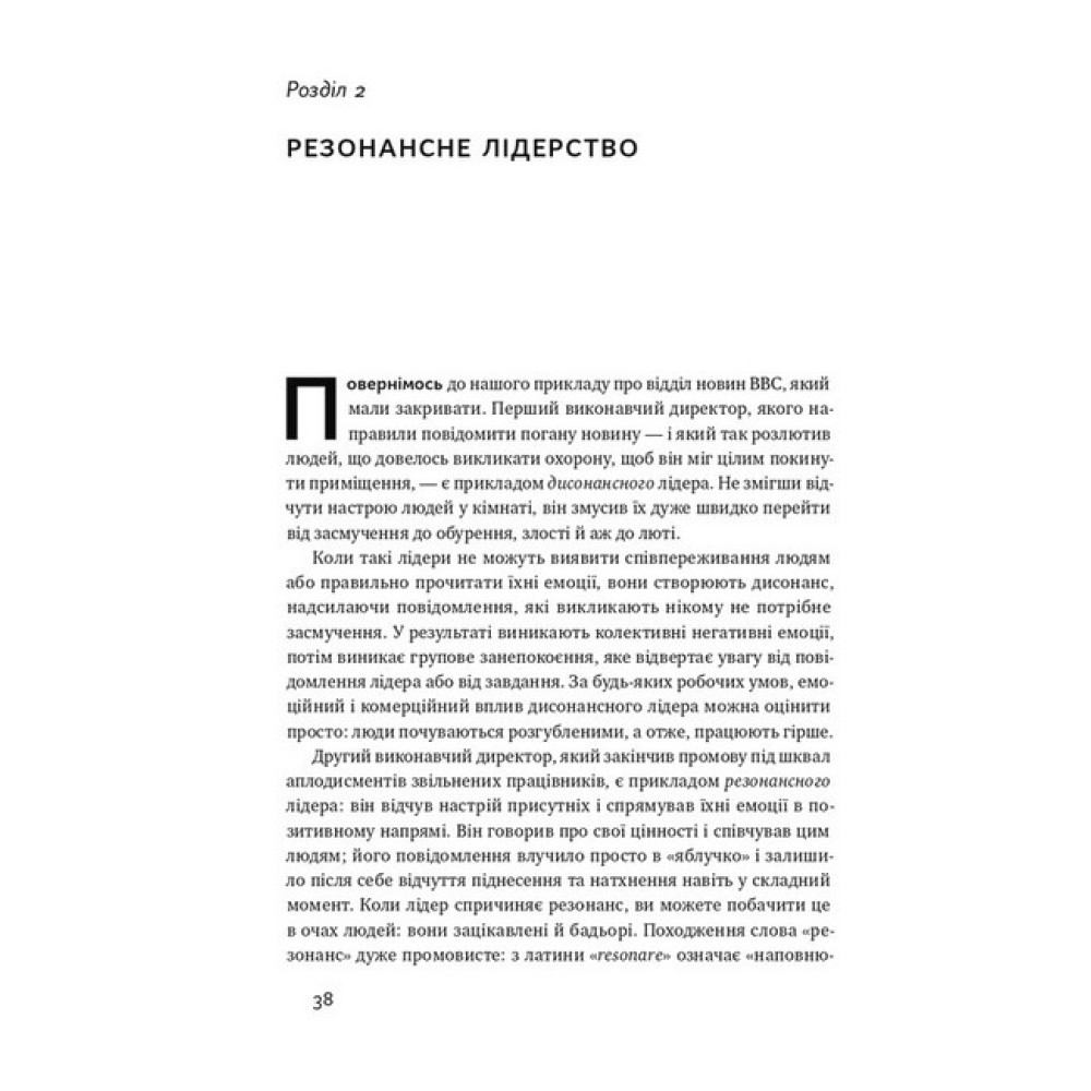Тривалий час люди вважали, що емоції в ділових стосунках шкодять нормальній роботі компаній. Однак управляти — це не лише налагоджувати процеси, створювати стратегію і продукувати сильні ідеї. Справжній лідер має надихати, пробуджувати ентузіазм, підтримувати в людях мотивацію і знаходити їхні найсильніші сторони. Що дає лідеру сил горіти своєю роботою й залишатися вірним компанії? Як він створює атмосферу, сприятливу для креативних ідей та інновацій?У цій книжці експерти з емоційного інтелекту пояснюють, чому емоції, уміння розуміти і співпереживати допомагають, а не заважають лідеру керувати колективом. Вони також зосереджуються на тому, як розвинути навички емоційного лідерства в собі. Книжка для всіх, хто цікавиться психологією, лідерством, для керівників усіх рівнів, HR-фахівців.Про авторів: Деніел Ґоулман — психолог, колумніст, фахівець із вивчення емоційного інтелекту. Двічі номінований на здобуття Пулітцерівської премії за журналістські тексти для Times. Дописувач New York Times.Річард Бояціс — експерт з емоційного інтелекту, почесний професор Західного резервного університету Кейса.Енні Маккі — старша наукова співробітниця Пенсильванського університету.
