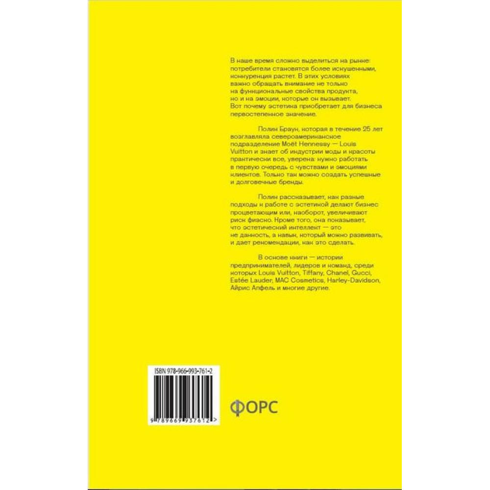 Полин Браун в течение 25 лет возглавляла североамериканское подразделение LVMH (Moet Hennessy Louis Vuitton — французская транснациональная компания, известный производитель предметов роскоши под торговыми марками Christian Dior, Louis Vuitton и других). Она знает об индустрии моды и красоты практически все. Полин уверена: сейчас нужно работать в первую очередь не с функциональными свойствами продукта, а с чувствами и эмоциями клиентов. Только так можно создать успешные и, что самое важное, долговечные бренды.В этой книге Полин на примерах многих известных компаний рассказывает, как разные подходы к работе с эстетическими принципами делают бизнес процветающим или, наоборот, увеличивают риск фиаско (если не налажена работа с эстетической составляющей). Кроме того, она показывает, как самостоятельно развить эстетический интеллект (а значит, и личный стиль): с ее точки зрения, это не данность, а навык, который можно тренировать (хотя на это потребуются время и силы). В основе книги — истории предпринимателей, лидеров и команд, среди которых Louis Vuitton, Tiffany, Chanel, Gucci, Estee Lauder, MAC Cosmetics, Harley-Davidson, Айрис Апфель, Джо Меллоу и многие другие.Фишки книги Автор в течение 25 лет руководила подразделением Moet Hennessy Louis Vuitton. Возможность взглянуть на индустрию моды изнутри. Упражнения на развитие эстетических способностей.Для кого эта книга- Для владельцев бизнеса и руководителей, осознающих важность эстетики.- Для всех, кто принимает участие в создании продукта или бренда.- Для тех, кто хочет развить собственный эстетический интеллект.- Для всех, кто интересуется индустрией моды и красоты.