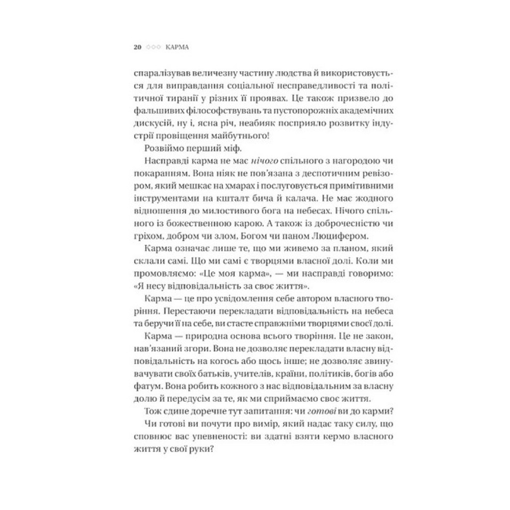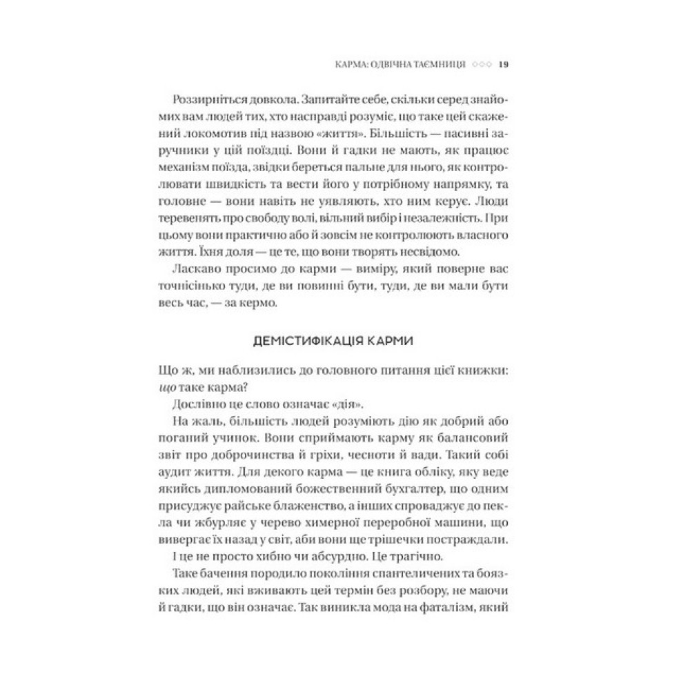 Іноді, коли з хорошими людьми трапляються погані речі, навколо відбувається щось жахливе, а ми збентежено намагаємося знайти відповіді, у голові виринає слово «карма». Цей санскритський термін проник у лексикон різних мов, глибоко закоренився як в езотериці, так і в попкультурі. Його можна почути від дітей і дорослих, від представників будь-яких професій на всіх континентах. На думку багатьох людей, карма — це баланс добрих і поганих вчинків, чеснот і гріхів, механізм, зав’язаний на неможливості уникнути наслідків власних дій. Насправді карма не має нічого спільного з винагородою чи покаранням. Карма — єдина логіка, що пояснює нібито випадковий характер подій у світі, в якому ми живемо, це внутрішній цикл, створений самими людьми, і він базується на наших діях і відповідальності. «Карма» Садхґуру — це водночас дослідження і путівник шляхами до радісного, свідомого та змістовного буття, книга, яка допомагає взятися за кермо власної долі й самотужки керувати своїм життям.