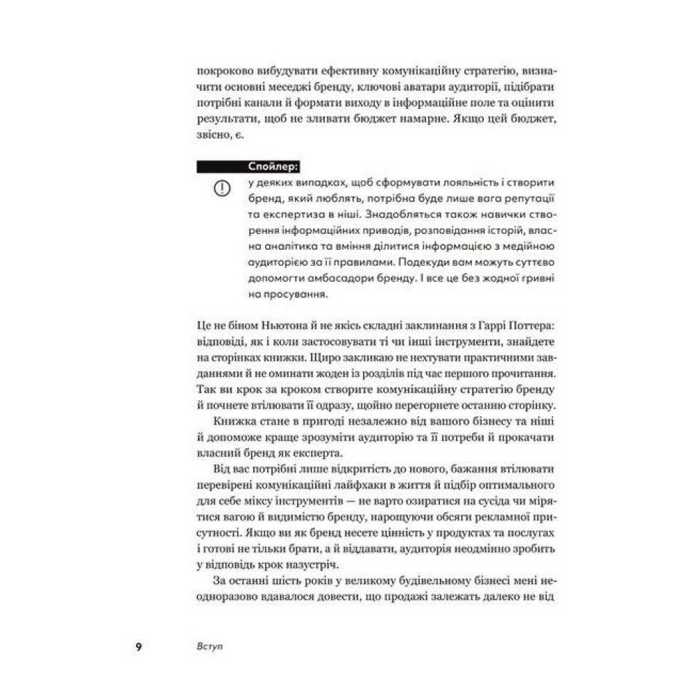 Будь-який бізнес матиме успіх лише тоді, коли завоює лояльність широкої аудиторії. Без грошей і хитрощів — за допомогою правди й ефективної системи комунікацій. Перед вами книжка, яка допоможе це зробити. Авторка докладно інформує, як самотужки розробити комунікаційну стратегію та втілити її в життя незалежно від ніші й наявності чи відсутності бюджету на просування. Ціла низка корисних і зрозумілих схем, таблиць, інформативних практичних порад та професійних секретів, якими щедро ділиться авторка, вам у поміч. Завдяки QR-кодам ви матимете змогу одразу завантажити їх у смартфон і використовувати для своєї роботи.
