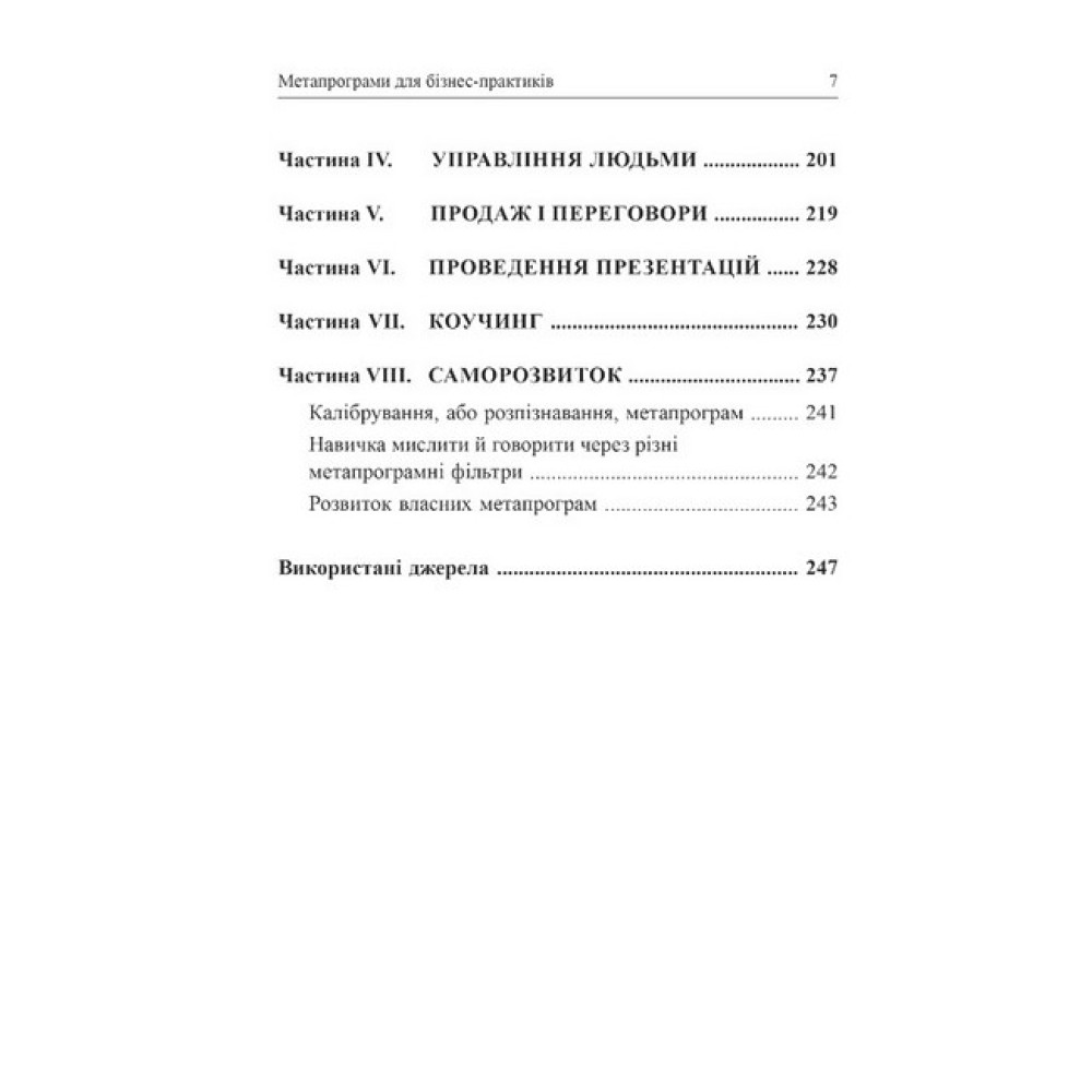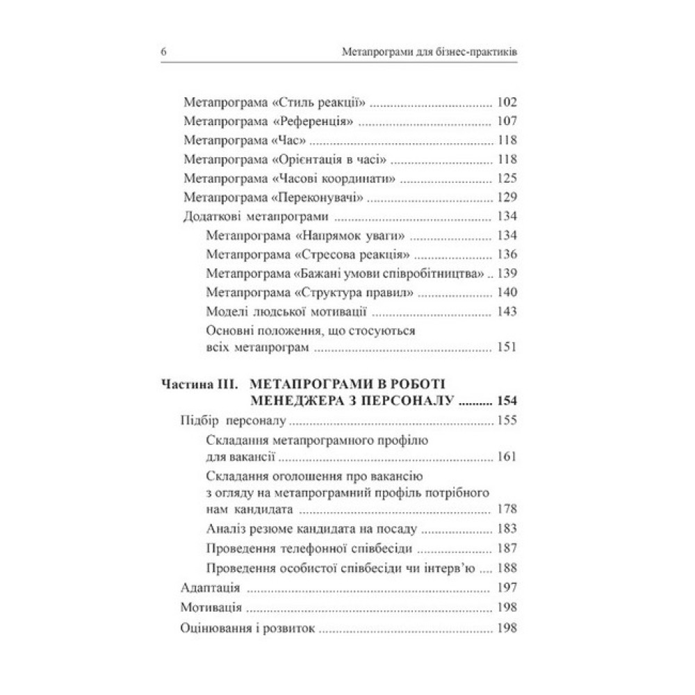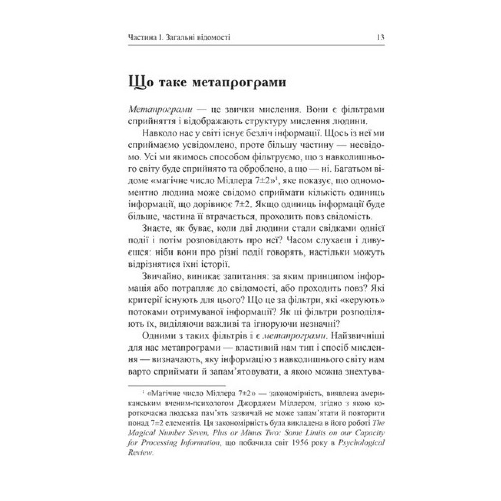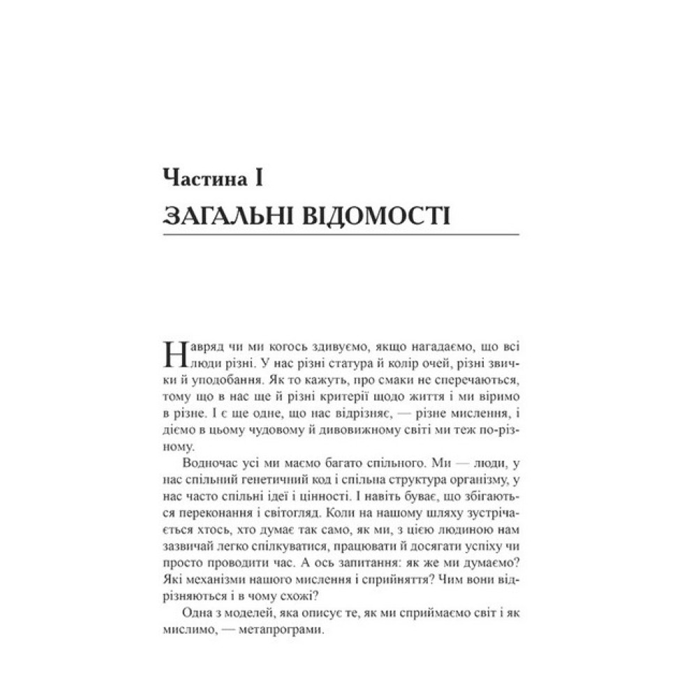 У своїй книзі «Метапрограми для бізнес-практиків. Сучасні інструменти розуміння людей і впливу на них» Катерина Гайдученко розповідає про метапрограми — надзвичайно ефективний інструмент, що допомагає зрозуміти, як улаштовані й діють наше сприйняття та мислення.Уже понад 30 років у всьому світі метапрограми успішно застосовують у бізнесі. У книзі ви знайдете не тільки детальний опис метапрограм із численними прикладами їх прояву, а й практичні рекомендації щодо можливості використання їх у таких сферах, як HR, управління персоналом, продаж і саморозвиток.Катерина Гайдученко — бізнес-тренерка, консультантка, сертифікована тренерка НЛП. Має досвід застосування метапрограм у бізнесі й коучингу з 2005 року. Тренінги з метапрограм веде з 2008 року. Основна спеціалізація: персональне консультування, коучинг і тренінги у сфері HR, управління персоналом, емоційного інтелекту й НЛП. Співавторка проєкту «Школа нейрокоучингу» та книги «Нейрокоучинг: архітектура досягнень».