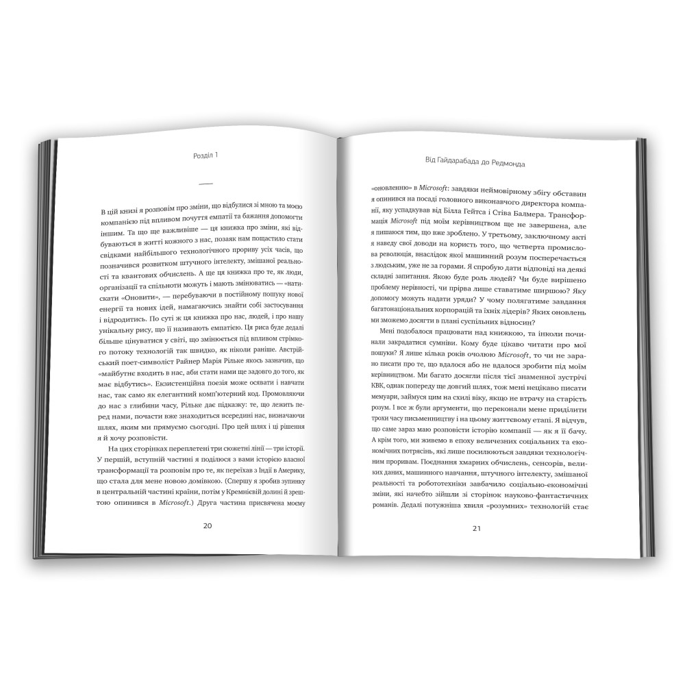 Головний виконавчий директор Microsoft розповідає про історію трансформації компанії та водночас про власне життя - від дитинства, проведеного в Індії, до безпосереднього керівництва впровадженням низки новітніх цифрових технологій, викладає власне бачення майбутнього компанії та нової хвилі розумних технологій.