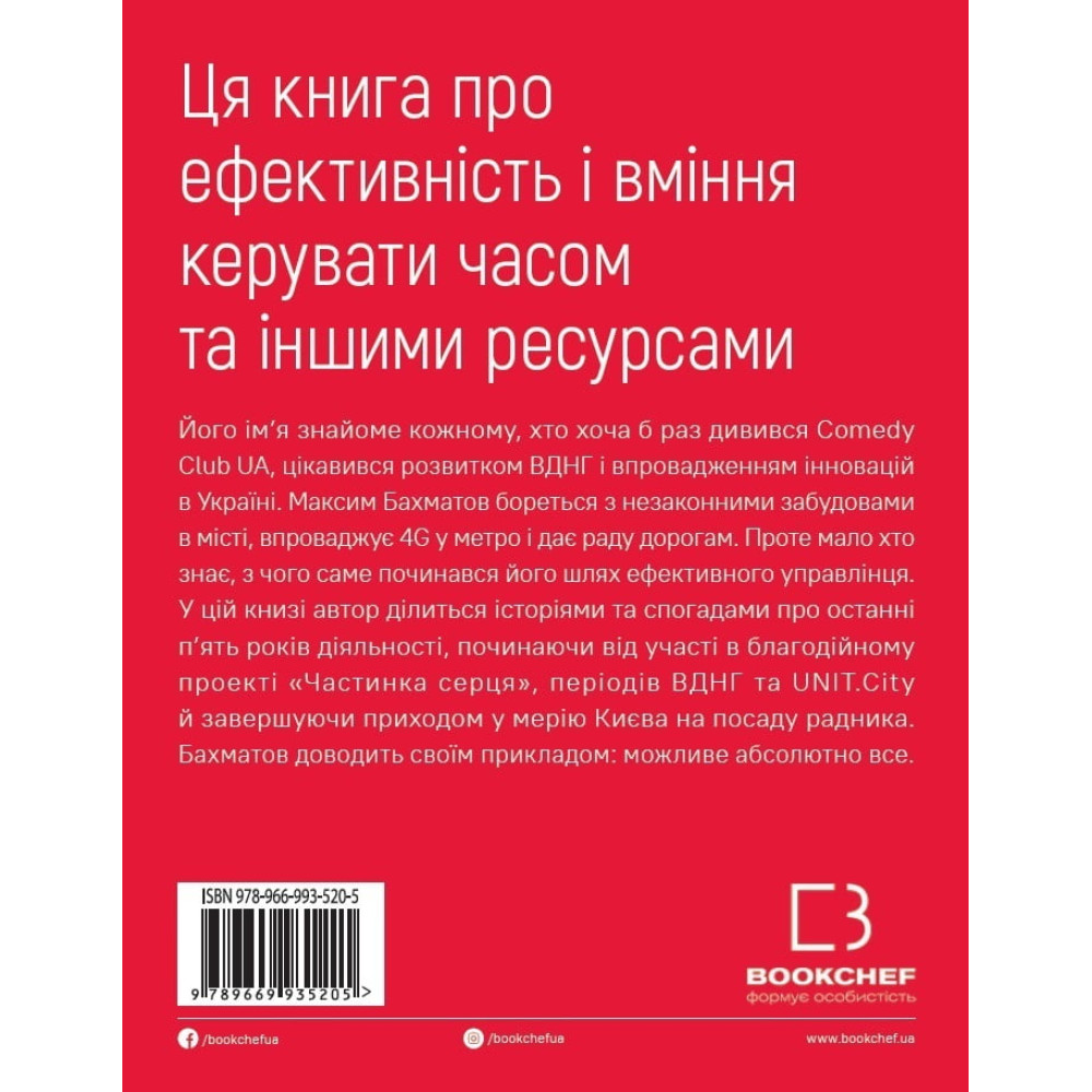 Эта книга про эффективность, умение управлять временем и другими ресурсами. Его имя знакомо каждому, кто хотя бы раз смотрел Comedy Club UA, следил за развитием ВДНГ и внедрением инноваций в Украине.Максим Бахматов борется с незаконным строительством в городе, внедряет 4G в метро и наводит порядки на дорогах. Однако мало кто знает, с чего именно начинался его путь эффективного управленца. В этой книге автор делится историями и воспоминаниями о последних пяти годах деятельности, начиная от участия в благотворительном проекте "Частинка серця", периодах ВДНГ и UNIT.City, заканчивая приходом в мэрию Киева на пост советника. Бахматов доказывает: возможно абсолютно всё.Його ім'я знайоме кожному, хто хоча б раз дивився Comedi Club UA, цікавився розвитком ВДНГ і впровадженням інновацій в Україні. Максим Бахматов бореться з незаконними забудовами в місті, впроваджує 4G у метро і дає раду дорогам. Проте мало хто знає, з чого починався його шлях ефективного управлінця. У цій книзі автор ділиться історіями та спогадами про останні п'ять років діяльності, починаючи від участі в благодійному проекті 'Частинка серця', періодів ВДНГ та UNIT.City й завершуючи приходом у мерію Києва на посаду радника. Бахматов доводить своїм прикладом: можливе абсолютно все. В цій книзі Максим «Лєдокол» ділиться найцікаві-шими історіями останніх 5 років свого життя. Жод-них порад. Відверто і з гумором: історії успішних змін, досягнень та контролю ефективності. Автор запевняє читача: ти такий самий, як і я – бери і роби.Про що читачі дізнаються з книги:Як керувати часом та іншими ресурсами, щоб досягати цілей.Як перетворити мотозавод на інноваційне IT-місто УкраїниЯк вдихнути нове життя в держпідприємство.Як прожити у вітрині й зібрати 1 600 000 грн на порятунок 32 дітей.Додатково всередині: Сексі-постер + Фешн-сторі.