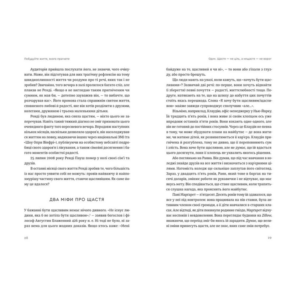 Чи можливо стати і залишатися щасливими? Як це зробити, якщо більшість життєвих проблем ми не здатні розв’язати так швидко й ефективно, як хотіли б? Професор Артур Брукс, що веде університетський курс зі щастя, разом зі співавторкою, знаною телеведучою Опрою Вінфрі, досліджують у цій книжці актуальні для всіх часів питання. Ця книжка не про силу волі, а про силу розривання патернів і змінювання звичок. Ви дізнаєтеся про основні мікроелементи щастя: втіху, задоволення і мету. Зрозумієте, що є щастям і нещастям саме для вас. Отримаєте конкретні поради щодо того, як обрати найкращу роботу, як знаходити друзів і підтримувати дружні стосунки, як у цьому буремному світі знайти собі пару і як розвивати духовну складову вашого життя. А головне — як на певному етапі життя стати вчителем для інших.