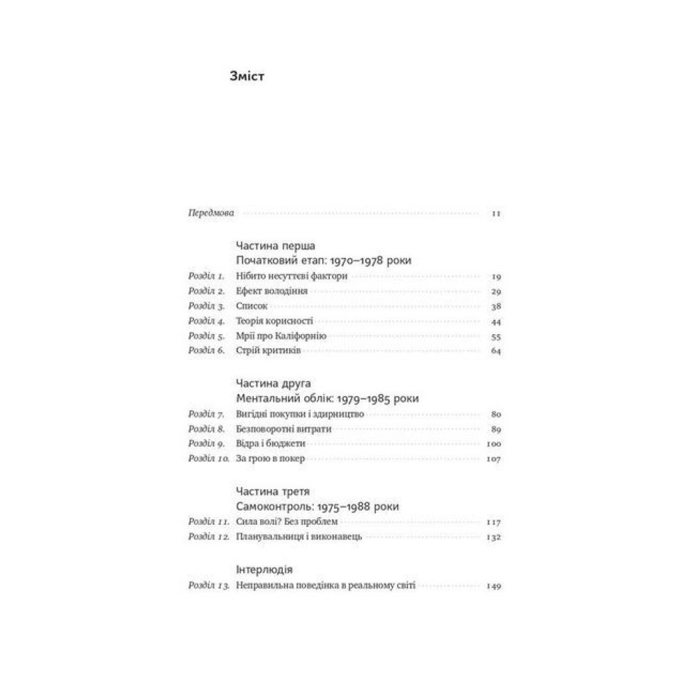 Книжка Річарда Талера — лауреата Нобелівської премії з економіки 2017 року, відзначеного за внесок у галузь поведінкової економікиЗа класичною економічною теорією, люди діють раціонально. Та й самі ми схильні думати, що ухвалюємо рішення з максимальною вигодою для себе. Однак нашим вибором часто керують емоції, і Річард Талер на основі численних досліджень та прикладів із життя переконає вас у цьому. Яких помилок ми як споживачі припускаємося щодня? За яких обставин ми більше схильні до ризику та як ефективно заощаджувати кошти? Про розумні капіталовкладення, гіпотезу ефективного ринку, фреймінг, про наші упередження та самоконтроль він розповідає не лише зрозуміло та цікаво, а й навіть із гумором. ДЛЯ КОГО КНИЖКА Для бізнесменів, маркетологів, державних управлінців, політиків, а також для всіх, хто цікавиться поведінковою економікою та психологією, зокрема процесом прийняття рішень. ЧОМУ ЦЯ КНИЖКА Річард Талер доступно розкриває психологію ухвалення рішень і пояснює, як завдяки поведінковій економіці зробити світ кращим. ПРО АВТОРА Річард Талер — професор економіки та поведінкових наук Чиказького університету. Науковий співробітник Національного бюро економічних досліджень. Лауреат Нобелівської премії з економіки (2017) за ґрунтовний внесок у дослідження економічної поведінки та психології покупців. Був одним із радників Барака Обами. Автор економічних колонок для New York Times, а також п’яти книжок, зокрема «Поштовх. Як допомогти людям зробити правильний вибір» («Наш формат», 2017).