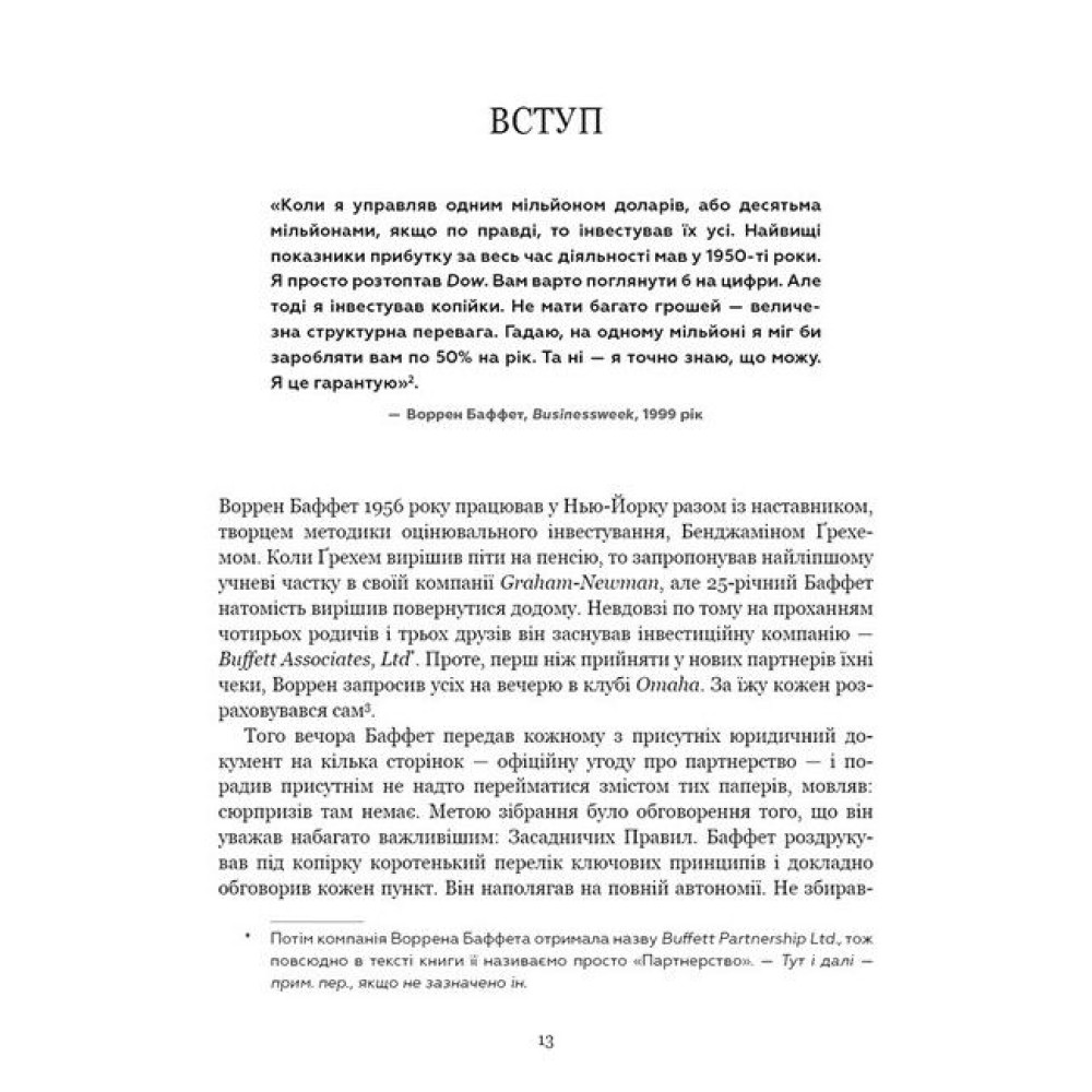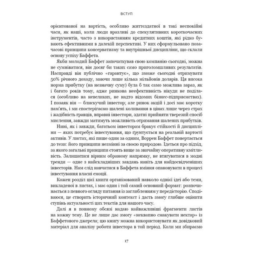 Воррен Баффет — відомий та успішний інвестор, один із найбагатших людей у світі, відрізняється індивідуальним стилем у веденні справ, уже давно його вважають гуру інвестування, позаочі називають «оракулом» і «мудрецем». В одній зі своїх перших компаній Buffett Partnership Limited, заснованій 1956 року, Баффет увів правило писати листи акціонерам, інформуючи їх про стан бізнесу й викладаючи принципи, якими керувався, ухвалюючи операційні рішення. Ці роки були найуспішнішими для компанії, показники прибутковості сягали найвищих індексів. За матеріалом цих листів і написав книгу Джеремі Міллер, інвестиційний аналітик, який вивчав причини успіху методів В. Баффета. Він систематизував листи Баффета, здійснив ґрунтовний аналіз принципів і філософії його роботи, виклавши результат своєї праці в цій книзі. І навіть попри зміну часів ці підходи лишаються актуальними й досі себе виправдовують.