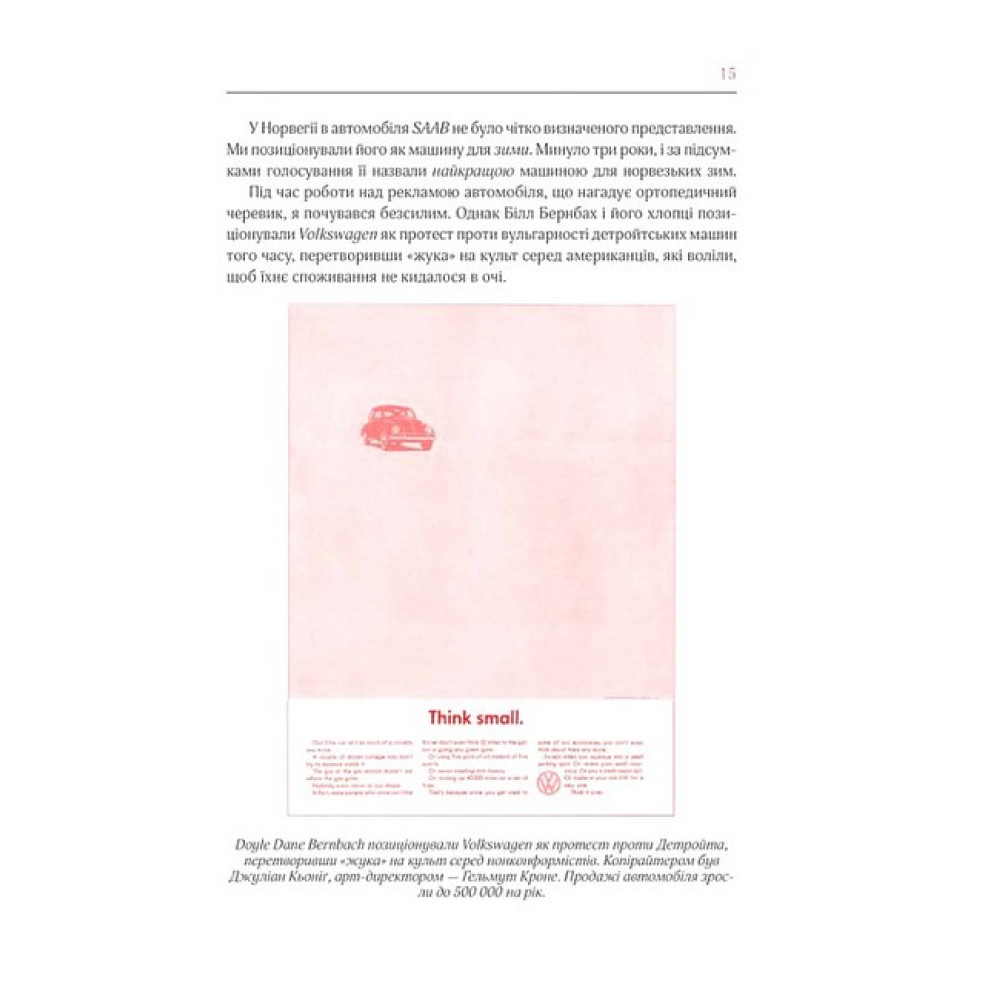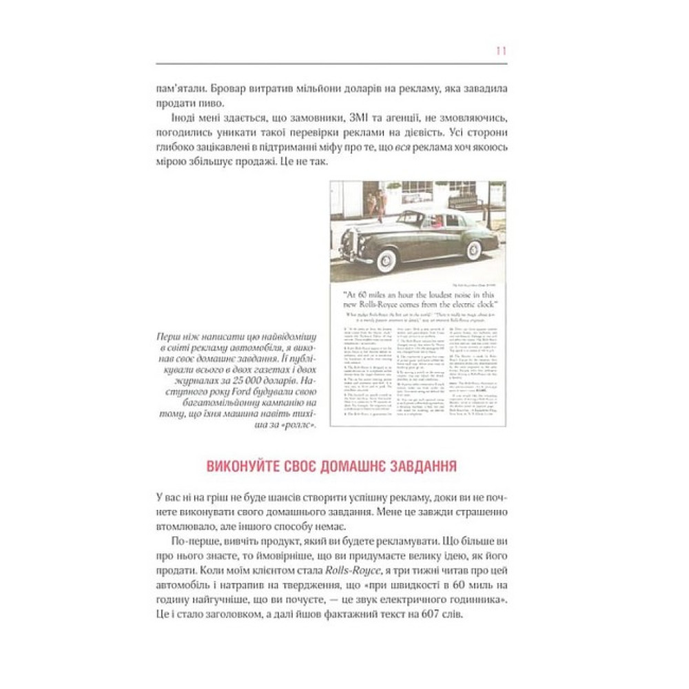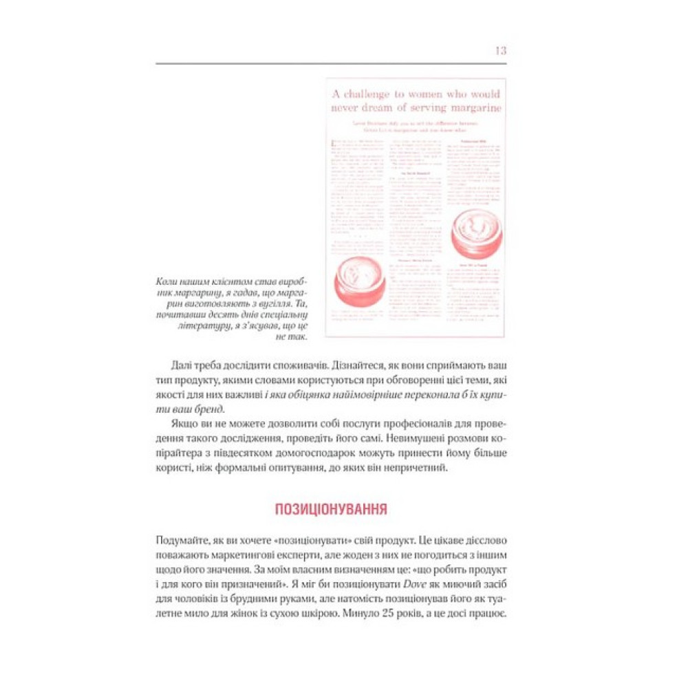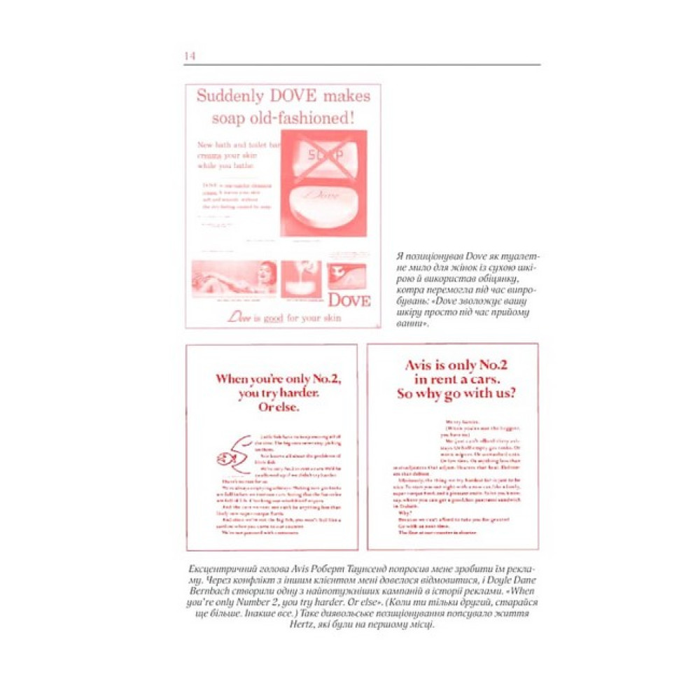 Це класика книг про рекламу, написана одним із видатних спеціалістів, батьком сучасної реклами — Девідом Оґілві.Вперше книга була опублікованав США ще 1983 року!Як зробити рекламу, яка продаватиме?Якими мають бути тексти, ілюстрації, дизайн?Як залучити та утримати клієнта?Як управляти рекламним агентством?У цій книзі численні історії реальних проєктів, блискучих ідей, а іноді й невдалих рішень. Оґілві описує всю «внутрішню кухню» світу реклами та розповідає численні байки, які дозволяють поринути у світ рекламного бізнесу минулого століття.Фішки книги:У книзі понад 150 кольорових та чорно-білих ілюстрацій —класичні приклади друкованої реклами та розкадрування телевізійних роликів. Теорія та практика реклами в картинках!А ще не забувайте про те, що ця книга написана одним із найкращих копірайтерів світу — вона читається легко та неймовірно цікаво.Книга обов’язкова до прочитання всім, хто пов’язаний з рекламою: копірайтерам, дизайнерам, менеджерам проєктів — особливо фахівцям-початківцям.