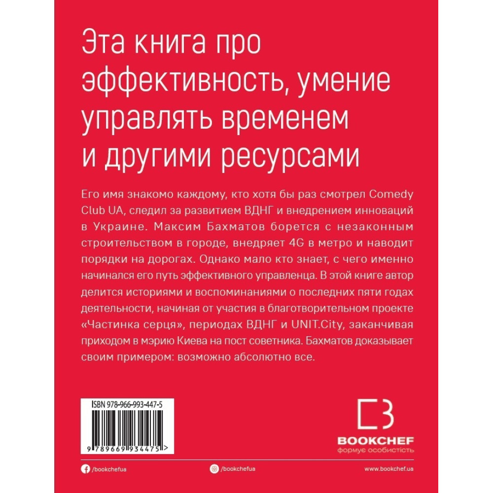Эта книга про эффективность, умение управлять временем и другими ресурсами. Его имя знакомо каждому, кто хотя бы раз смотрел Comedy Club UA, следил за развитием ВДНГ и внедрением инноваций в Украине. Максим Бахматов борется с незаконным строительством в городе, внедряет 4G в метро и наводит порядки на дорогах. Однако мало кто знает, с чего именно начинался его путь эффективного управленца. В этой книге автор делится историями и воспоминаниями о последних пяти годах деятельности, начиная от участия в благотворительном проекте "Частинка серця", периодах ВДНГ и UNIT.City, заканчивая приходом в мэрию Киева на пост советника. Бахматов доказывает: возможно абсолютно всё.