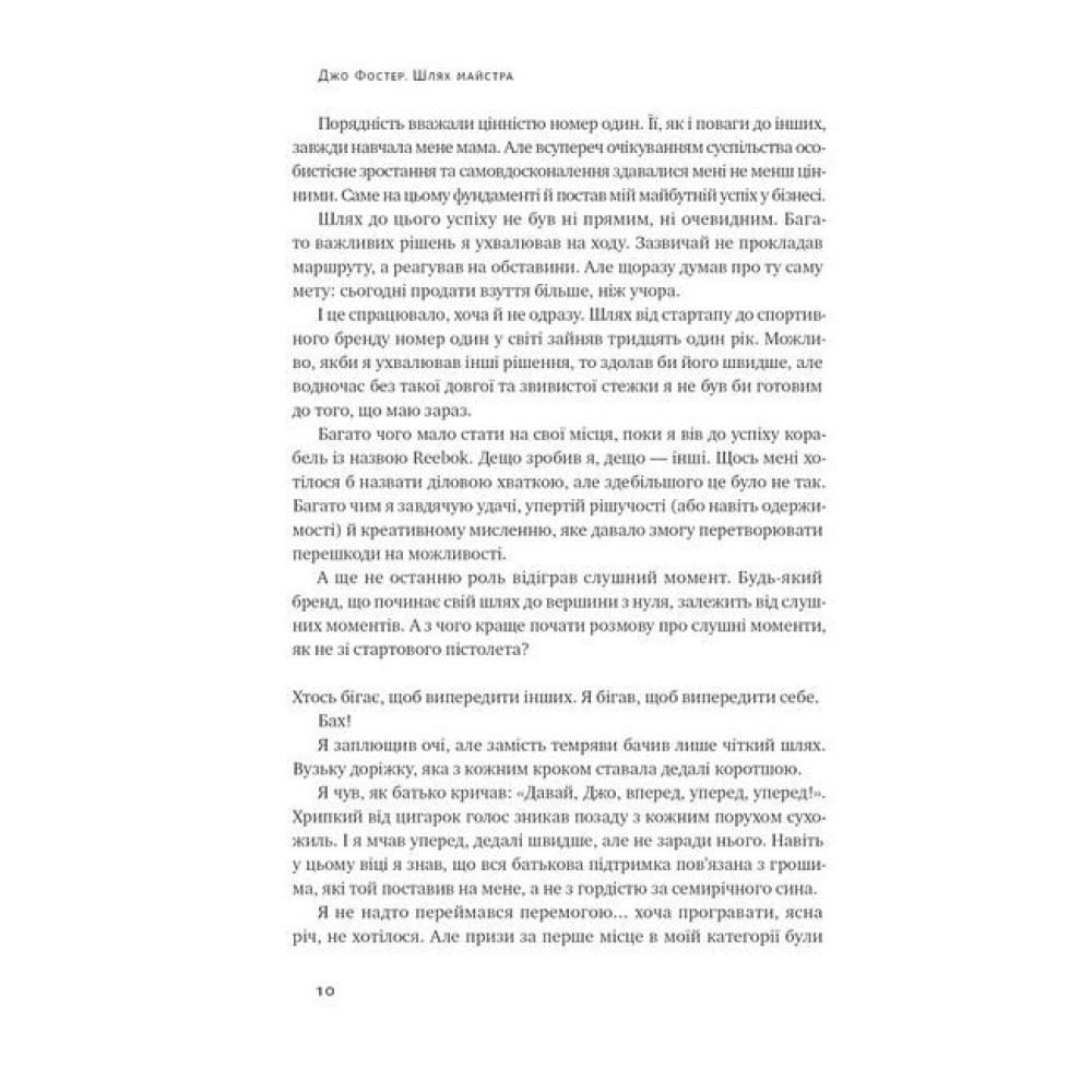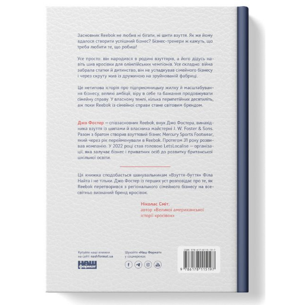 Засновник Reebok не любив ні бігати, ні шити взуття. Як же йому вдалося створити успішний бізнес? Бізнес-тренери ж кажуть, що треба любити те, що робиш! Усе просто: він народився в родині взуттярів, а його дідусь навіть шив кросівки для олімпійських чемпіонів. Усе складно: війна забрала статки й дитинство, він не успадкував сімейного бізнесу і через скруту жив з дружиною на зруйнованій фабриці. Це нетипова історія про підприємницьку жилку й масштабування бізнесу, великі амбіції, віру в себе та бажання продовжувати сімейну справу. У власному темпі, кілька перипетійних десятиліть, аж поки Reebok із сімейної справи стане світовим брендом. Це щира розповідь Джо Фостера про себе, родину й бізнес. У ній не все гладко: війна руйнує бізнес і життя, брати сваряться, Джо із дружиною живе на занепалій фабриці. Це шлях, що перетворив непевний стартап на славетну компанію. І це натхнення для всіх, хто мріє розпочати власну справу, але боїться викликів.