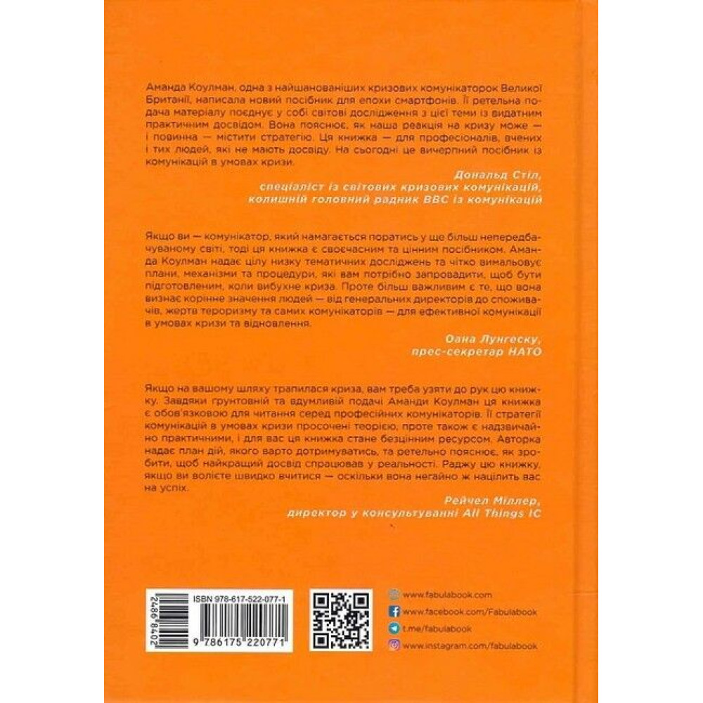 Чи можна підготуватися до кризи? Як захистити репутацію компанії? Чи можна відновитися після подій, які загрожують самому існуванню бізнесу? Видатна британська консультантка Аманда Коулман дає чіткі й переконливі відповіді на ці та чимало інших запитань, що зазвичай хвилюють вдумливих керівників і піарників. Ця актуальна книжка є втіленням більш ніж двадцятирічного досвіду практичної роботи авторки в галузі кризових комунікацій. Цінні поради, наведені результати досліджень і велика кількість конкретних прикладів стануть справжнім ресурсом у повсякденній діяльності професійного комунікатора до настання кризи і на будь-якому її етапі. А продумане планування, своєчасне реагування та постійна увага до людей допоможуть захистити бізнес, зробивши його міцним і стійким до будь-яких викликів.