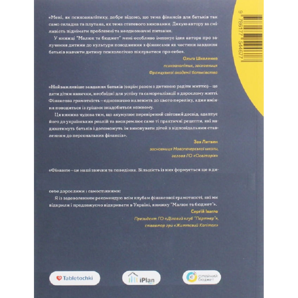 Коли розпочинати розмовляти з дітьми про гроші? Як краще давати кишенькові гроші? Як пояснити, що таке сімейний бюджет? Скільки і куди потрібно відкладати для якісної освіти? Як виховати свою дитину фінансово успішною? У цій книжці зібрано головне з досвіду провідних західних фахівців, а також із десятків статей щодо фінансової грамотності. Автор наводить адаптовані ігрові вправи та історії, якими можуть скористатися українські батьки. «Малюк та Бюджет» – це огляд семінарів, курсів, книжок, мультиків, фільмів, історій на тему дитячих фінансів і підприємництва. Це розмови з українськими батьками різного достатку, яких об’єднав позитивний досвід у навчанні власних дітей і готовність його оприлюднити. Якщо батьки володітимуть цією інформацією, то діти навчаться розумно управляти своїм грошима протягом усього життя.