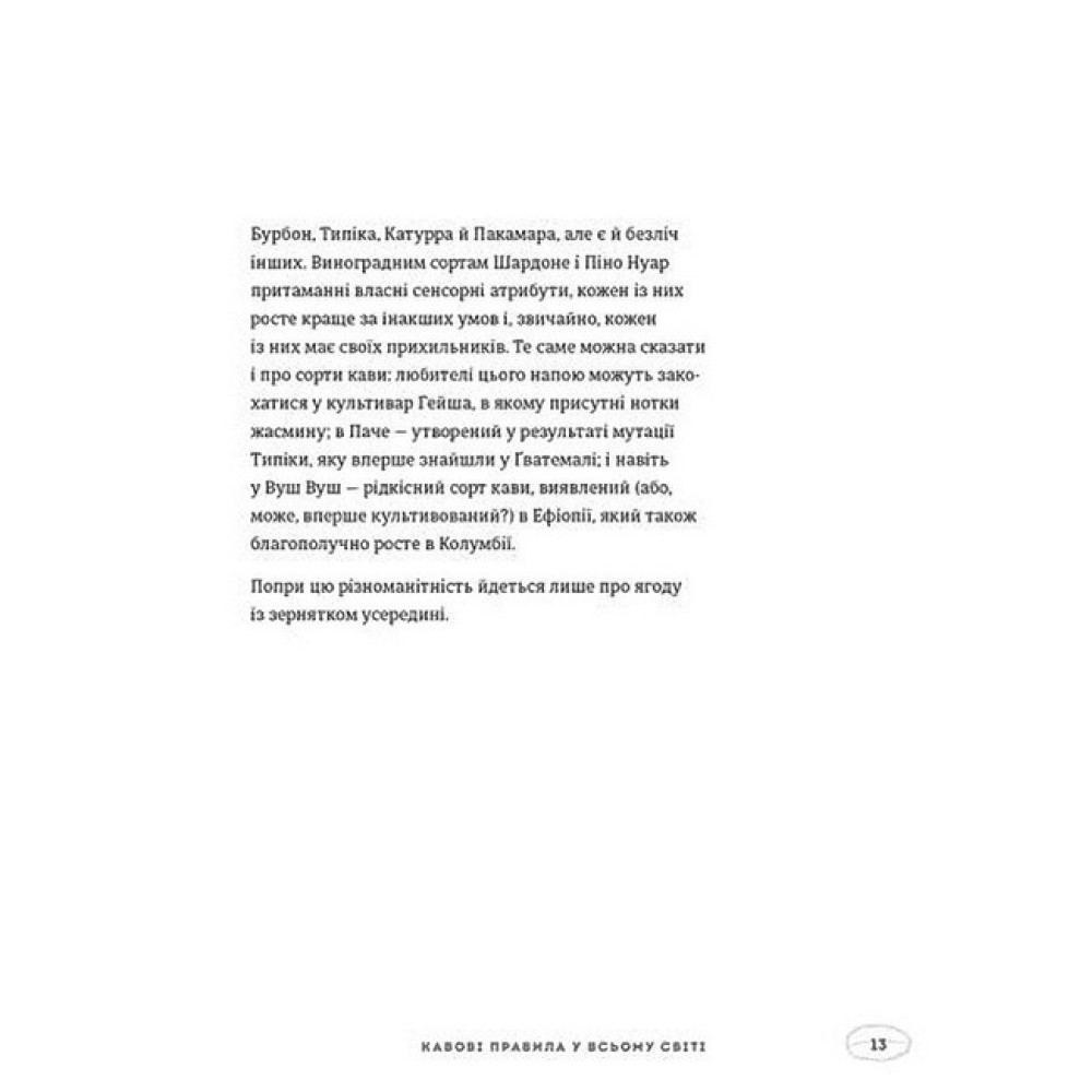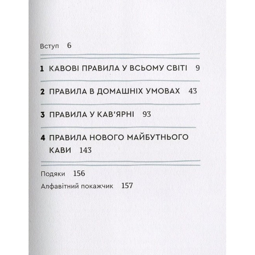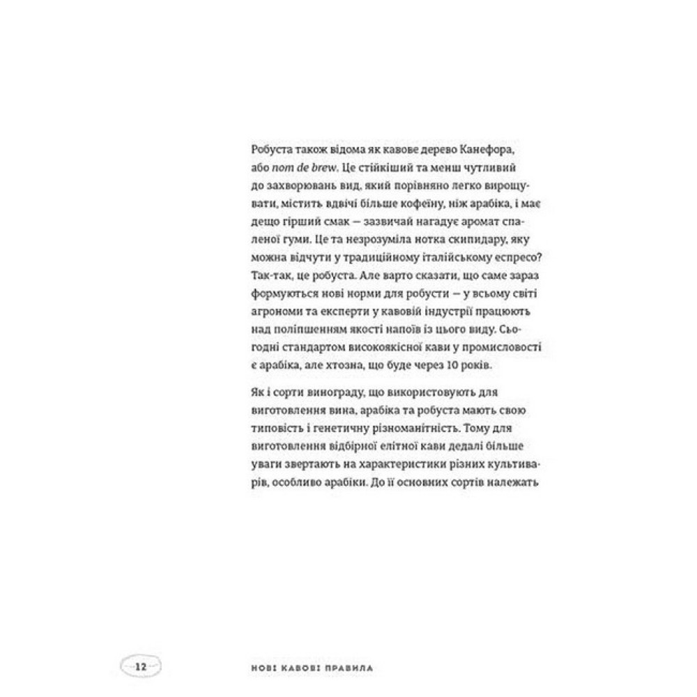 Сучасний світ не мислить свого життя без кави. Її п’ють вдома до сніданку, під час ділових бранчів, у мандрах; каву смакують, про неї говорять з насолодою, створюють музеї кави та вдосконалюють її виробництво.У цій книжці зібрано 55 кавових правил та рекомендацій про основи варіння кави, її зберігання, а ще міфи про каву, різні цікавинки та особливості нової міжнародної культури виробництва і споживання кави. Автори, засновники популярного американського блогу Sprudge, впевнені, що книжка надихне до появи не однієї кавової ідеї, і сподіваються, що читач отримає від прочитання радість і насолоду — так само, як і від горнятка доброї кави.