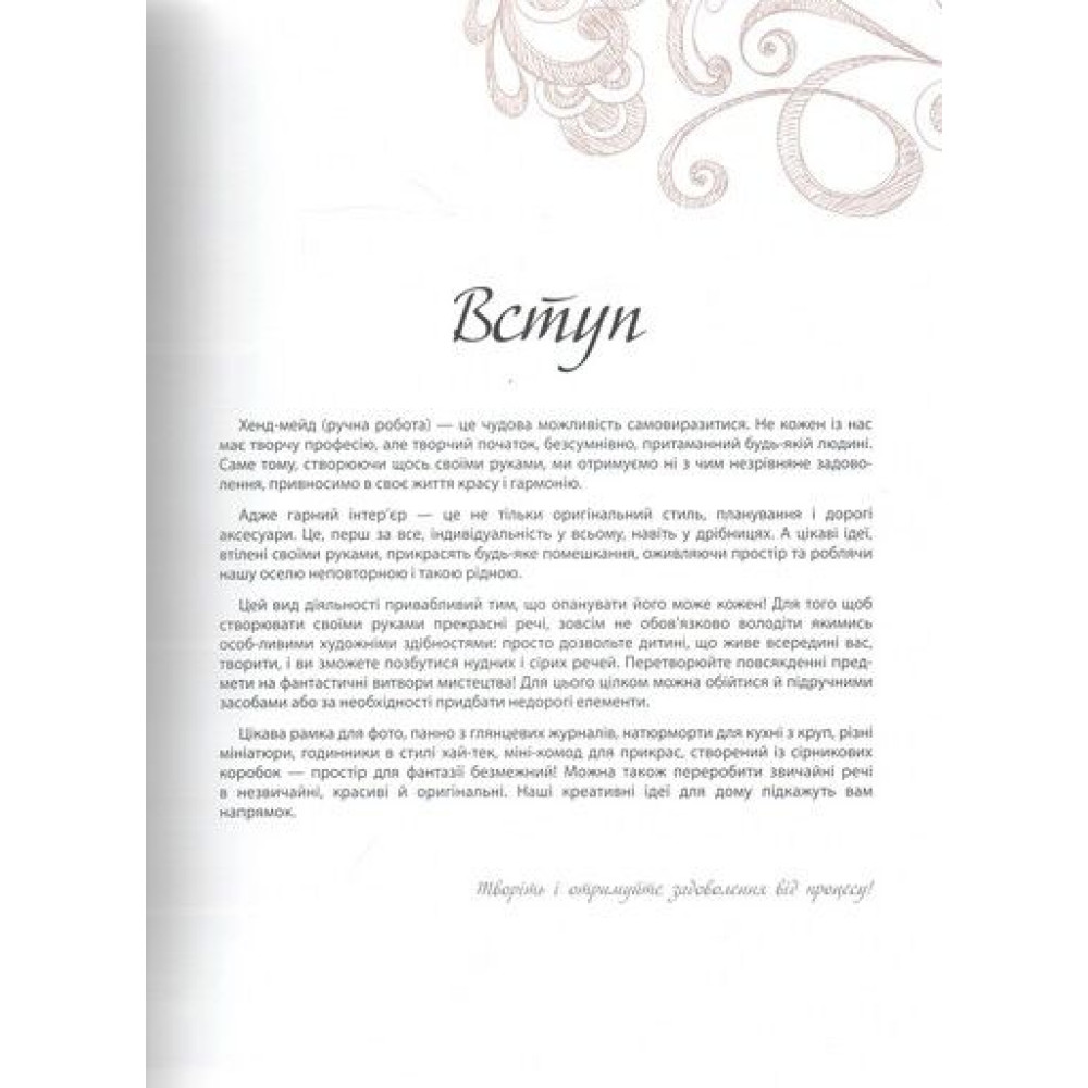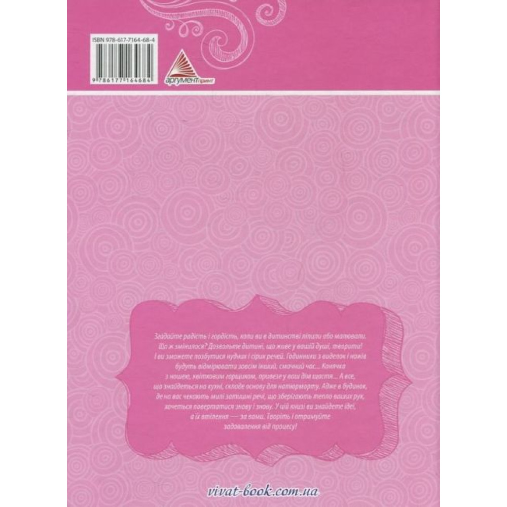Згадайте радість і гордість, коли ви ліпили або малювали в дитинстві. Що змінилося? Дозвольте дитині, що живе всередині, творити! І ви зможете позбутися від нудних і сірих речей. Годинники в стилі хай-тек з виделок і ножів будуть відміряти зовсім інше, смачне час... Конячка з ношею, квітковим горщиком, принесе в ваш дім щастя... А все, що знайдеться в кухні, складе основу для натюрморту. Адже в будинок, де вас чекають милі затишні штучки, що зберігають тепло ваших рук, хочеться повертатися. У цій книзі ви знайдете ідеї, а їх втілення - за вами. Творіть і отримуйте задоволення від процесу!