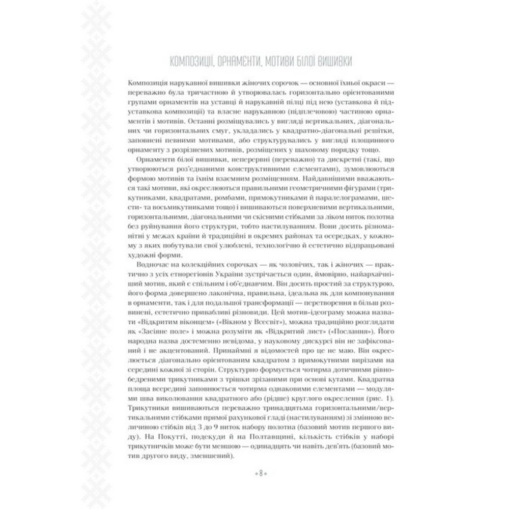 Понад 40 моделей вишивки білих та писаних сорочок!Візитівкою цього видання є чарівні білі та чорні писані сорочки з різних регіонів України, цікаві й самобутні за типами кроїв, колористикою вишивки, її компонуванням і технологіями виконання. «Відкрите віконце», «зоряний хрест», «кривулька», «хвилька», косі хрести, водяний ключ («гесик»), «колодки», «баранячі роги», зіркові «квіти» і «дволисники», «ріжкаті» трикутнички — відтворюйте кращі взірці орнаментів вишиваних шедеврів з музейних і приватних колекцій. У виданні подано інформацію про типи крою, види композицій, орнаментів та мотивів вишивки білих сорочок і художньо-технологічні особливості чорних писаних вишиванок. Представлено двадцять п’ять моделей сорочок з білою вишивкою і двадцять видів чорних писаних вишиванок. Кожна схема вишивки супроводжується переліком використаних швів. Книжка стане в пригоді вишивальницям із різними рівнями підготовки — і початківцям, і досвідченим майстриням.