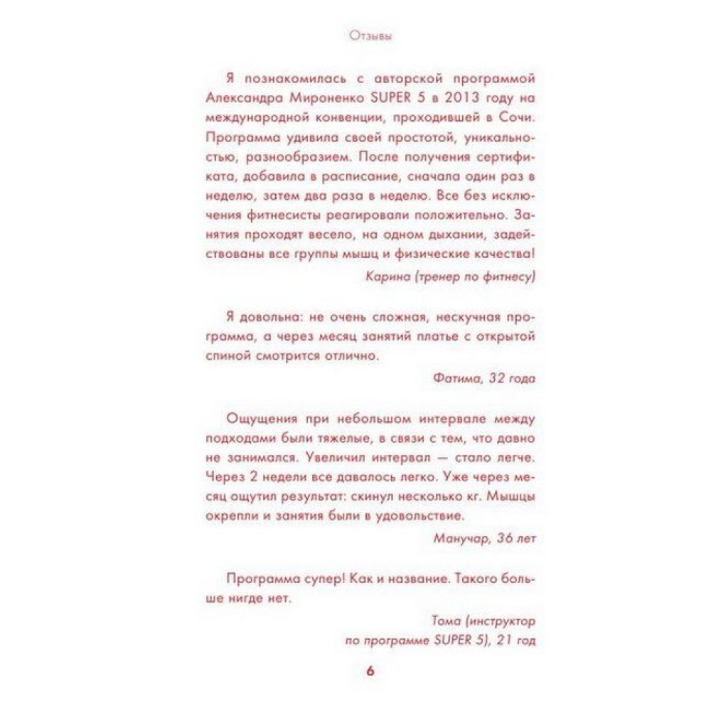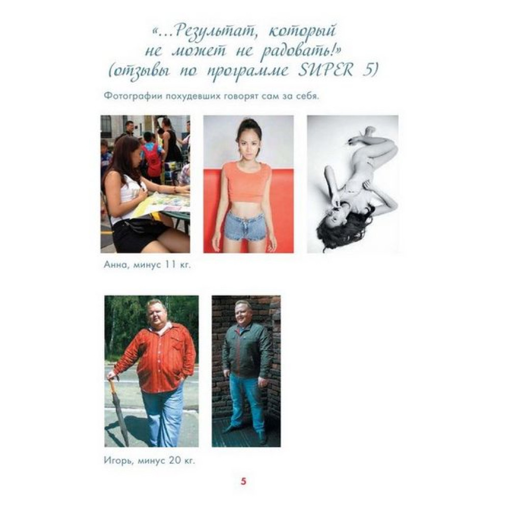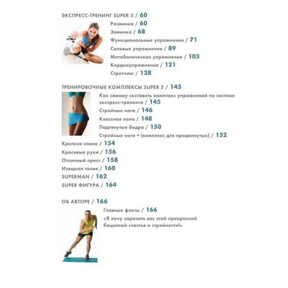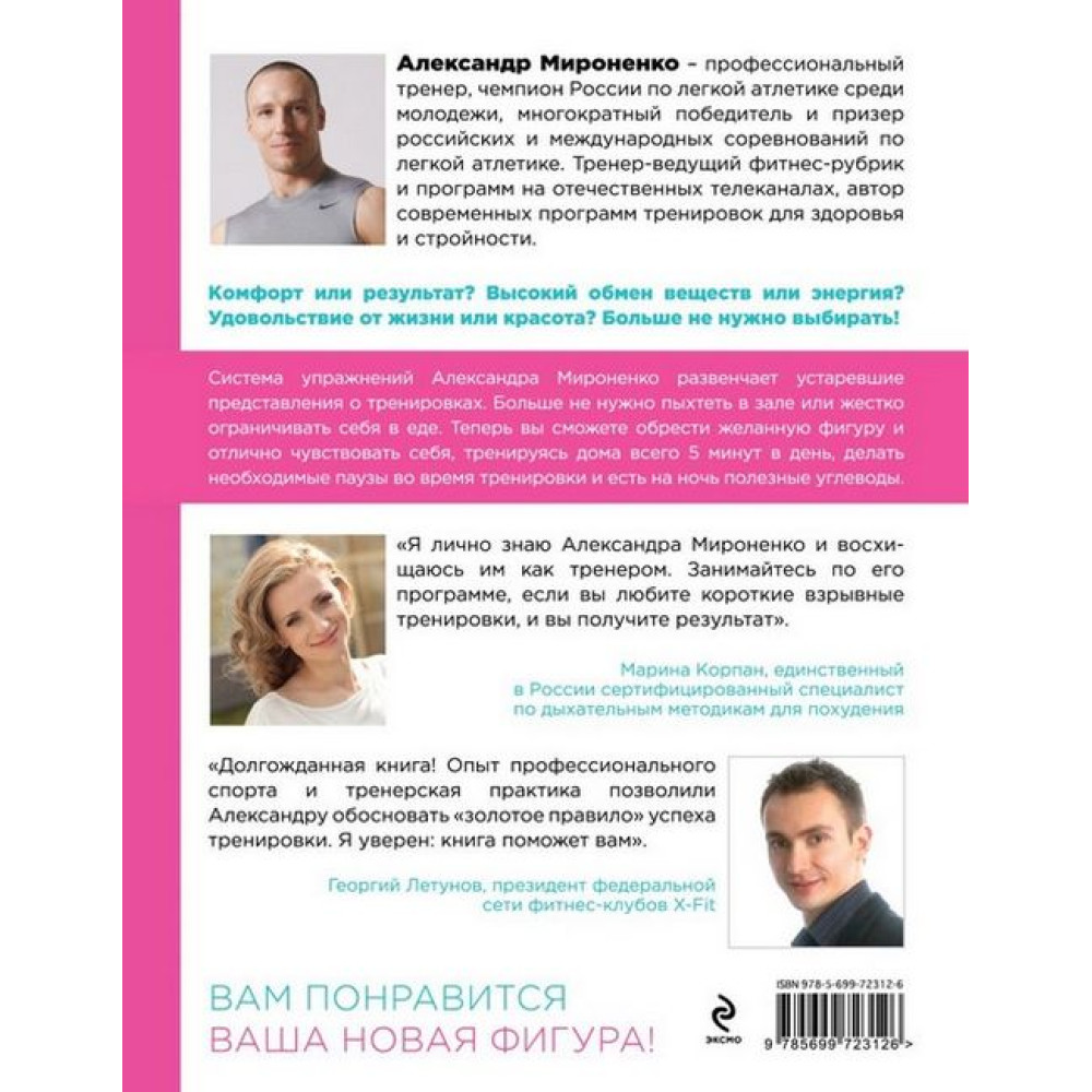 Все мы привыкли думать: чтобы быть привлекательным и полным сил, нужно долго и мучительно тренироваться. Что жир начинает уходить минимум после 20 минут тренировки. Что есть углеводы вредно, а на ночь - и вовсе противопоказано. Система упражнений SUPER 5 Александра Мироненко, тренера, профессионального спортсмена из олимпийской семьи, развенчает устаревшие представления и откроет дорогу в новую жизнь. Жизнь, в которой иметь гармоничное тело и отлично чувствовать себя, тренируясь всего 5 минут в день. Во время тренировки нужно отдыхать. А на ночь необходимо загрузиться полезными углеводами. В основу SUPER 5 легли лучшие классические и современные методики. Теперь они доступны каждому - всем возрастам и уровням подготовки. SUPER 5 - это новая эра для тех, кто готов осуществить свою мечту о красивом, здоровом теле. Завтра начинается сегодня!