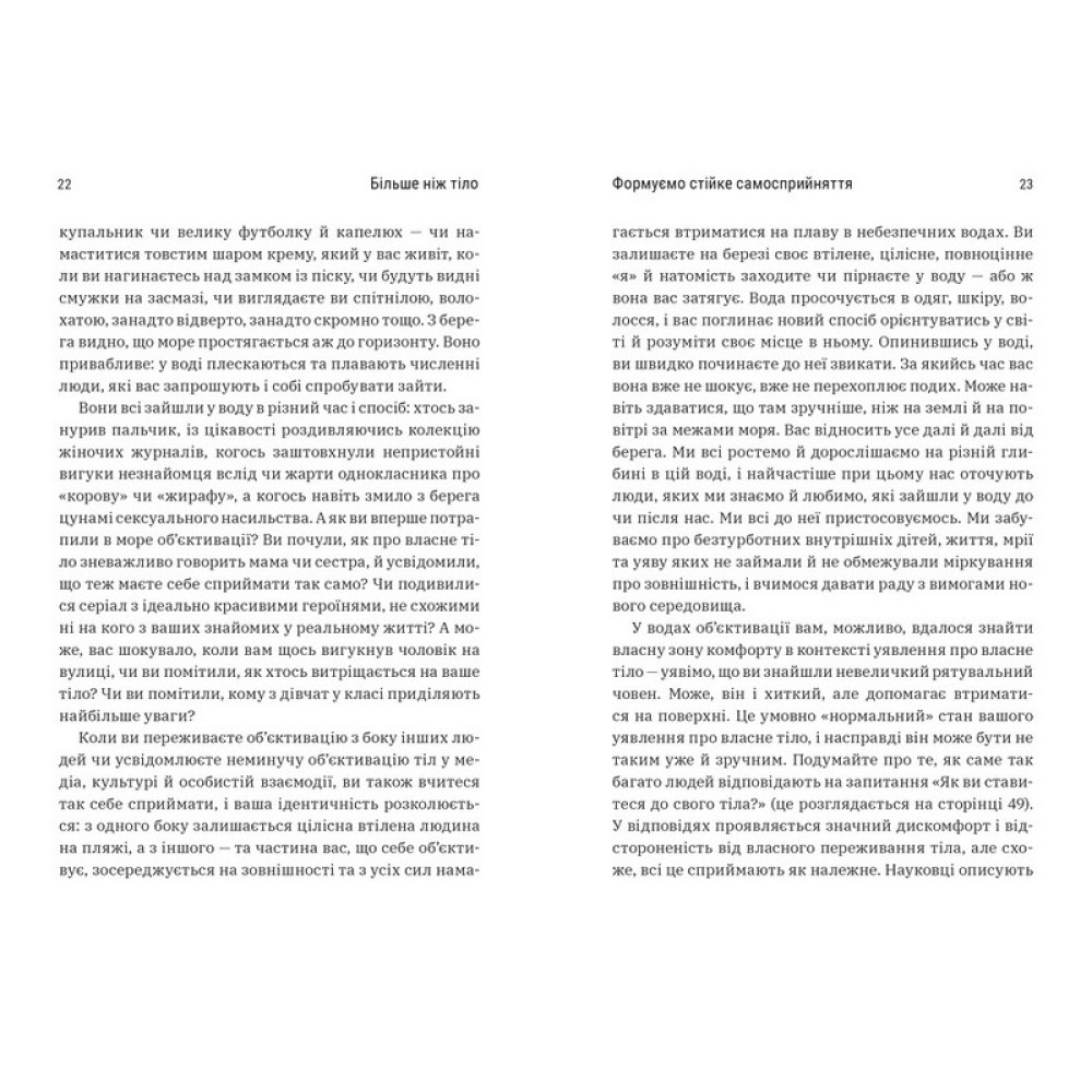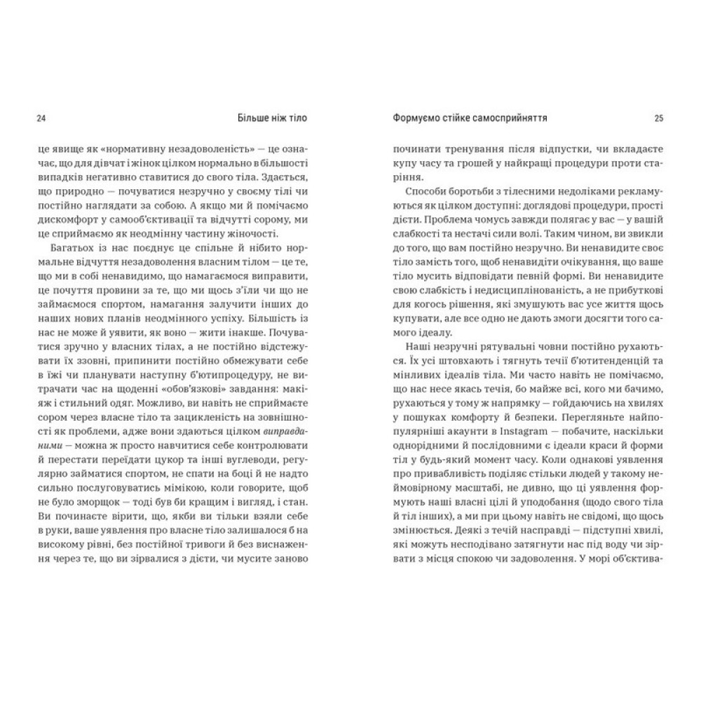 Позитивне уявлення про своє тіло — це не віра в те, що ваше тіло гарне, а хороше ставлення до нього незалежно від його вигляду.Наш одержимий красою світ всіляко просуває ідею, що щастя, здоров’я й те, як ставитимуться до вас люди, залежить від нашої зовнішності. Але сестри-близнючки, докторки Лексі та Ліндсі Кайт, пропонують альтернативне бачення.У своїй книзі «Більше ніж тіло. Ваше тіло — знаряддя, а не прикраса» авторки діляться потужними практичними порадами, які виходять за рамки «бодипозитиву», детально аналізуючи різноманітні фактори впливу: від медіаспоживання до здоров’я і фітнесу, саморефлексії та співчуття до себе. Сестри Кайт демонструють, наскільки згубним може бути вплив самооб’єктивації на наше повсякденне життя. Це ідеальна книжка для тих, хто хоче змінити своє самосприйняття, але не знає, з чого почати.Чому варто придбати:Книжка допоможе налагодити стосунки зі своїм тілом і сформувати його позитивний образ, а також переосмислити ставлення не лише до власного тіла, а й до зовнішнього вигляду інших людей.Історія, що нею діляться авторки, яскраво демонструє негативні наслідки об’єктивації тіла в суспільстві та її вплив і на дорослих, і на дітей та підлітків.«Більше ніж тіло» цілком може стати посібником для батьків, які хочуть допомогти своїм дітям не зважати на стереотипи та полюбити своє тіло й себе.