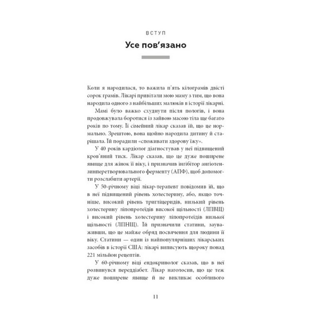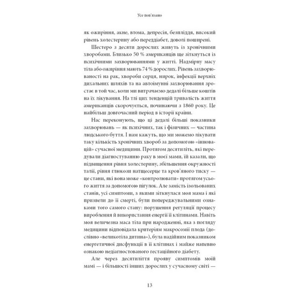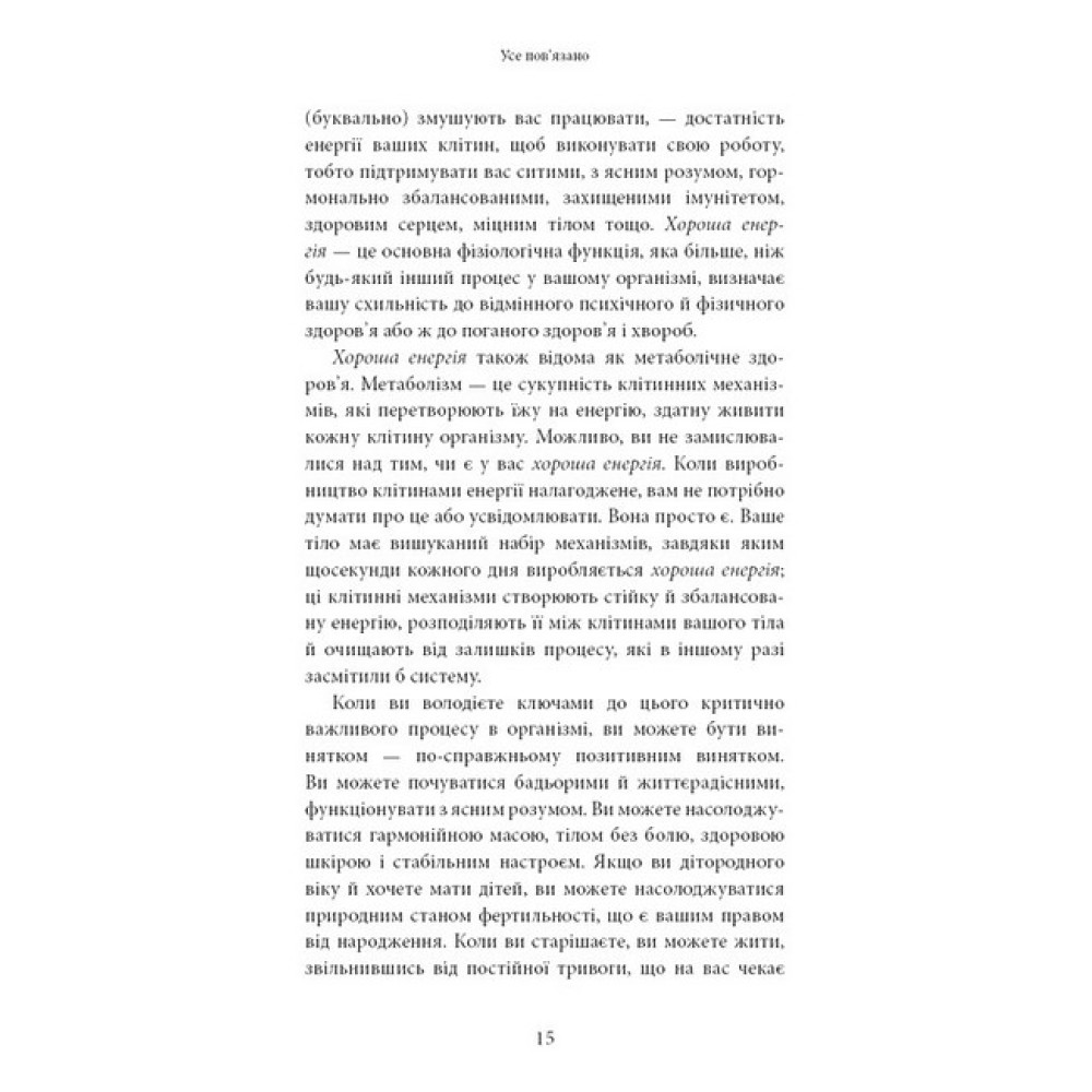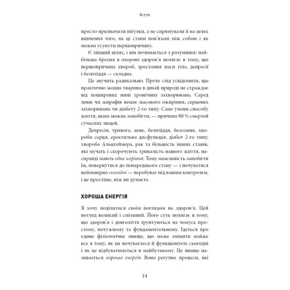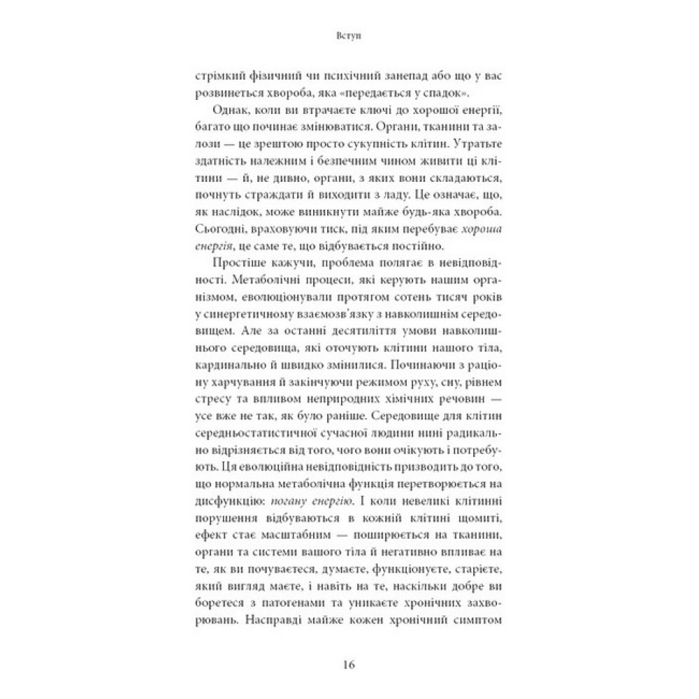 Виявляється, депресія, тривога, безпліддя, безсоння, хвороби серця, еректильна дисфункція, діабет 2-го типу, хвороба Альцгеймера, деменція та багато інших захворювань, які нас виснажують, насправді мають одну й ту саму першопричину. Також виявляється, що ми маємо здатність знайти її і усунути, а відтак запобігти багатьом недугам або позбутися їх. Ключовим, однак найменш дослідженим фактором нашого здоров‘я є метаболізм. Майже кожну проблему зі здоров’ям можна пояснити тим, наскільки добре клітини нашого тіла створюють і використовують енергію. Щоб жити без неприємних симптомів і хвороб, які загрожують життю, нам потрібно, щоб наші клітини отримували оптимальне живлення й могли створювати «хорошу енергію» — важливе паливо, яке впливає на всі аспекти нашого фізичного та психічного благополуччя. Поєднуючи найсучасніші дослідження й особисті історії, авторка пропонує чотиритижневий план, який допоможе відновити баланс енергії у вашому тілі, а відтак забути про багато недуг.