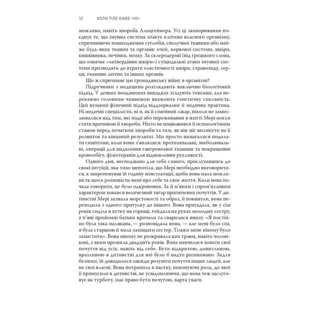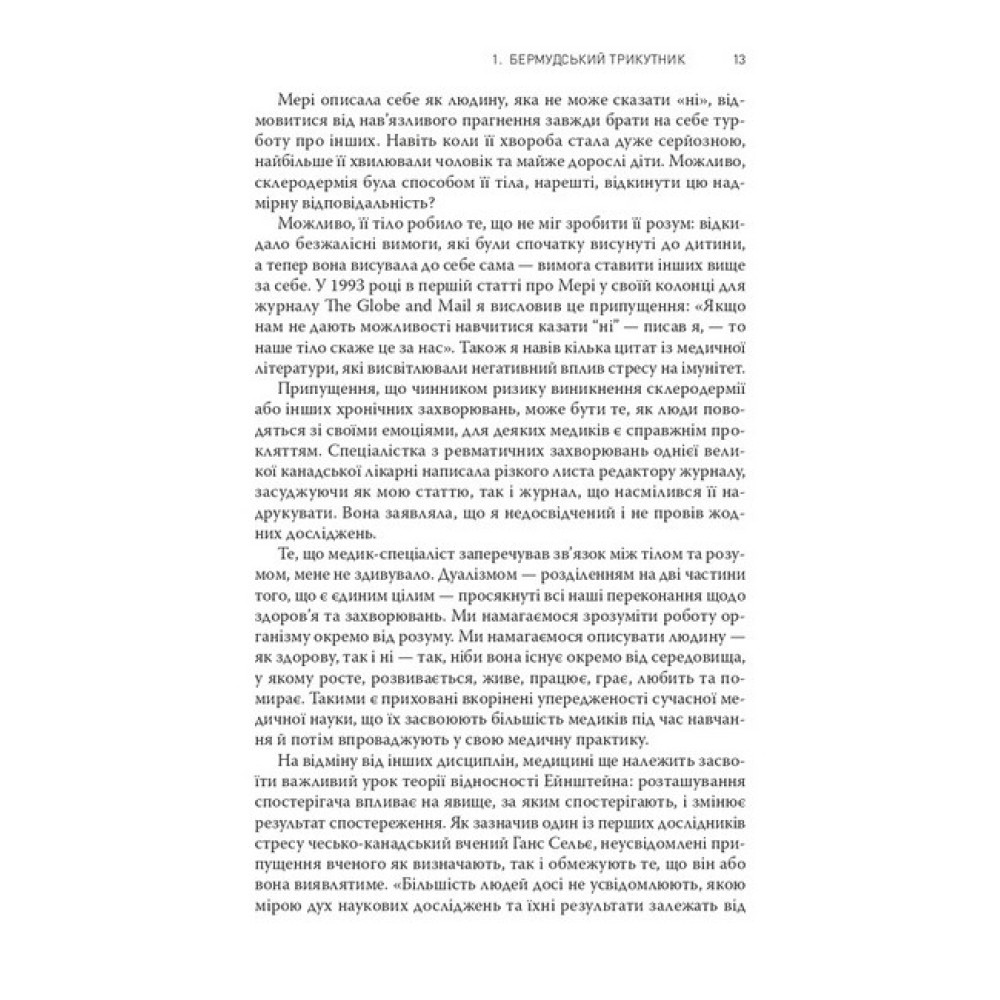 Міжнародний бестселер, перекладений п’ятнадцятьма мовами, вчить і сприяє зціленню, надаючи трансформаційне розуміння того, як за допомогою хвороби тіло може сказати «ні» тому, що розум не може або не хоче визнати.Досліджує роль зв’язку між розумом і тілом у таких станах і захворюваннях як артрит, рак, діабет, хвороби серця, синдром подразненого кишківника і розсіяний склероз.В основі – медичні дослідження та клінічний досвід автора як сімейного лікаря.Дослідження десятків ситуацій та історій, який проливають світло на проблему, зокрема таких людей як Лу Геріг (бічний аміотрофічний склероз), Бетті Форд (рак грудей), Рональд Рейган (хвороба Альцгеймера), Гільда ??Раднер (рак яєчників) і Ленс Армстронг (рак яєчок).Містить сім стовпів зцілення: принципи зцілення та запобігання хворобам від прихованого стресу. Чи може людина буквально померти від самотності? Чи є зв’язок між здатністю виражати емоції та хворобою Альцгеймера? Чи є таке поняття як «ракова особистість»?