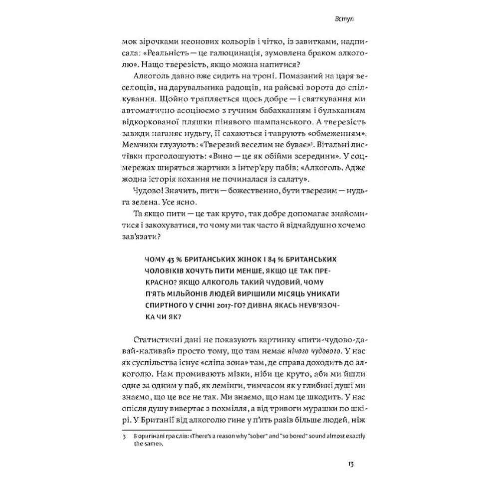 Не кожна людина готова відкрито говорити про свою алкогольну залежність та шлях боротьби з нею. Проте Кетрін Ґрей знайшла у собі сили відверто, невимушено і чесно описала свою гірку історію пияцтва і свій шлях до тверезого життя. У книзі «Несподівана радість тверезості» авторка розвінчує поширений у суспільстві міф про алкоголь як «дарувальника радощів», як «райські ворота до спілкування», що «бути тверезим — нудьга зелена». Кетрін Ґрей розмірковує про суспільний тиск і нав’язування алкогольних традицій, аналізує дослідження провідних нейрологів і психологів про причини нашого тяжіння до алкоголю, заглиблюючись у природу цієї неоднозначної звички та її однозначні впливи на наші мозок і тіло. Спираючись на власний досвід подолання алкогольної залежності, Кетрін Ґрей аргументовано й натхненно пояснює, в який спосіб тверезе життя може виявитися якісно ліпшим, значно цікавішим, багатшим, насиченішим, яскравішим, щасливішим. А втім, лише вам вирішувати, чи обрати цю альтернативну реальність без випивки й втішатися життям без похмілля.