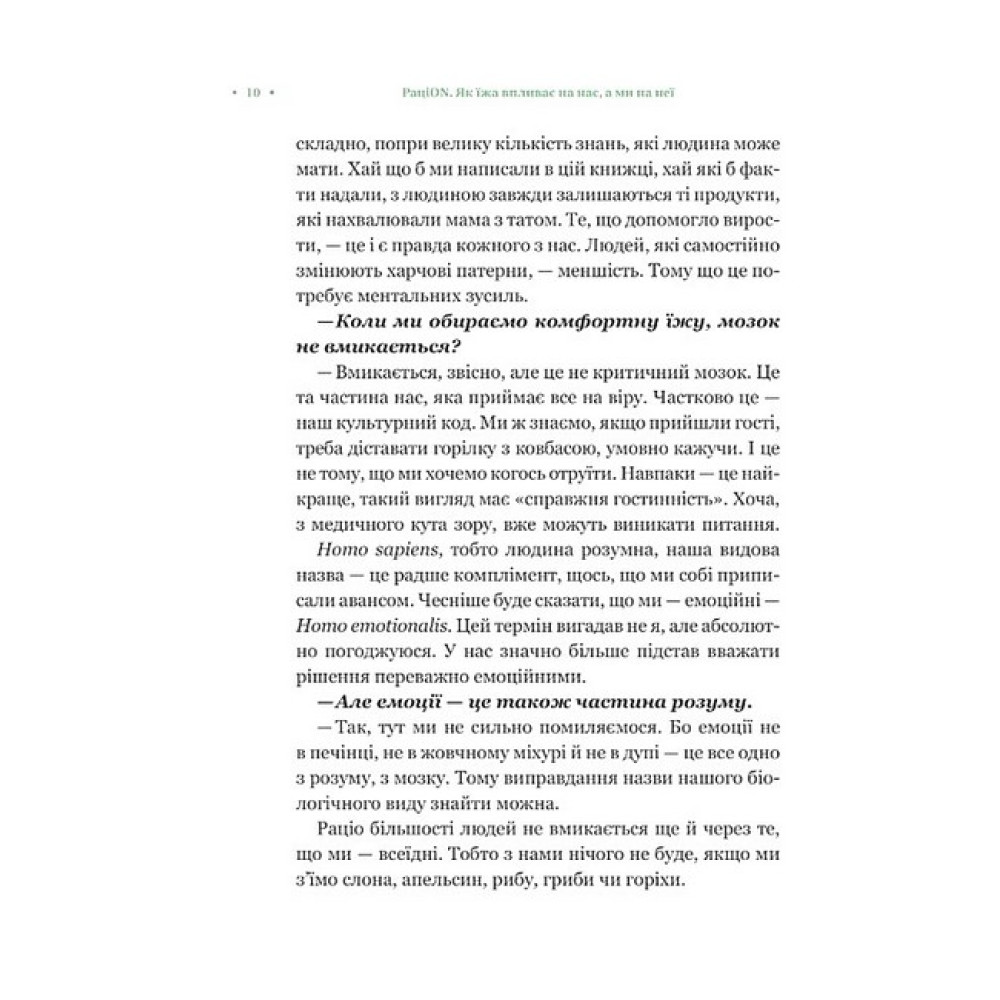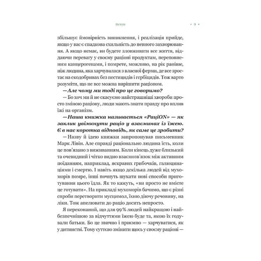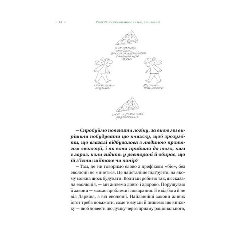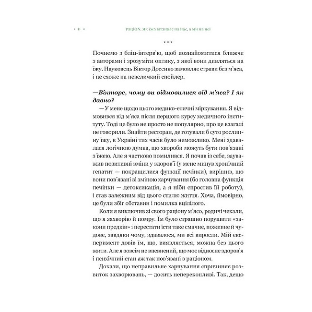 Як часто ми раціонально обираємо, що з’їсти? Які продукти допомогли людству вижити у складних умовах? Чому в Україні людей із непереносністю лактози менше, ніж в інших країнах? Чи правда, що людині еволюційно потрібне м’ясо? І де брати білок, якщо від тваринного таки відмовитися? Ця книжка — розмова професора-патофізіолога, який понад двадцять років досліджує хвороби, і редакторки, яка десять років жила з розладами харчової поведінки. Вони обговорили користь і шкоду для організму кожного продукту і «переклали» наукові обґрунтування простими словами.Книга «РаціON. Як їжа впливає на нас, а ми на неї» — це нонфікшн із нутриціології, створений професором-патофізіологом Віктором Досенком і письменницею й редакторкою Іриною Виговською. Видання проілюструвала художниця Маргарита Вінклер.Перед початком роботи над книгою автори поставили собі завдання: не писати сухою академічною мовою й викладати матеріал у легкому стилі без зайвої науковості. Відтак їхнє напрацювання — це не енциклопедичний огляд системи збалансованого харчування, а радше конструктивний діалог між дослідником і людиною, що тривалий час жила з розладами харчової поведінки. Досенко й Виговська говорять про сутність здорового раціону, окреслюють важливість дієти та аргументують, чому не варто демонізувати їжу або ж діаметрально протилежно — шукати в ній розраду.Книгу відкриває інтерв'ю з авторами, що висвітлює їхні позиції щодо харчування й впливу продуктів на організм.Матеріали доповнюють QR-коди, після переходу за якими можна перевірити написане й поглибити знання з конкретної теми.Наприкінці кожного розділу наведено глосарій з поясненням складних слів і термінів.