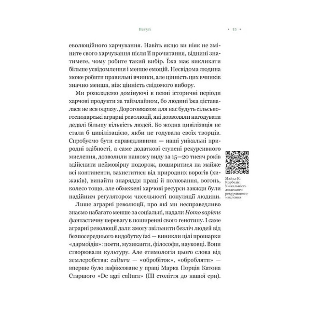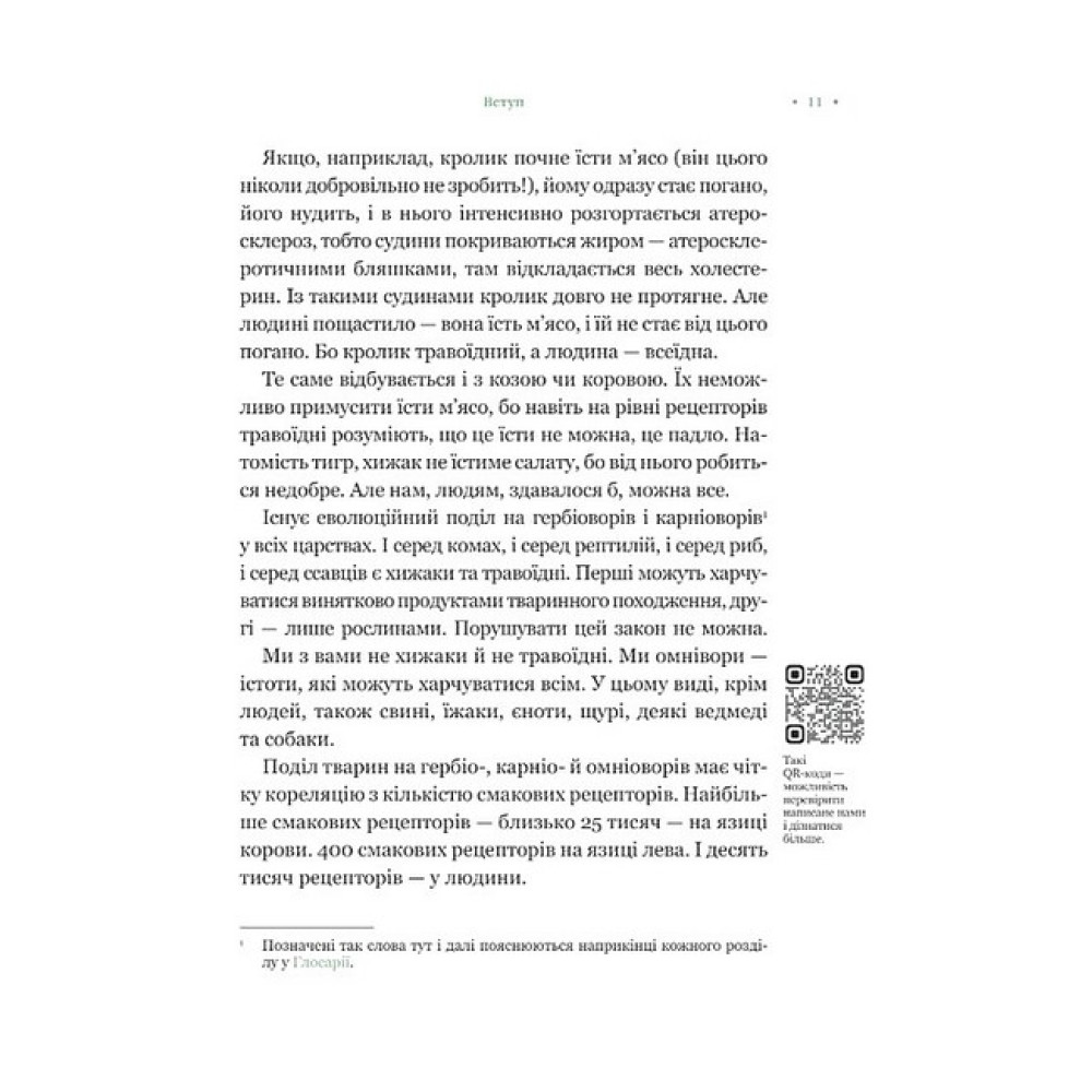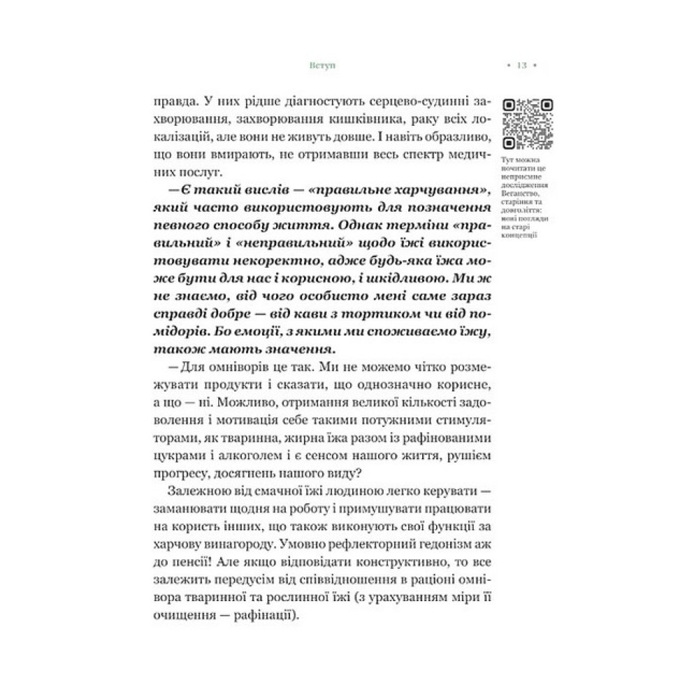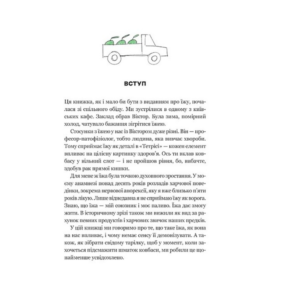 Як часто ми раціонально обираємо, що з’їсти? Які продукти допомогли людству вижити у складних умовах? Чому в Україні людей із непереносністю лактози менше, ніж в інших країнах? Чи правда, що людині еволюційно потрібне м’ясо? І де брати білок, якщо від тваринного таки відмовитися? Ця книжка — розмова професора-патофізіолога, який понад двадцять років досліджує хвороби, і редакторки, яка десять років жила з розладами харчової поведінки. Вони обговорили користь і шкоду для організму кожного продукту і «переклали» наукові обґрунтування простими словами.Книга «РаціON. Як їжа впливає на нас, а ми на неї» — це нонфікшн із нутриціології, створений професором-патофізіологом Віктором Досенком і письменницею й редакторкою Іриною Виговською. Видання проілюструвала художниця Маргарита Вінклер.Перед початком роботи над книгою автори поставили собі завдання: не писати сухою академічною мовою й викладати матеріал у легкому стилі без зайвої науковості. Відтак їхнє напрацювання — це не енциклопедичний огляд системи збалансованого харчування, а радше конструктивний діалог між дослідником і людиною, що тривалий час жила з розладами харчової поведінки. Досенко й Виговська говорять про сутність здорового раціону, окреслюють важливість дієти та аргументують, чому не варто демонізувати їжу або ж діаметрально протилежно — шукати в ній розраду.Книгу відкриває інтерв'ю з авторами, що висвітлює їхні позиції щодо харчування й впливу продуктів на організм.Матеріали доповнюють QR-коди, після переходу за якими можна перевірити написане й поглибити знання з конкретної теми.Наприкінці кожного розділу наведено глосарій з поясненням складних слів і термінів.