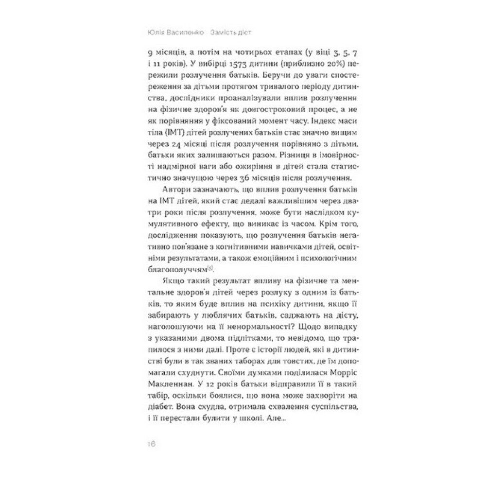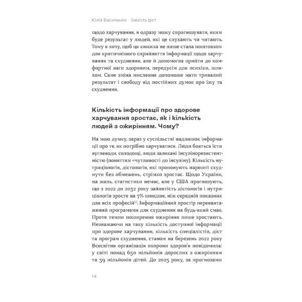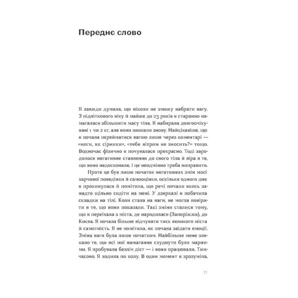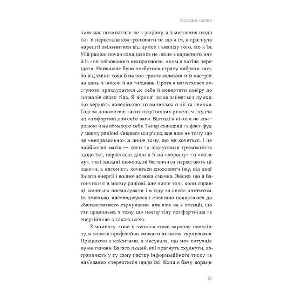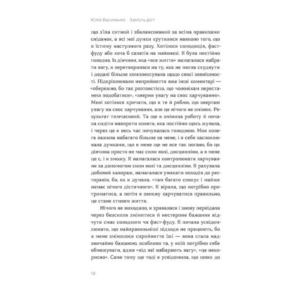 Тобі варто схуднути! Ні, краще набери кілька кілограмів. Увечері — лише салат. Треба їсти більше м?яса. Ніякого солодкого, молочного й забудь про чипси… Довкола так багато інформації про харчування, що, напевне, чи не кожен з нас так чи інакше відчував тривогу в очікуванні вечері. Дієтологиня Юлія Василенко впевнена, що все це можна змінити й харчуватися так, аби прийти до комфортної ваги здоровим, передусім для психіки, шляхом. Мета книжки — змінити мислення щодо того, яким має бути харчування й, головне, ставлення до себе та до їжі. Ця книжка практична. У ній багато завдань, виконуючи які, ви зможете налагодити свої стосунки з їжею. Це книжка для тих, хто хоче схуднути чи набрати вагу, має незбалансований раціон або бажає змінити своє ставлення до їжі та сприйняття власного тіла.