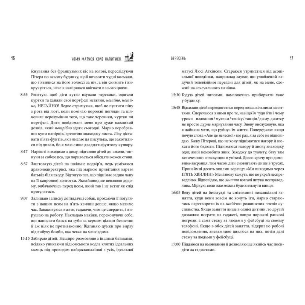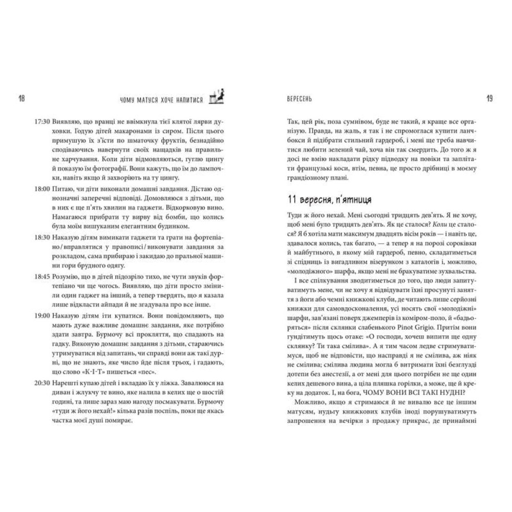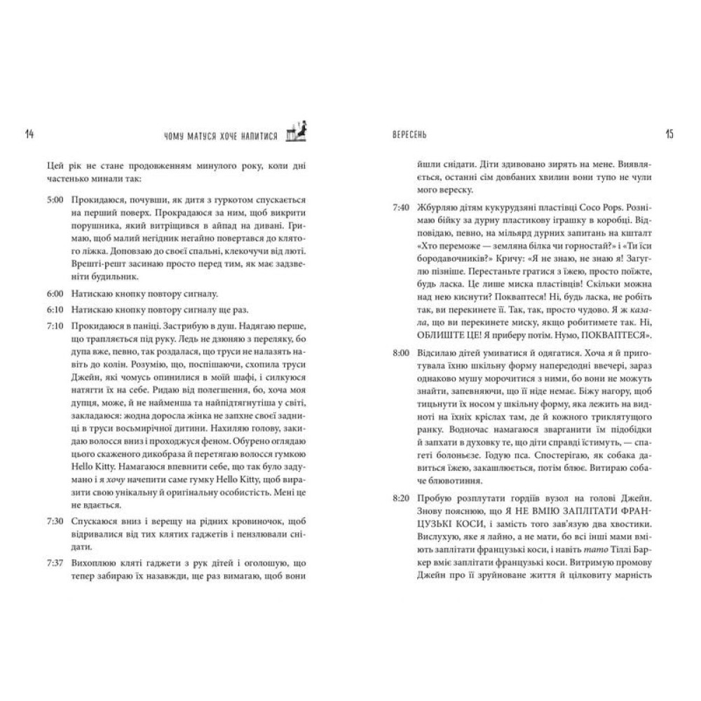 Яка жінка не бажає стати найліпшою матусею для своєї дитини? Проте життя вносить корективи, і ця місія інколи видається майже нездійсненною. Коли чудові плани летять під три чорти, потрібна особлива підтримка. вам теж?Тоді ласкаво просимо до «Клубу виснажених мам» Джилл Сімс!ПРО КНИГУЧому матуся хоче напитися? Тому що кожного дня на неї чекає нове випробування: двоє чудових дітлахів часом перетворюються на чортяк, затишний будинок — на вирву від бомби, коханий чоловік за будь-якої нагоди тікає з хати… додайте до цього пришелепкуватих родичів і кодло ідеальних мамць зі школи — як тут не з’їхати з глузду? Незламна матуся з неперевершеним почуттям гумору іноді укріплює бойовий дух міцним слівцем і не менш міцними напоями. не закликаємо брати її за приклад, але читати обов’язково, адже сміятися корисно для здоров’я!Книжки Джилл Сімс, що увійшли в серію «Щоденник виснаженої мами»: «Чому матуся хоче напитися», «Чому матуся часто матіркує» та «Чому матусю все дістало» — бестселери Sunday Times, а видання, що зараз перед вами, до того ж здобуло премію British Book Awards у номінації «Книжковий дебют року» (2017).Книжка видана за часткової інституційної підтримки у формі гранта від Державної установи «Український інститут книги».ПРО СЕРІЮСерія «Щоденник виснаженої мами» — це три книжки про невгамовну матусю, яка знаходить собі пригоди там, де їх не мало би бути. А якщо мама не може впоратися сама, на допомогу приходять вигадливі діти або ж саркастично налаштований чоловік. Тільки завдяки невиліковному оптимізму, матусі вдається зберегти внутрішню рівновагу... Чи не вдається? Уся правда про сімейне життя у трилогії «Чому матуся хоче напитися», «Чому матуся часто матіркує» і «Чому матусю все дістало».ПРО АВТОРАДжилл Сімс — письменниця й ілюстраторка. Живе в Шотландії зі своїм чоловіком, двома дітьми і двома непокірними бордер-тер'єрами, які господарюють у будинку.Джилл — авторка надзвичайно успішного блогу для батьків Peter and Jane на Facebook.Дотепні нотатки про будні типової мами забезпечили її майже 400 тисячами підписників. Це спонукало Джилл написати книжку «Чому матуся хоче напитися» та її продовження: «Чому матуся часто матіркує» і «Чому матусю все дістало». Романи стали бестселерами The Sunday Times, а перша частина здобула премію The British Book Awards 2017 у номінації «Книжковий дебют року».Любить зависати в соціальних мережах, пити вино і постійно намагається повернути втрачену молодість.