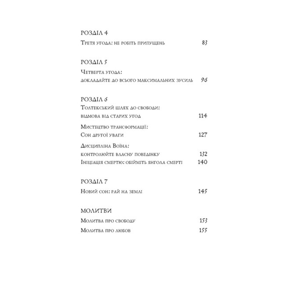 Книга «Чотири угоди» — це не посібник з ведення ділових перемовин, а радше збірка настанов із ведення перемовин зі своїм «Я». Це книга-мантра, що понад 20 років лишається на гребні популярності серед тих, хто перебуває у пошуках себе і прагне віднайти гармонію зі світом.Основні практики толтекської філософії, які вправно описав дон Міґель Руїс, не лише зцілять вашу душу, а й сприятимуть налагодженню контакту зі світом і не надто досконалим суспільством, заручниками стигматів якого ми є. Це спроба змінити себе і разом із тим навчитися не приймати недоліки інших на власний карб. Це медитація в глибині нашого «Я», що сприятиме віднаходженню себе як у неохопному світі, так і в собі.Про автораДон Міґель Руїс — автор бестселерів «Чотири угоди», «Чотири угоди-супутники», «Майстерність кохання», «Голос знання», «Вогняне коло» та «П’ята угода». Вчення Руїса найбільш відомі тим, що він перетворює складні людські проблеми на простий здоровий глузд — цей талант приніс йому мільйони шанувальників і міжнародне визнання.