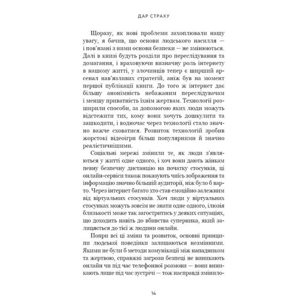 Виживання тварин і наших предків — мавп ґрунтувалося не на аналізі й обмірковуванні можливих загроз, а на інтуїтивному зчитуванні геть незначних для розуму сигналів і миттєвій інстинктивній реакції. З розвитком мозку, раціонального мислення, аналітичних здібностей і технологій людина поступово втрачала здатність чути свою інтуїцію й діяти так, як підказують досвід поколінь і тваринна реакція.У книзі «Дар страху» автор пропонує повернутися до інстинктів, покликаних уберегти наше життя, й спирається на свою багаторічну роботу охоронця, а згодом — власника фірми, що займається охороною особливо важливих осіб: політиків, бізнесменів, видатних людей. Найголовніший ключ до самозахисту — довіряти власній інтуїції. Книга «Дар страху» розповідає, як цьому навчитися.