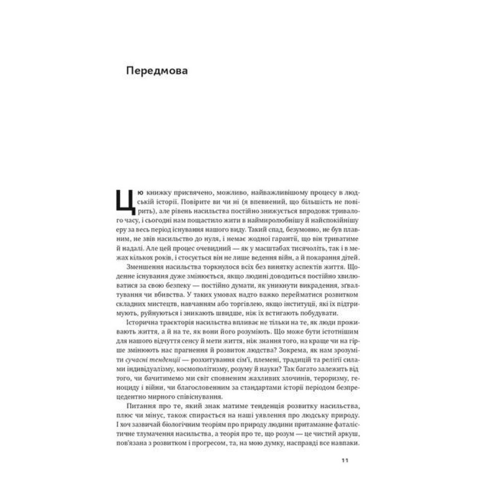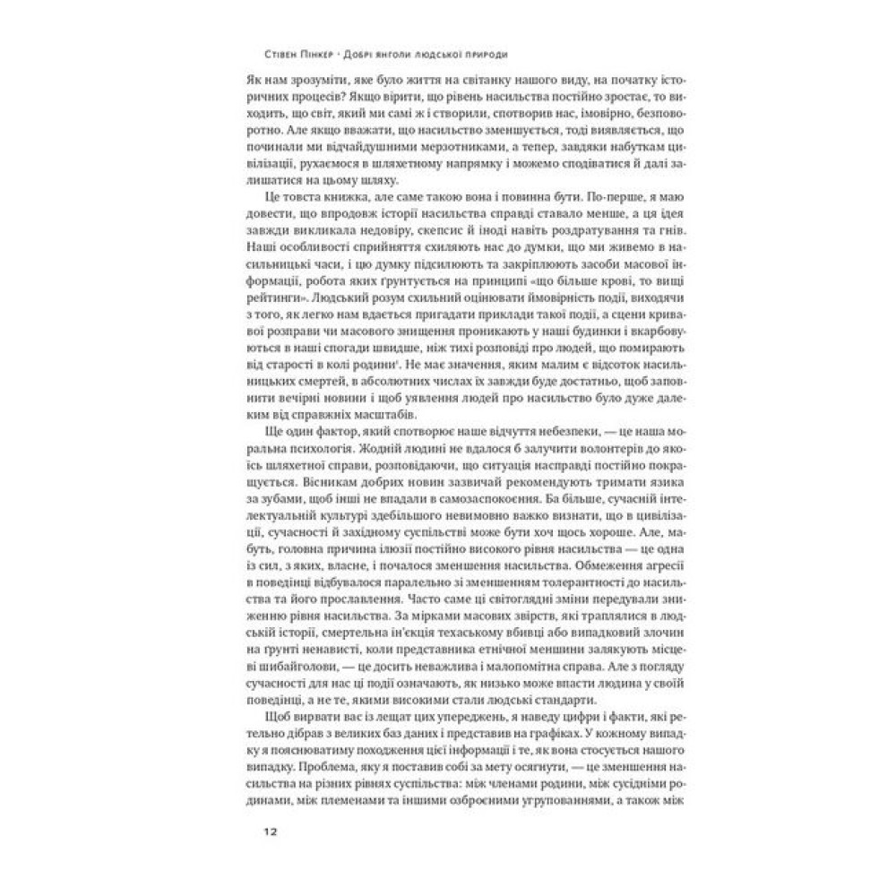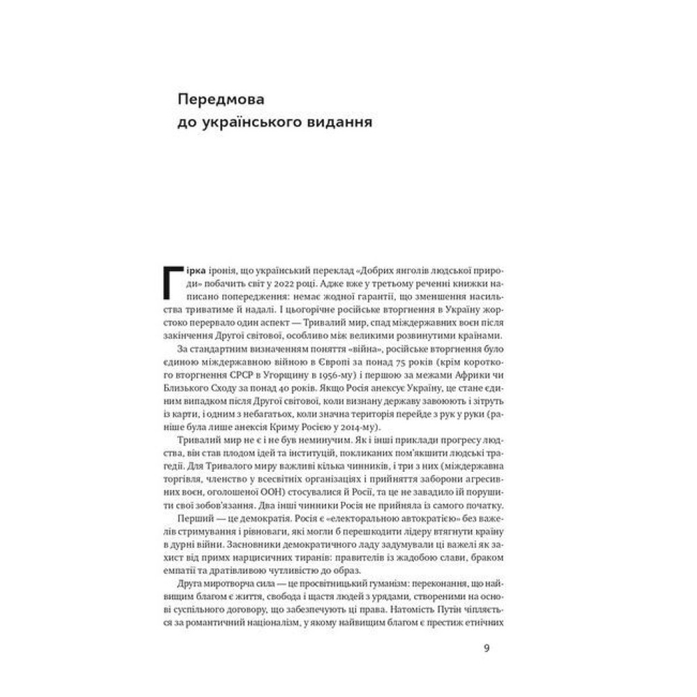 Як рівень насильства зменшується і міняє людську природу. Чому люди воюють? А завдяки чому мирно співіснують?Це питання-антагоністи, але на кожне є відповідь. До першого причетні демони людської природи: хижацьке насильство, домінування, помста, садизм та ідеологія. Візьмімо Троянську війну, розп’яття на хресті, сюжет «Ромео і Джульєтти», російські пошуки «нацистів» в Україні — за всім стоїть лихе в людській природі.Ангелами ж є емпатія, самоконтроль, моральність та раціональне мислення — те, що утверджує цінність життя і свободи.Як ці протилежності проявлялися в історичній перспективі і хто взяв гору? Завдяки чому 75 років у Європі фактично не було міждержавних війн? Автор зібрав соціологічні дані та знання з психології, щоб розповісти про криваву історію та фактори, що допомагають утверджувати мир. А в новій передмові до українського читача Пінкер спонукає подумати, де та які механізми не працюють і що потрібно зробити, аби повернутися до Тривалого миру.У березні 2022 року автор дописав спеціальну передмову до українського видання. У ній ідеться про те, як путінський режим приніс міждержавну війну в Європу та як повернутися до миру.Стівен Пінкер— популяризатор науки, лінгвіст, когнітивіст і професор Гарвардського університету. Кілька років входив у рейтинг топ-100 світових мислителів за версією журналу Foreign Policy. Автор низки книжок, зокрема «Просвітництво сьогодні», «Мова як інстинкт», «Як працює мозок», «Чистий аркуш».
