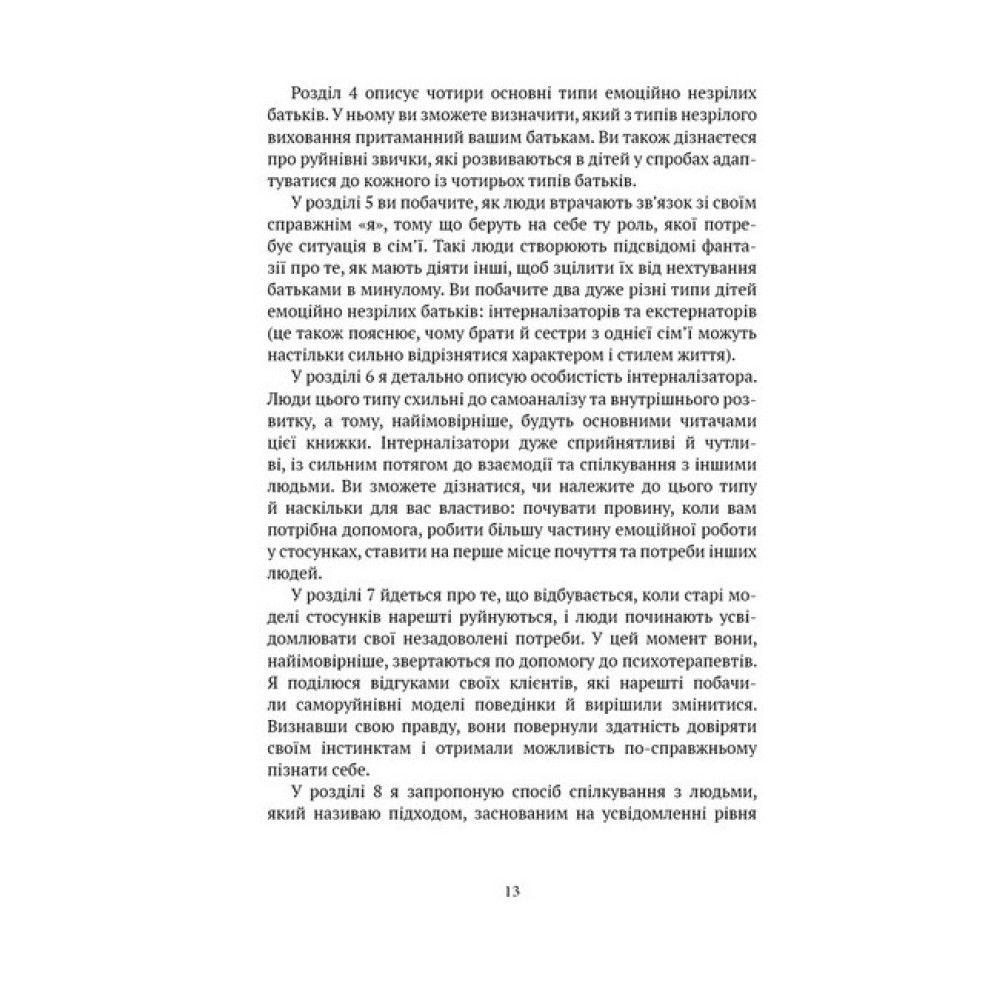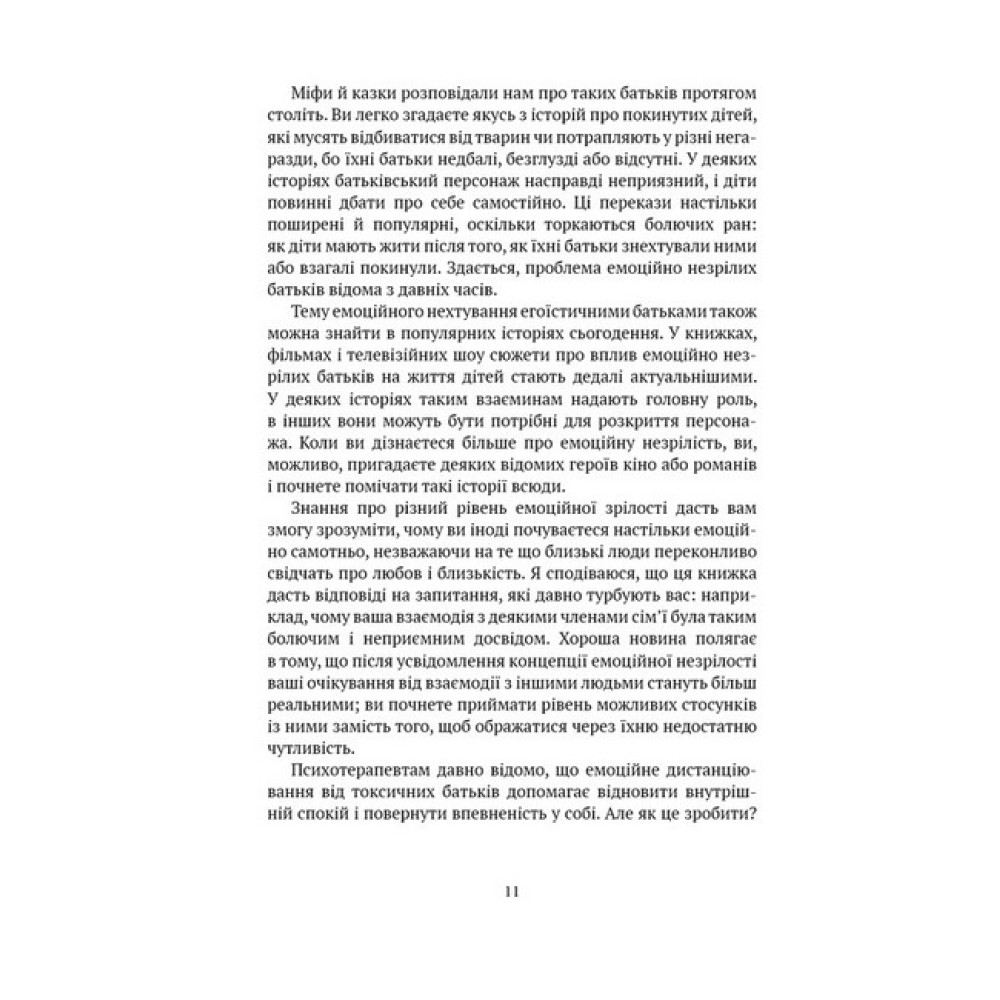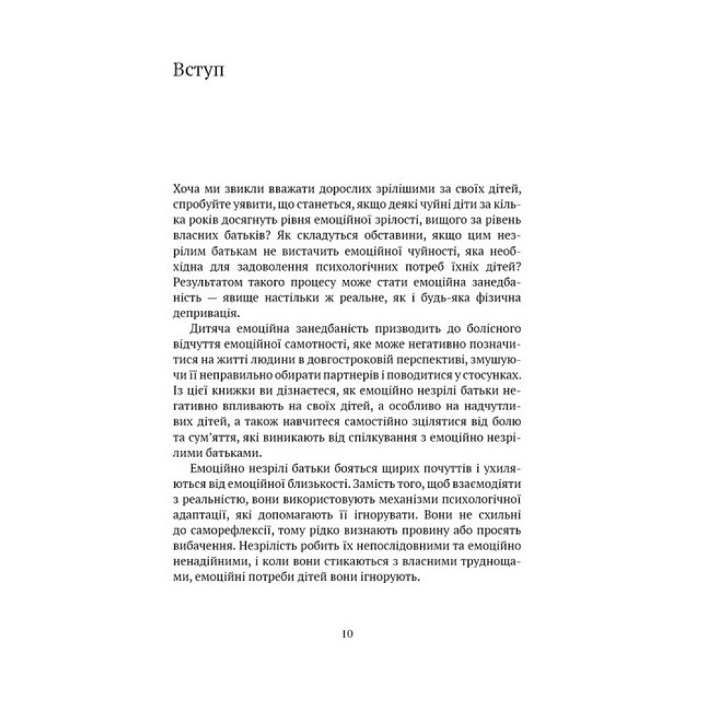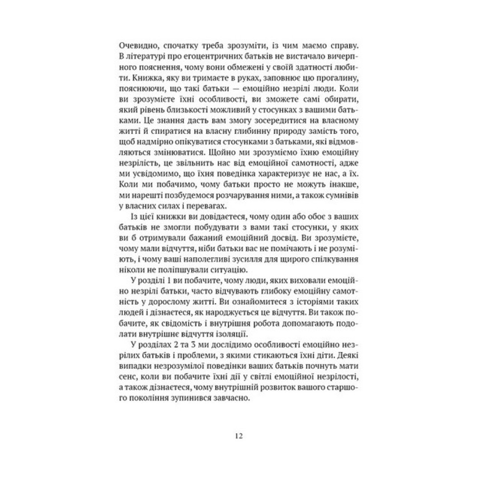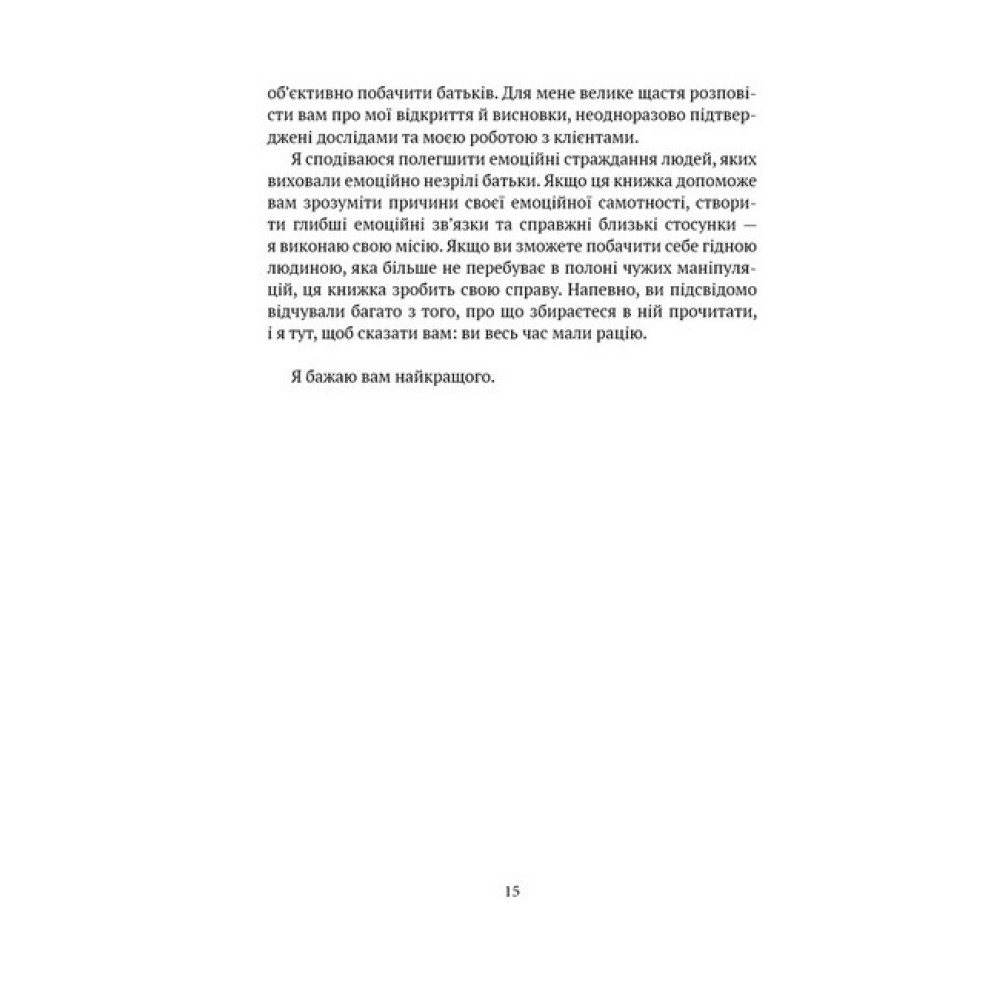 Якщо ви виросли поруч з емоційно незрілими батьками, вам знайомі постійні відчуття самотності або невпевненості у власних силах. Подумки ви знову й знову повертаєтеся в дитинство і відчуваєте, як близькі нехтують вашими емоційними потребами та ігнорують ваші почуття.Можливо, ви зарано стали поводитися, як доросла людина, яка більше не потребує емоційної допомоги. Або ви саме зараз знаходитеся в токсичних стосунках з емоційно незрілою людиною і прагнете зрозуміти, як бути далі.Про авторку:Ліндсі К. Гібсон - .клінічна психологиня, докторка психологічних наук.Ліндсі веде приватну практику, спеціалізується на індивідуальній психотерапії дорослих, які мали емоційно незрілих батьків. Також вона викладала на кафедрі психології у дослідницькому державному університеті Вільгельма та Марії (Вірджинія) — найстарішому університеті США після Гарварду — та в дослідницькому університеті Старого Домініону (Вірджинія).Ліндсі Гібсон написала чотири книжки: «Ким ви мали стати», «Дорослі діти емоційно незрілих батьків», «Зцілення від стосунків з емоційно незрілими батьками» та «Як подбати про себе дорослим дітям емоційно незрілих батьків».Як емоційно незрілі батьки впливають на життя дорослих дітей.Як розпізнати емоційно незрілих батьків.Що відчувають діти у стосунках з емоційно незрілими батьками.Чотири типи емоційно незрілих батьків.Як різні діти реагують на емоційно незріле виховання.Як це — бути інтерналізатором.Криза, що допомагає прокинутися.Як припинити потрапляти в пастки емоційно незрілих батьків.Життя без ролей і фантазій.Як розпізнати емоційно зрілих людей.