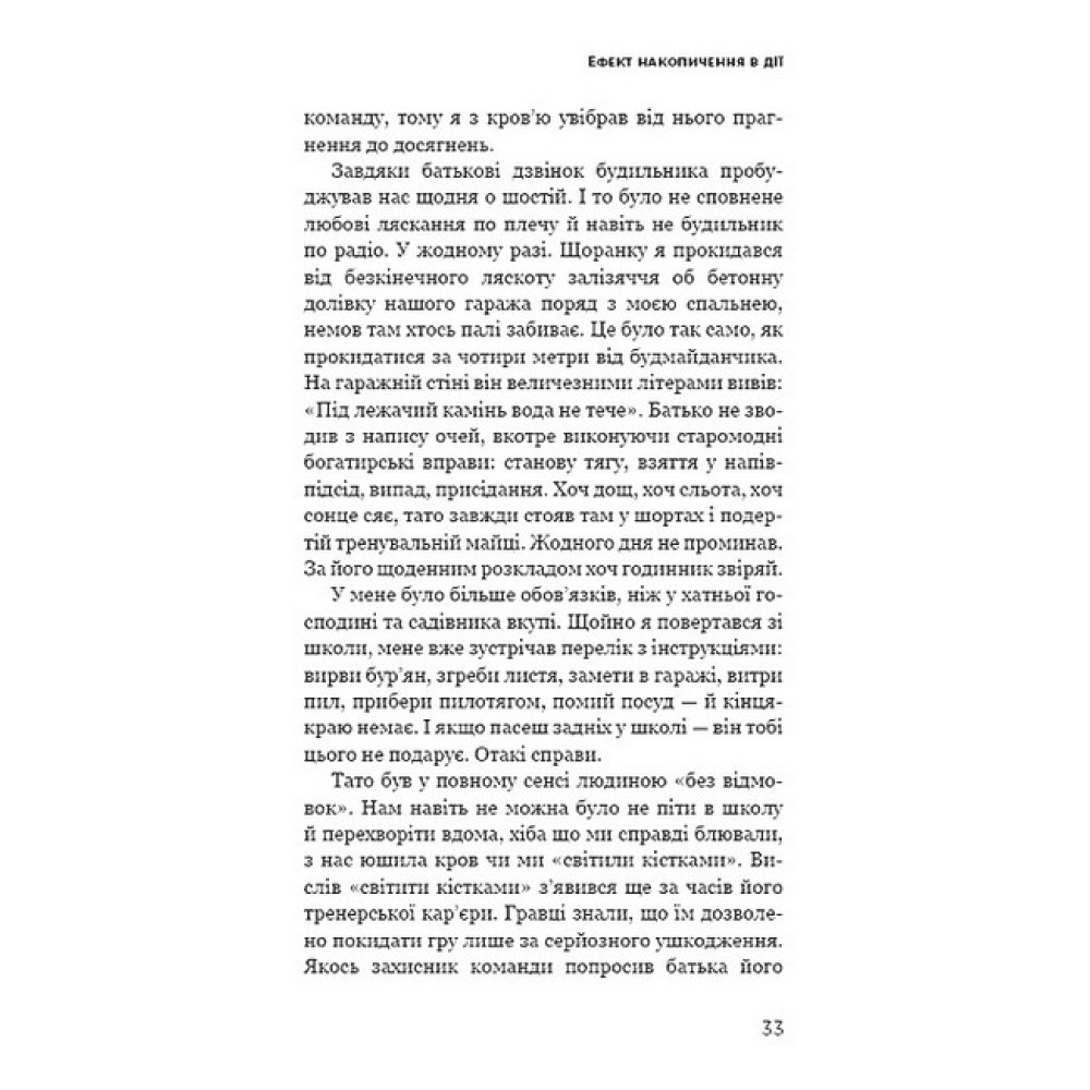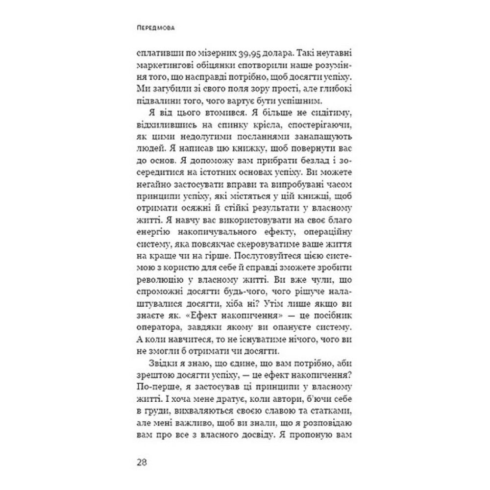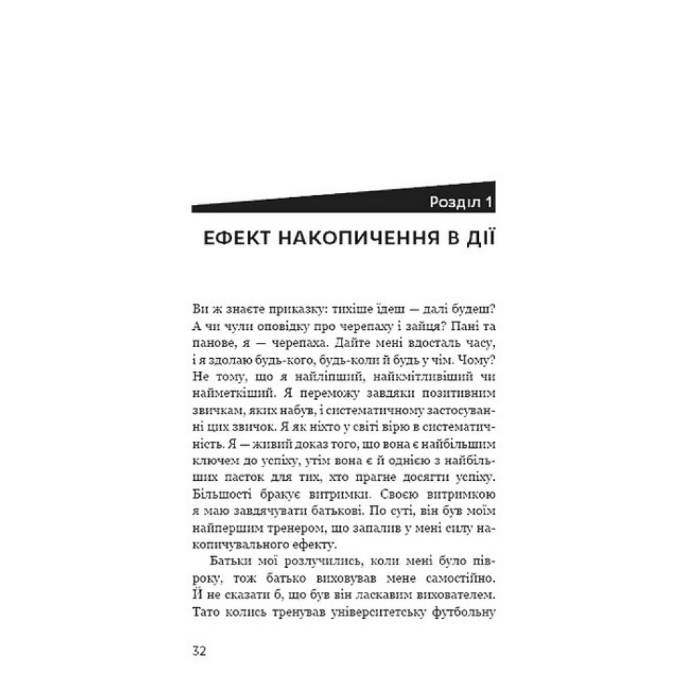 Жодних трюків. Ані дрібки перебільшень. Ніякої магії. Ефект накопичення ґрунтується на простому принципі: наші рішення визначають нашу долю. Маленькими повсякденними кроками ви дійдете або до бажаного життя, або до масштабної катастрофи. Даррен Харді вивів квінтесенцію фундаментальних принципів, які посприяли найфеноменальнішим досягненням у бізнесі, стосунках і не лише. Цю просту систему становить покрокова інструкція, дотримання якої посприяє примноженню вашого успіху, складанню графіка прогресу й досягненню будь-чого. Якщо ви серйозно налаштовані жити незвичайним життям, застосовуйте силу ефекту накопичення, щоб досягнути бажаного.