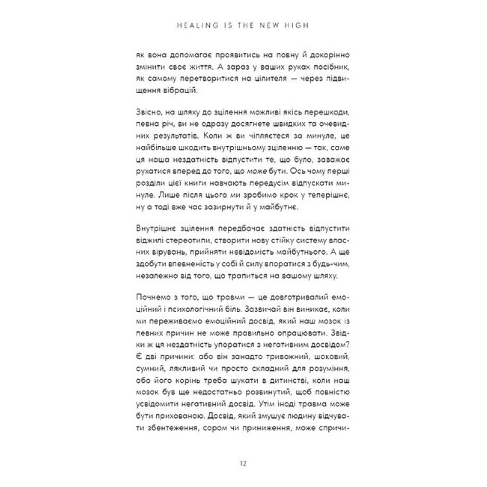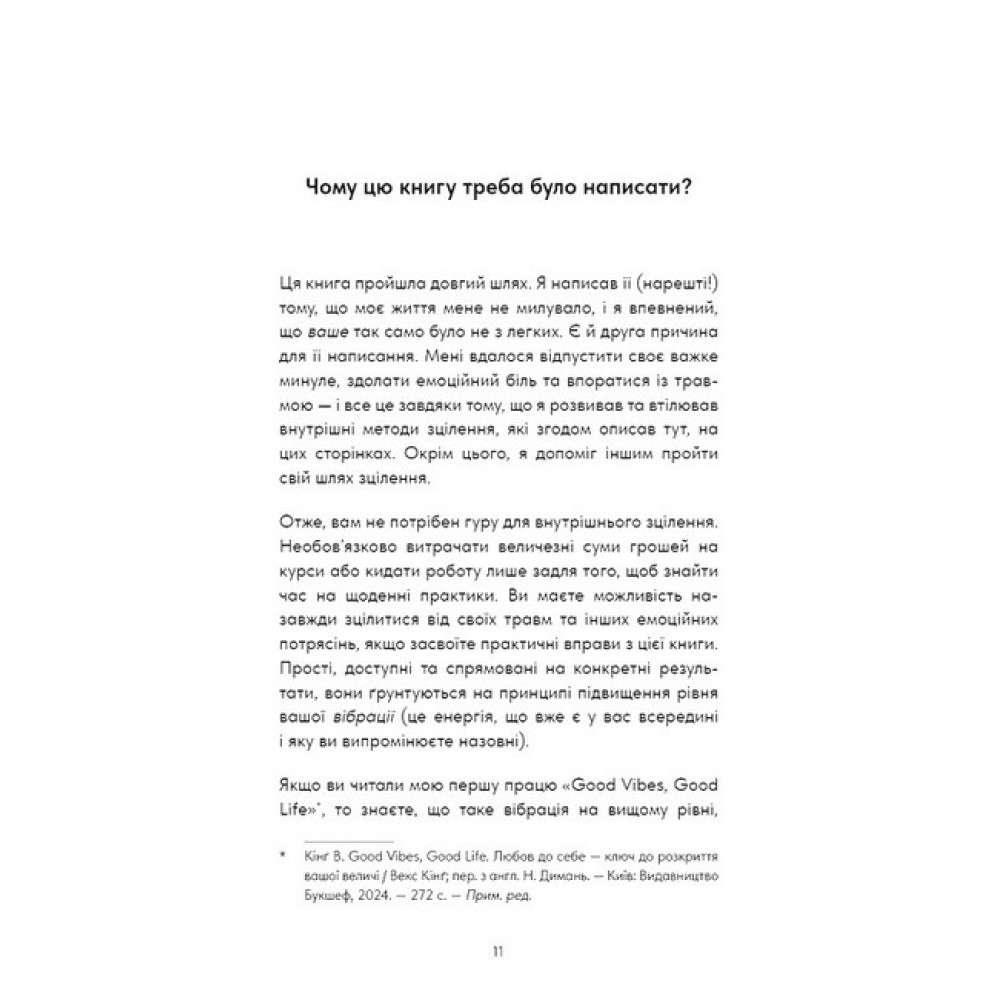 Векс Кінґ, автор бестселера «Good Vibes, Good Life», у цій книзі описує дієві методи внутрішнього зцілення, які допомогли йому звільнитися від проблемного минулого, позбутися свого емоційного болю і травм та створити нову систему переконань, що змінює життя. Відтоді він допоміг тисячам людей по всьому світу здійснити власну подорож до зцілення і тепер пропонує читачам стати цілителями для самих себе. Автор пояснює, як відчути зцілення, пройшовши крізь усі рівні самосвідомості, для чого поєднує принципи йоги й прості, доступні техніки, які дають виняткові та тривалі результати.