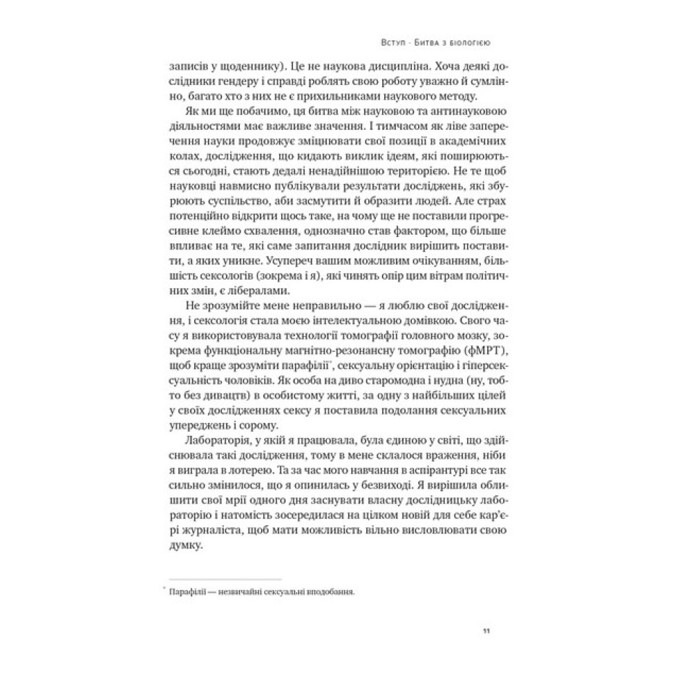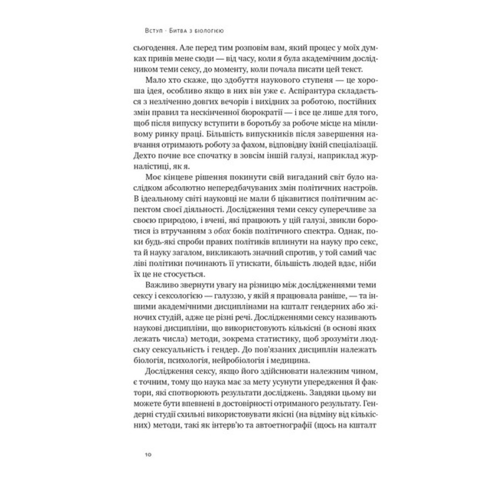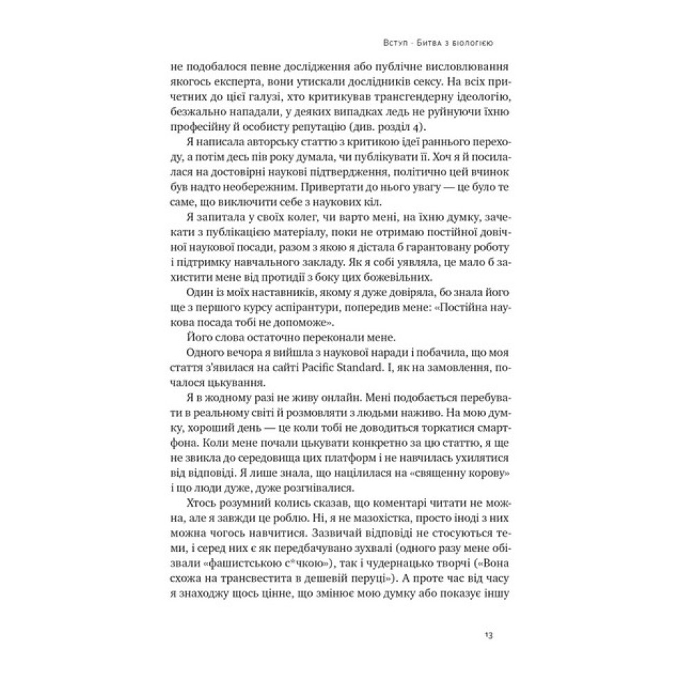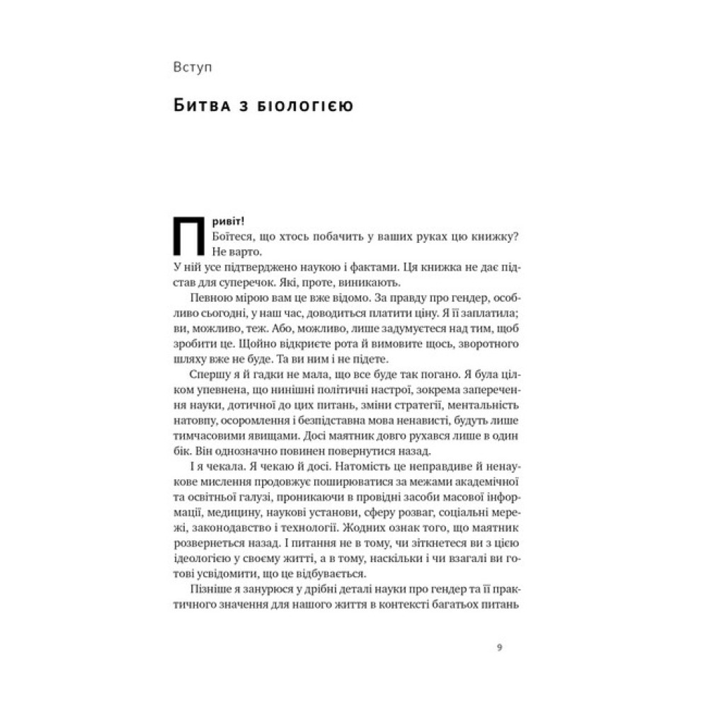 Існує лише дві статі — чоловіча і жіноча. Чоловіки відрізняються від жінок. Ці та подібні постулати, які, здавалось би, ще вчора вважалися очевидними істинами, сьогодні багатьма ставляться під сумнів і вважаються застарілими. Дослідження статі, гендеру та сексуальної поведінки перетворилися із суто наукової діяльності на сферу політичної боротьби, а гендерна ідеологія стала певним культом. У своїй провокативній книжці нейробіолог та сексолог Дебра Со розвінчує популярні міфи про стать і гендер, що просуваються в сучасному суспільстві, — зокрема й ті, які стосуються виховання дітей. Авторка також звертає увагу на те, як гендерна ідеологія на Заході придушує академічну свободу, та й свободу висловлювань загалом, адже ставити дозволяється лише політкоректні запитання, які не ображатимуть почуттів та переконань окремих вибраних груп. Однак факти залишаться фактами і ніколи не переважать ідеологічних уподобань.Ця книжка не лише розвінчує поширені міфи, що стосуються питань статі, гендеру та сексуальної поведінки, а й розкриває методи, якими сучасні ЗМІ, навчальні заклади та академічні установи поширюють їх. Про авторку Дебра Со — нейробіолог, спеціалізується на питаннях гендеру, статі та сексуальної орієнтації. Доктор нейробіології Йоркського університету в Торонто. Працювала академічним дослідником упродовж одинадцяти років. Дописує для Quillette, Los Angeles Times, Wall Street Journal та інших ЗМІ.