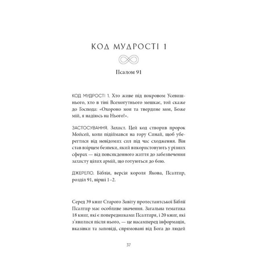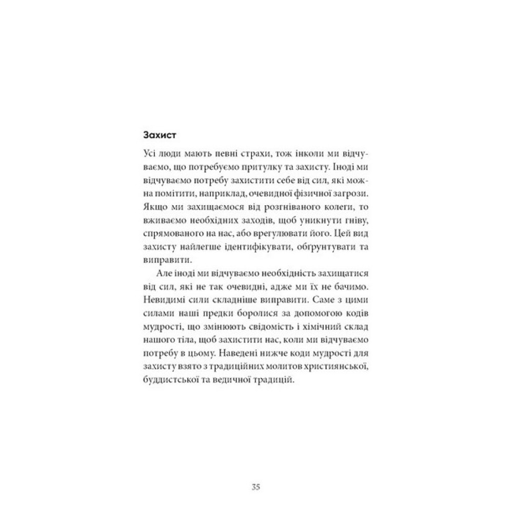 Нові відкриття в біології та нейронауках свідчать, що структура мови — слова, які ми промовляємо подумки й уголос, — може змінити спосіб зв’язку нейронів у нашому мозку, таким чином переспрямувавши психічну енергію. Але наші предки розуміли цей зв’язок інтуїтивно вже тисячі років тому. Вони створили конкретні шаблони зі слів та фраз, щоб забезпечити собі комфорт, зцілення та внутрішню силу у важкі часи, і закодували ці потужні слова в молитвах, піснеспівах, мантрах, гімнах і священних писаннях, щоб зберегти їх для майбутніх поколінь. Ґреґґ Брейден досліджує і розгадує ці коди. Він зібрав книгу із важливих і потужних висловів. Кожен код мудрості на основі цитати, уривка зі святих книг чи притчі супроводжується коротким обговоренням того, що саме він означає, чому він важливий і як застосувати його у своєму житті.