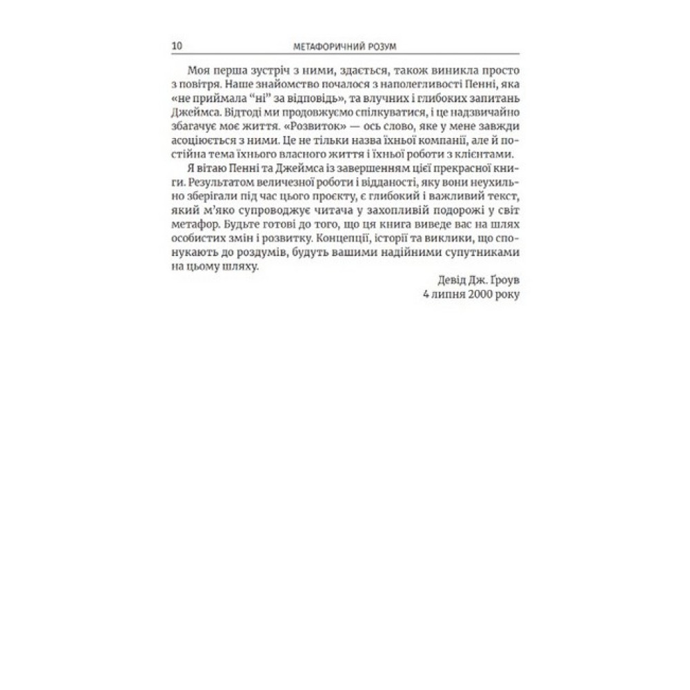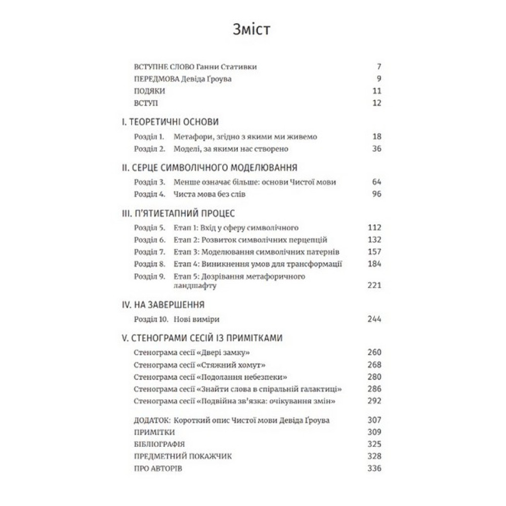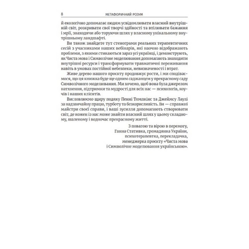Метафори — лише художні вислови або ж інструмент вирішення психологічних проблем? Як розвинути метафоричний розум, якщо ви клієнт або ж психотерапевт? Джеймс Лаулі та Пенні Томпкінс є співрозробниками Символічного моделювання та психотерапевтами-практиками. Як інструмент у своїй роботі вони використовують запитання «Чистої мови» — ключ до ефективної роботи у терапії, який допомагає клієнтам розвинути їхні метафори. У книжці автори використовують стенограми власних сесій, зокрема з клієнтами, які зазнали травматичного воєнного досвіду за період повномасштабної війни в Україні, що лише підвищує актуальність описаної теми для сучасних психотерапевтів.