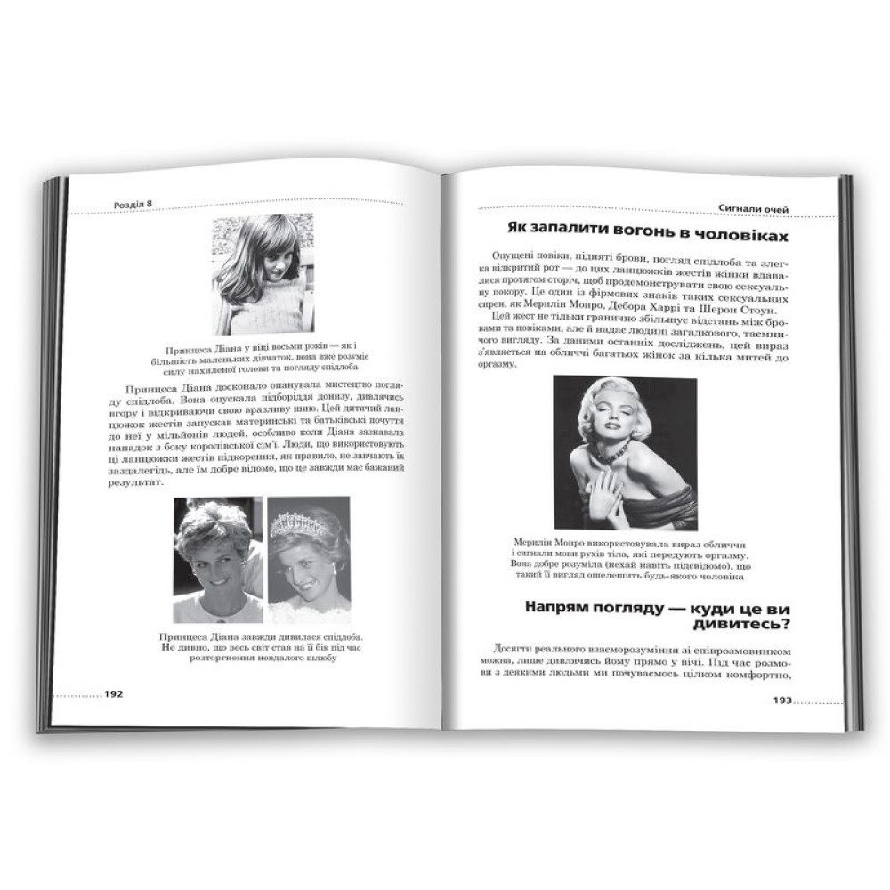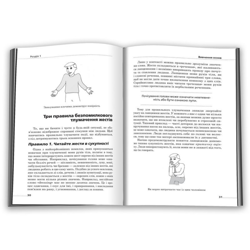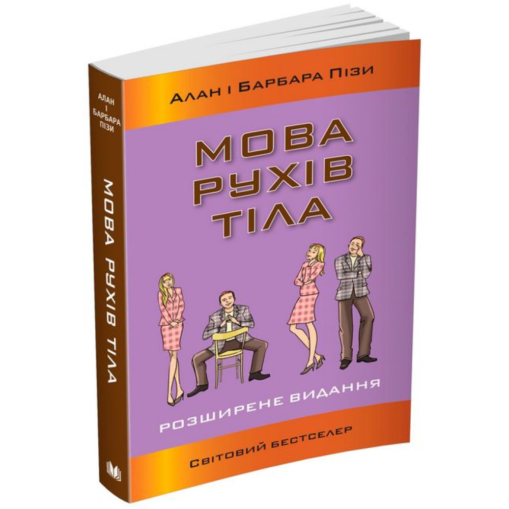 Читати людину як книгу, обирати правильну тактику поведінки і відчувати себе впевнено та невимушено у будь-якій обстановці тепер цілком реально та доступно для кожного. Не дозволяйте собою маніпулювати. Вивчайте нову, сучасну версію мови рухів тіла і ви неодмінно досягнете успіху у всьому! Алан і Барбара Пізи, експерти в галузі комунікації, дослідники мови рухів тіла й автори багатьох всесвітньовідомих бестселерів, навчать вас читати думки, а, отже, передбачати наміри оточуючих по їхнім жестам, міміці та позам. Здобуті у цій книзі знання та навички допомагатимуть вам за будь-яких обставин почуватися впевнено і невимушено, оскільки ви знатимете, що насправді думають чи мають на меті ваші співрозмовники. Вивчайте мову рухів тіла, і ви неодмінно досягнете успіху в особистому, дружньому і діловому спілкуванні, під час прийняття важливих рішень. Жоден жест не залишився без уваги! Міміка, пози, манери, погляд - у цій книзі повна розшифровка всіх рухів тіла, через які можна легко розгадати справжні почуття, наміри та думки інших людей. -Як рукостискання використовується для отримання контролю над співрозмовником. - Які найбільш поширені жести брехунів. - Як дізнатися, які у людини приховані наміри через позу її ніг. - Які найбільш поширені чоловічі та жіночі жести та сигнали для утримання уваги. - Які секретні сигнали сигарет, окулярів і макіяжу. - Як діє магія посмішок: поради для жінок. - Як використовувати невербальні сигнали для більш ефективного спілкування та досягнення мети. Вперше книгу було опубліковано у 1978 року. З того часу вона не втрачає своєї популярності! Це найпопулярніший у світі посібник з "читання думок людей за їхніми жестами", який торкається абсолютно всіх аспектів особистого життя та професіональної діяльності будь-якої людини.