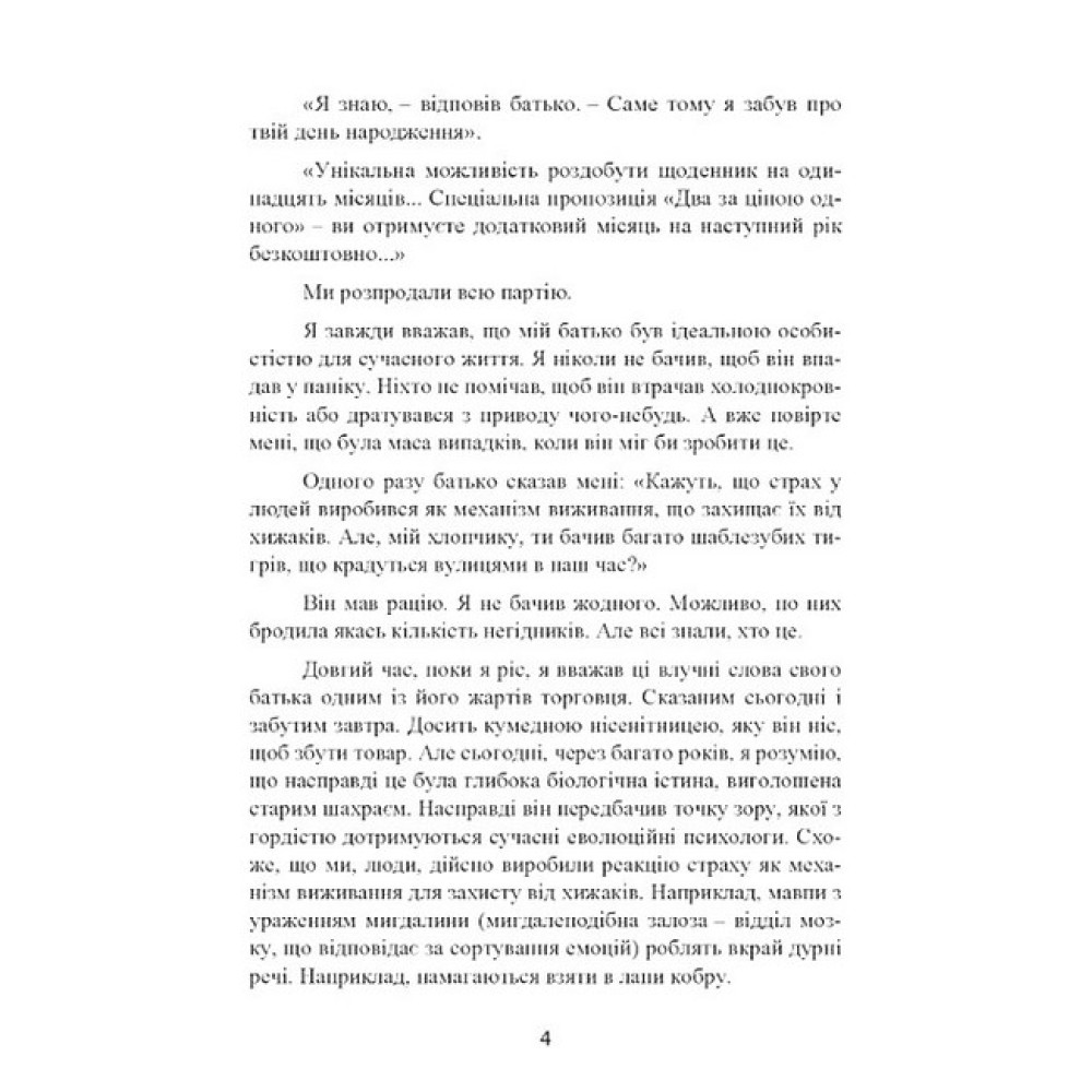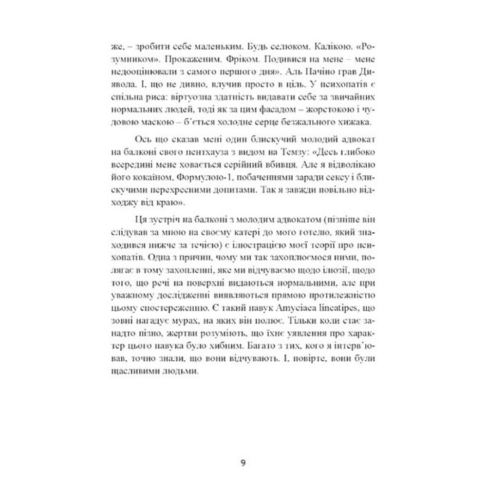 Хоч би як парадоксально це звучало, у психопатів є чому повчитися!.. Психопати не знають страху й жалості, вони чарівні, привабливі й безмежно впевнені в собі. Та й запальні вони далеко не завжди. У наш час поділ на психопатів і нормальних людей умовний, ось чому розпізнати психопата не так вже й просто. Якості, властиві психопатам, нерідко трапляються у лідерів. Відсутність жалю і готовність маніпулювати, завищена самооцінка, невичерпна чарівність і незвичайний дар переконання – все це дає їм змогу робити що завгодно і коли завгодно, абсолютно не переймаючись наслідками і не відчуваючи жодних докорів сумління. У психопатів, безумовно, є чому повчитися — їхні особисті якості та інтелект гарантують успіх у житті.