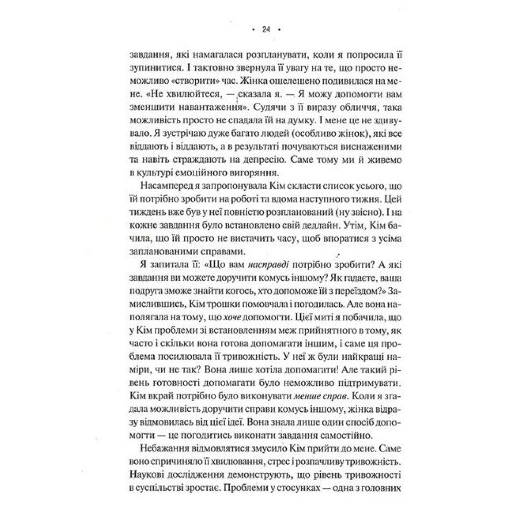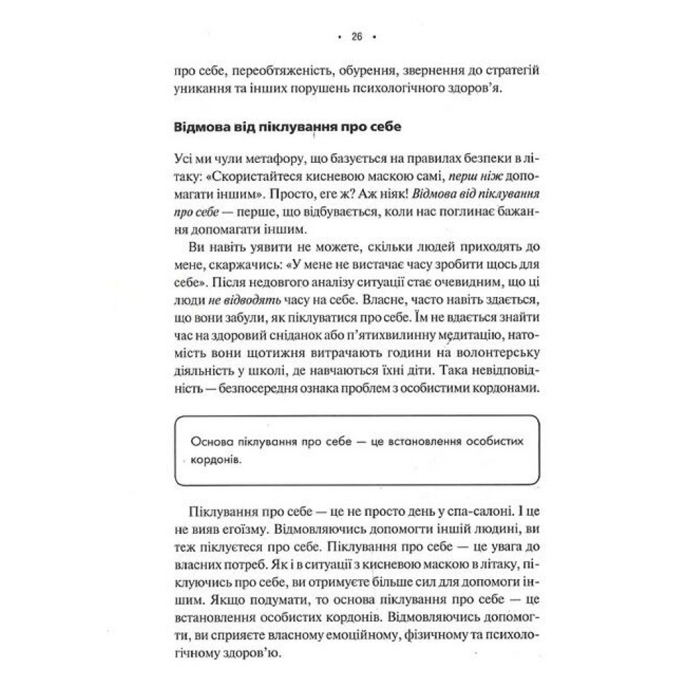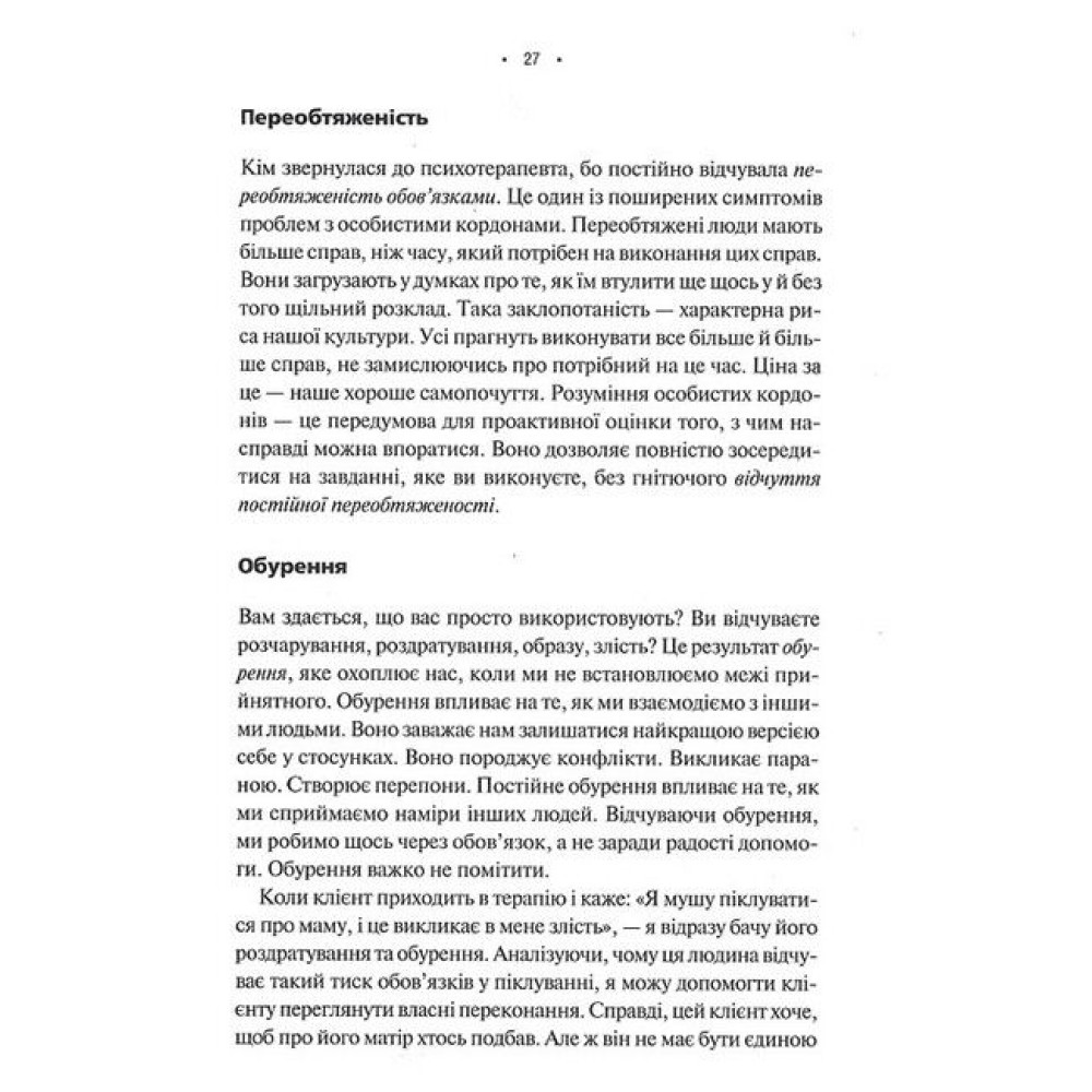 Авторський підхід, ґрунтований на найновіших дослідженнях та передових методах когнітивно-поведінкової терапії Від однієї з найбільш впливових та експертних психотерапевток сучасності. Стаєте жертвою нетактовних запитань на кшталт "Чому досі не в стосунках / без дитини / престижної роботи"? Кажете "так" замість "ні", бо не хочете конфлікту? Дозволяєте маніпуляції та рідко висловлюєте власну думку? Ваші особисті кордони постійно порушують? Як наслідок: доводиться спілкуватися з людьми, які не подобаються, ходити на роботу, з якої мрієте звільнитися, та постійно терпіти чужі повчання. Час змінити правила гри. І встановити межі. Недра Тавваб зрозуміло і тактовно аналізує питання про те, що таке особисті кордони і які вони бувають, навіщо нам ці межі та як вони функціонують. Поради Тавваб допоможуть почуватися впевненіше, подолати комплекси, пропрацювати травми, усвідомити свої сили, повністю реалізувати власний потенціал і здобути омріяну свободу, чітко встановлюючи здорові кордони в особистому та професійному житті.