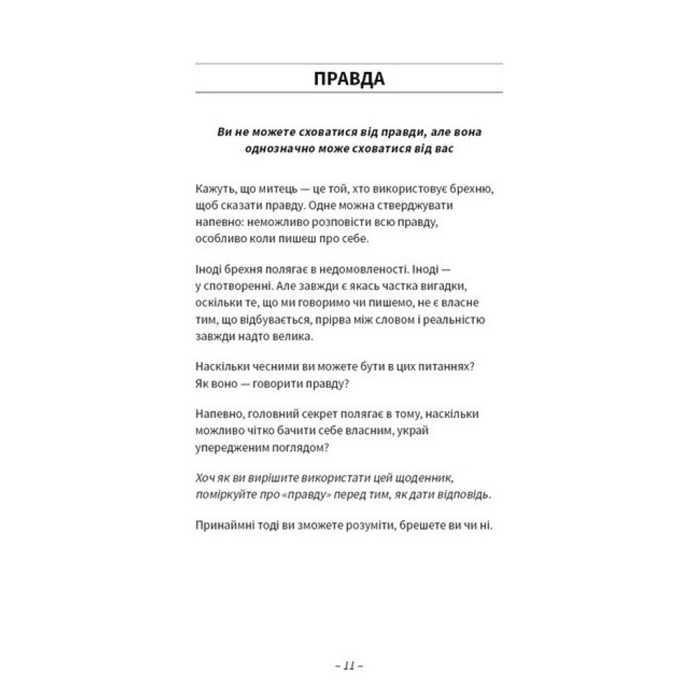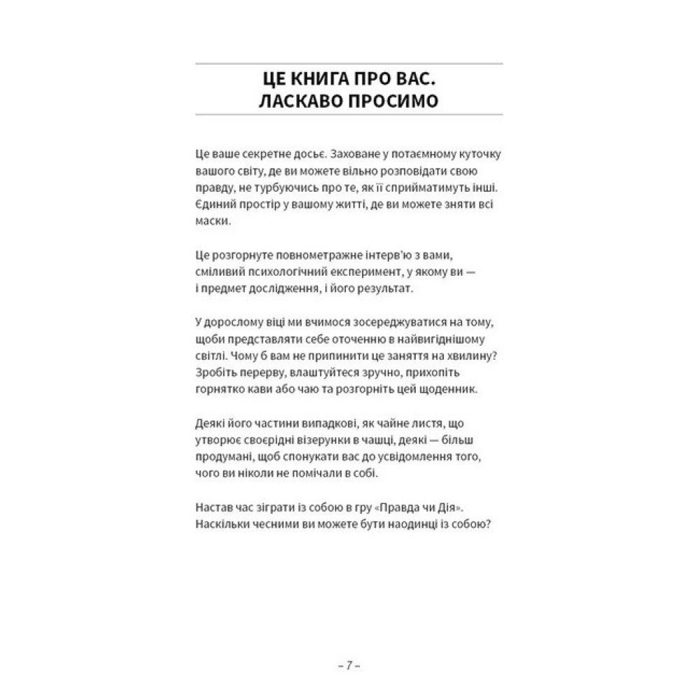 Наскільки чесними ви можете бути наодинці із собою? Що зважитеся розповісти, коли цього ніхто не почує й ніколи, крім вас, не прочитає? Які таємниці про себе дізнаєтеся, якщо знімете маски, одягнуті для соцмереж, і залишитеся «оголеними» й справжніми? Цей щоденник пропонує запитання з підказками, психологічні ігри, творчі експерименти та домашні завдання, присвячені вашій улюбленій темі — темі про вас. Можете весело провести час, або поставитися до цієї гри надто серйозно, або ж і те, і те водночас. Вирішувати вам. На вас чекає можливість відповісти на головні життєві питання: «Ким ви є зараз? Як ви опинилися в цьому моменті? І куди ви прямуєте?». Однак щоб знайти правду про себе, вам потрібно буде дотримуватися певних правил. Перше: відповідати з неухильною чесністю на всі запитання, які виникатимуть у процесі роботи над заповненням щоденника. Друге: не заповнювати його методично, а обирати питання, найактуальніші для вас у даний момент.