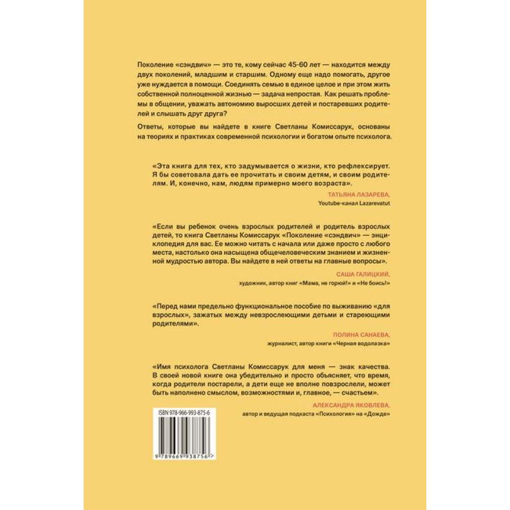 Поколение ""сэндвич"" – это те, кому сейчас 45-60 лет – находится между двух поколений, младшим и старшим. Одному еще надо помогать, другое уже нуждается в помощи. Соединять семью в единое целое и при этом жить собственной полноценной жизнью – задача непростая. Как решать проблемы в общении, уважать автономию выросших детей и постаревших родителей и слышать друг друга?Ответы, которые вы найдете в книге Светланы Комиссарук, основаны на теориях и практиках современной психологии и богатом опыте психолога.