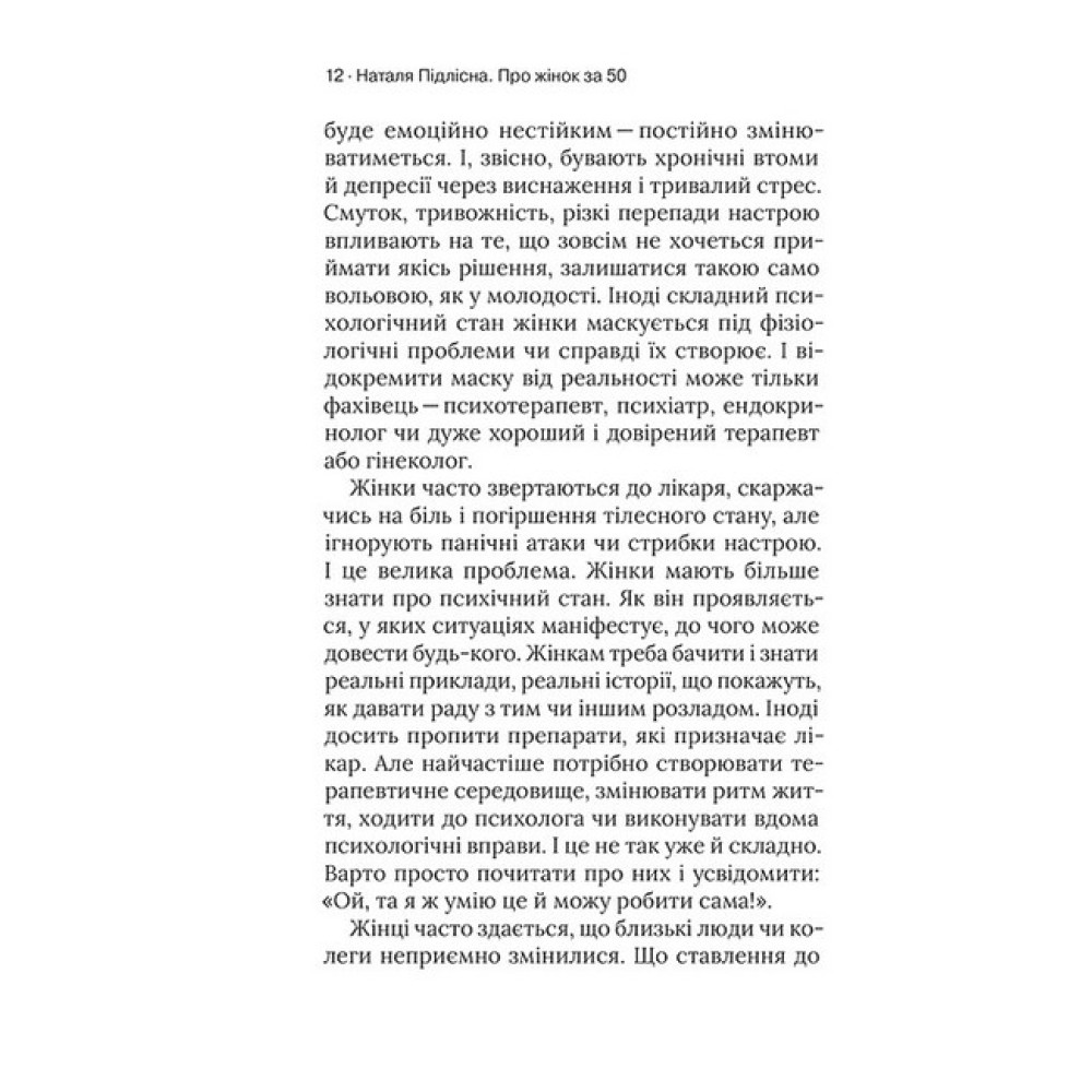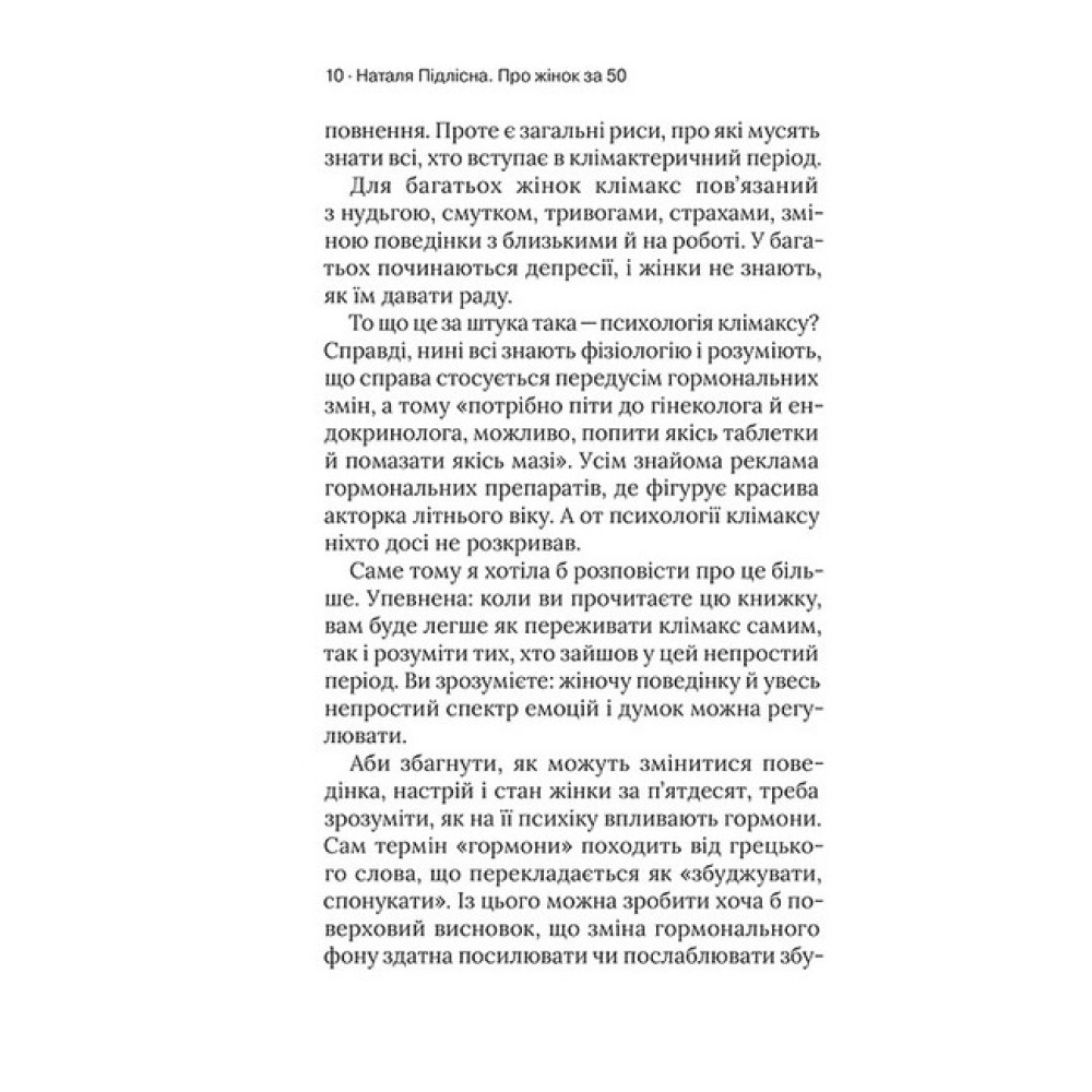 Ви — жінка в розквіті осінньої життєвої пори. І, здається, раптом щось пішло не так: світ змінився в гірший бік, усі довкола вас не розуміють, та й ви почуваєтеся не надто добре, не встигаєте за сучасним ритмом на роботі й постійно конфліктуєте з родиною. Що трапилося? Де ви повернули не туди? Яких змін не помітили? У цій книжці психологиня Наталя Підлісна пояснить особливості жіночих вікових змін, наведе приклади із власної психологічної практики, базовані на реальних історіях, і переконає, що нічого страшного з вами не трапилося, а незручне в нашому суспільстві слово «клімакс» — не таке страшне, як його малюють. Наталя Підлісна — практикуюча психологиня, телезірка. Працювала в різних проектах, пов’язаних із лікуваннями залежностей, сексуальної освіти, допомоги тим, хто помирає. Займалася питаннями профілактики наркоманії, алкоголізму, СНІДу. Також створила телефон довіри, який успішно працює до сьогодні.
