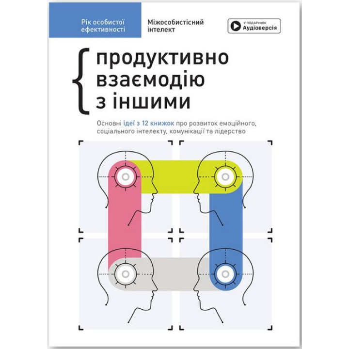Ця книжка містить 12 самарі книжок про усвідомлений розвиток емоційного і соціального інтелекту, емпатію, вміння ефективно спілкуватися, формувати стосунки. За її допомогою можна з’ясувати власні соціальні ролі, дізнатися, як впливає на нас наше близьке і далеке оточення, встановити глибші зв'язки з людьми і посилити лідерські риси. Світові бестселери, які ввійшли до збірки: 1. «Емоційний інтелект. Книжка, яка змінює уявлення про те, що означає бути розумним» Деніел Ґоулман 2. «Люди, які грають в ігри» Ерік Берн 3. «Брехня» Сем Гарріс 4. «Шість капелюхів мислення» Едвард де Боно 5. «Я бачу, про що ви думаєте» Джо Наварро, Марвін Карлінс 6. «Мотивація і особистість» Абрагам Маслоу 7. «Драйв. Дивовижна правда про те, що нас мотивує» Деніел Пінк 8. «Пов’язані однією мережею. Як на нас впливають люди, яких ми ніколи не бачили» Ніколас Крістакіс, Джеймс Фаулер 9. «Лідер без титулу» Робін Шарма 10. «Агент впливу. Як змінити будь-що» Керрі Паттерсон, Джозеф Ґренні, Девід Максфілд, Рон Макміллан, Ел Світцлер 11. «Команди менеджерів. Секрети успіху і причини невдач» Мередіт Белбін 12. «Розвиток лідерів. Як зрозуміти свій стиль керування й ефективно спілкуватися з носіями інших стилів» Іцхак АдізесСерія «Рік особистої ефективності» — це 4 збірники, кожен з яких містить 12 самарі найцінніших книжок з особистого розвитку й особистої ефективності. Всі ці книжки – безумовний мастрід, гідний посісти важливе місце в системі знань людини, що налаштована на зростання і бере на себе відповідальність за своє щастя й успіх. Ми використовуємо підхід, що ґрунтується на лініях інтелекту (спасибі Кену Вілберу, що надихнув нас). Цей та інші близькі підходи передбачають, що людина має різні види інтелекту, кожен з яких можна усвідомлено розвинути і посилити. Кожен збірник проєкту «Рік особистої ефективності» допоможе вам зробити якісний ривок у розвитку однієї з чотирьох найважливіших сфер інтелекту. Читання одного самарі забере у вас пів години, а всю книжку можна прочитати за кілька днів. Решту часу ви зможете використати для практики.