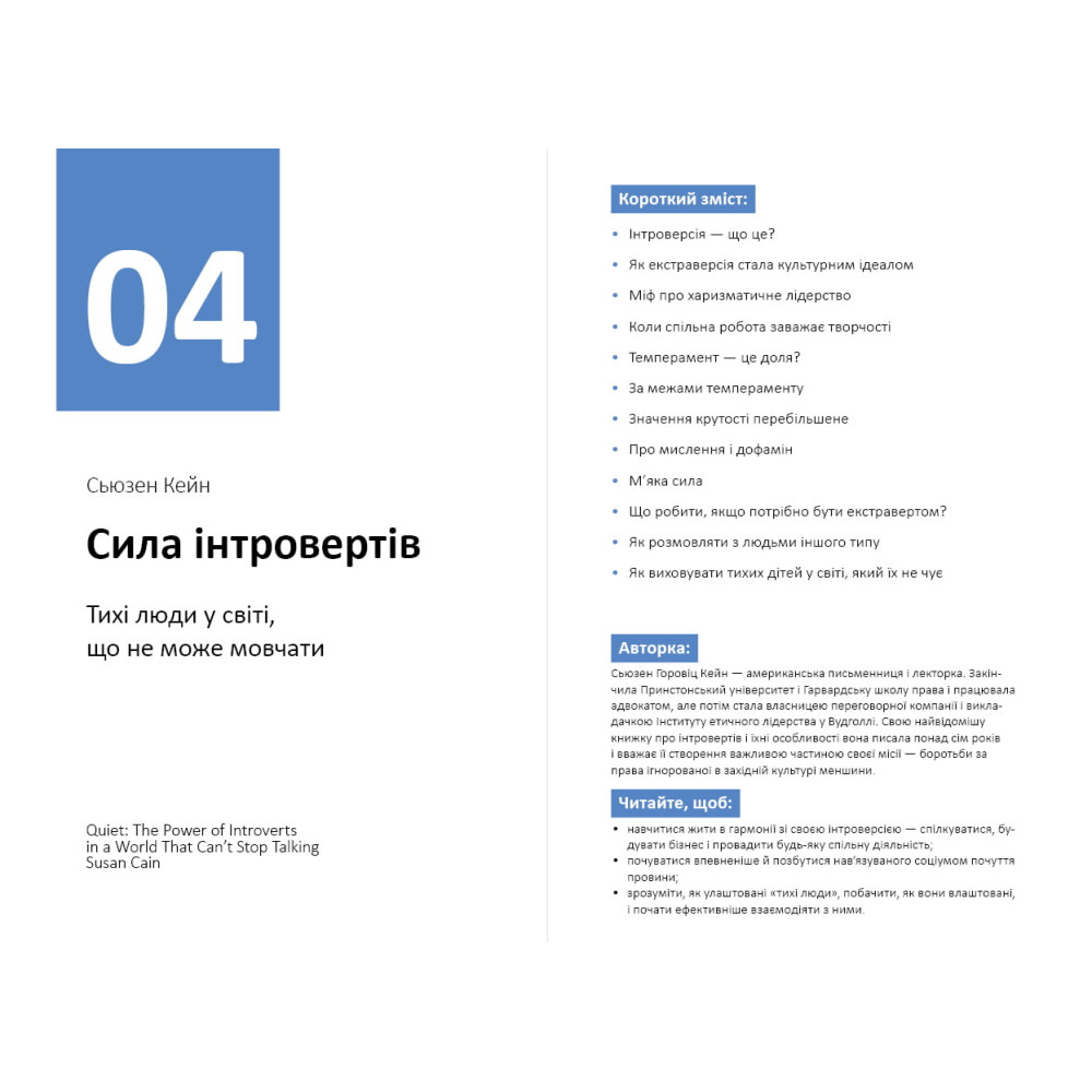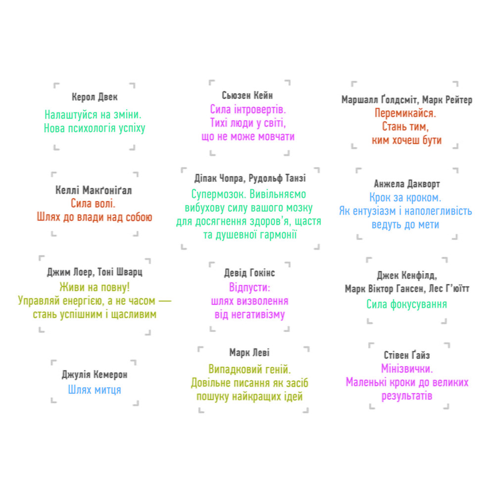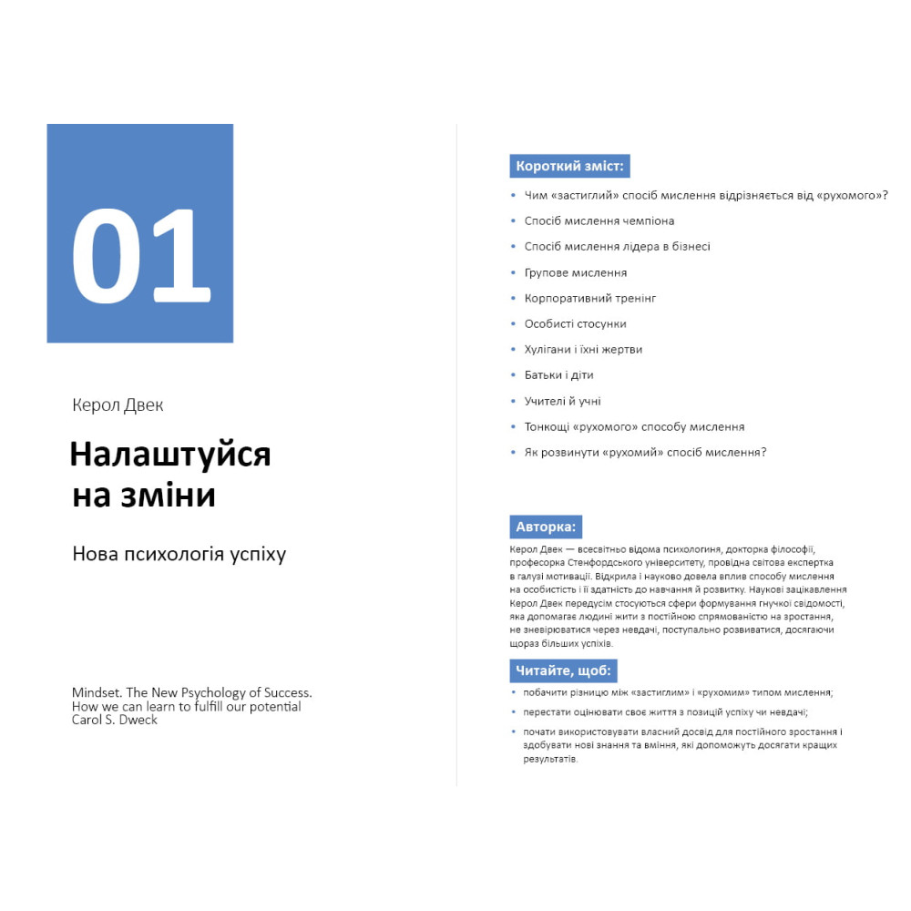ПРО КНИГИЦя книжка містить 12 самарі книжок про внутрішньоособистісний інтелект. Знання, розуміння, вміння керувати собою — ті ключові навички, які дають змогу людині успішно розвиватися, виявляти силу волі й керувати своїми звичками.«Налаштуйся на зміни. Нова психологія успіху» Керол Двек«Супермозок. Вивільняємо вибухову силу вашого мозку для досягнення здоров'я, щастя та душевної гармонії» Діпака Чопра, Рудольфа Танзі«Крок за кроком. Як ентузіазм і наполегливість ведуть до мети» Анжели Дакворт«Сила інтровертів. Тихі люди у світі, що не може мовчати» Сьюзен Кейн«Сила волі. Шлях до влади над собою» Келлі Макґоніґал«Перемикайся. Стань тим, ким хочеш бути» Маршалла Ґолдсміта, Марка Рейтера«Мінізвички. Маленькі кроки до великих результатів» Стівена Ґайза«Відпусти: шлях визволення від негативізму» Девіда Гокінса«Шлях митця» Джулії Кемерон«Випадковий геній. Довільне писання як засіб пошуку найкращих ідей» Марка Леві«Живи на повну! Керуй енергією, а не годиною — стань успішним і щасливим» Джима Лоера, Тоні Шварц«Сила фокусування» Джека Кенфілда, Марка Віктора Гансена, Ліси Г'юїттаПРО ПРОЄКТПроєкт «Рік особистої ефективності» — серія з чотирьох збірників, до шкірного з яких входити 10-12 самарі найцінніших книжок з особистого розвитку й особистої ефективності. Усі ці книжки — безумовний мастрід, що гідний посісти важливе місце в системі знань людини, налаштованої на зростання, і здатний забезпечити для цього сильну основу.Ще зовсім недавно вважалося, що інтелект у людини один, і кожному з нас або пощастило його мати, або ні. А тепер психологи і вчені, що досліджують людський мозок, виділяють до 35 видів інтелекту, кожен з яких може бути розвинений у конкретного індивіда тією чи іншою мірою. Навіть більше, кожен піддається усвідомленому розвитку, а в системі різні види інтелекту розвиваються краще, підсилюючи один одного.Ми використовуємо підхід, що базується на лініях інтелекту (завдяки Кену Вілберу, що надихнув нас). Кожен збірник проєкту «Рік особистої ефективності» допоможе вам посилити одну з граней інтелекту.Збірник №1 — «Когнітивний інтелект. Ефективно вчуся, застосовую техніки й інструменти».Збірник №2 — «Внутрішньоособистісний інтелект. Знаю, розумію, керую собою».Збірник №3 — «Міжособистісний інтелект. Продуктивно взаємодію з іншими».Збірник №4 — «Екзистенціальний інтелект. Шукаю, усвідомлюю, дотримуюся великих сенсів».Читання одного самарі забере у вас півгодини, решту часу ви зможете використовувати для практики.ПРО АВТОРА«Дочитаєш до 35-ї сторінки, зайди до мене!»Такий простенький запис залишив генеральний директор однієї з компаній на 35-й сторінці шкірного з п'ятьма п'ятдесяти примірників книжки «Від хорошого до величного», які він придбав для своїх ключових менеджерів.Скільки з них зайшло? Жодного!Читання стає розкішшю, доступною далеко не всім. При цьому ми втрачаємо можливість переймати ідеї з розвитку бізнесу і вчимося найдорожчим та найдовшим способом — припускаючись помилок.Команда компанії Smartreading, яку заснував Михайло Іванов (так-так, тієї самий Іванов, який є одним з батьків-засновників видавництва «Манн, Іванов і Фербер»), придумала рішення! Самарі — тексти, в яких у стислій формі розповідається про ключові ідеї кожної книжки. Вони не просто скорочують текст, а аналізують і збирають всю «сіль