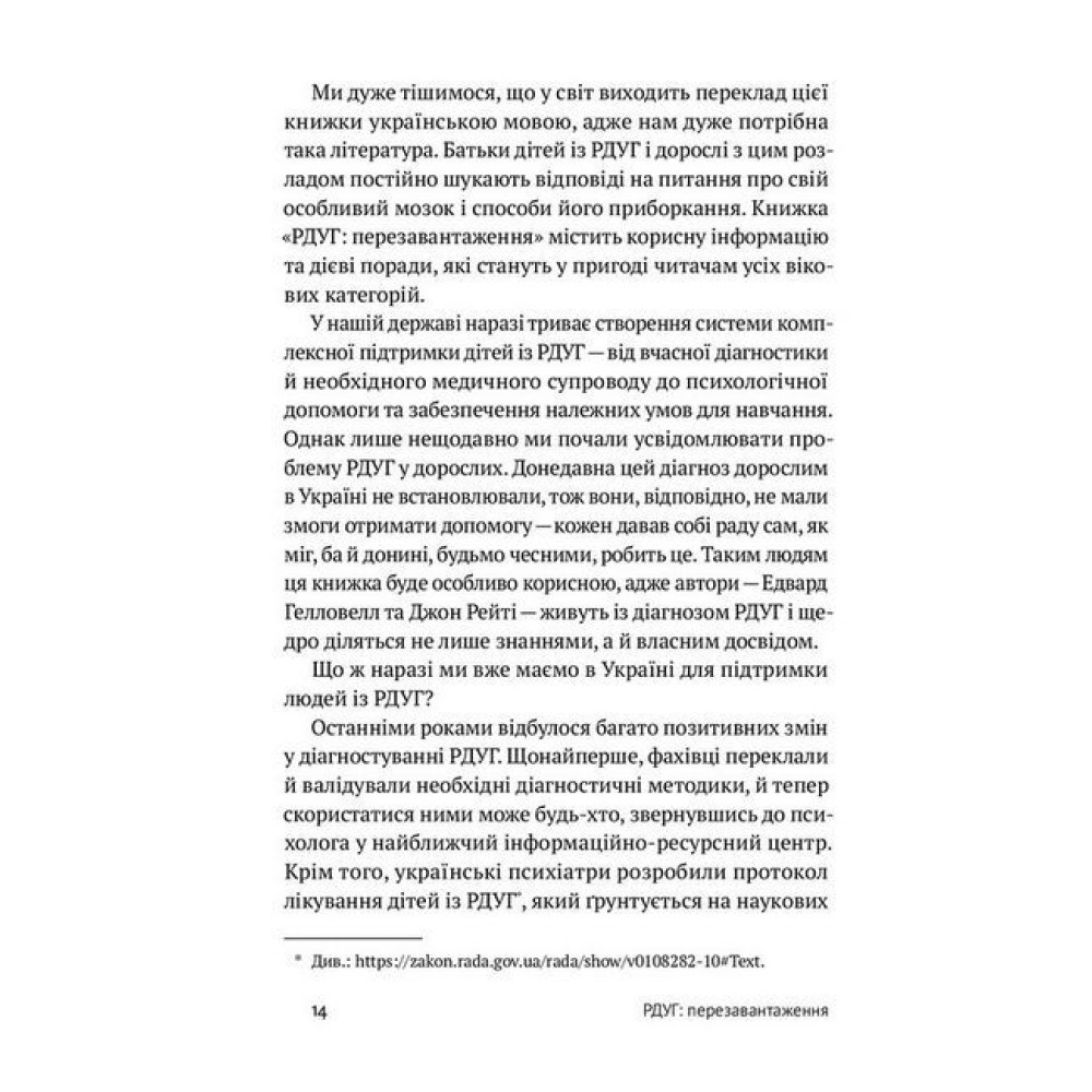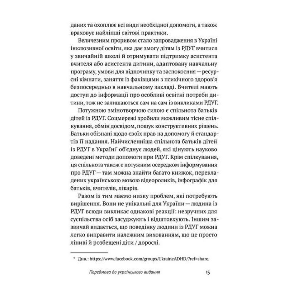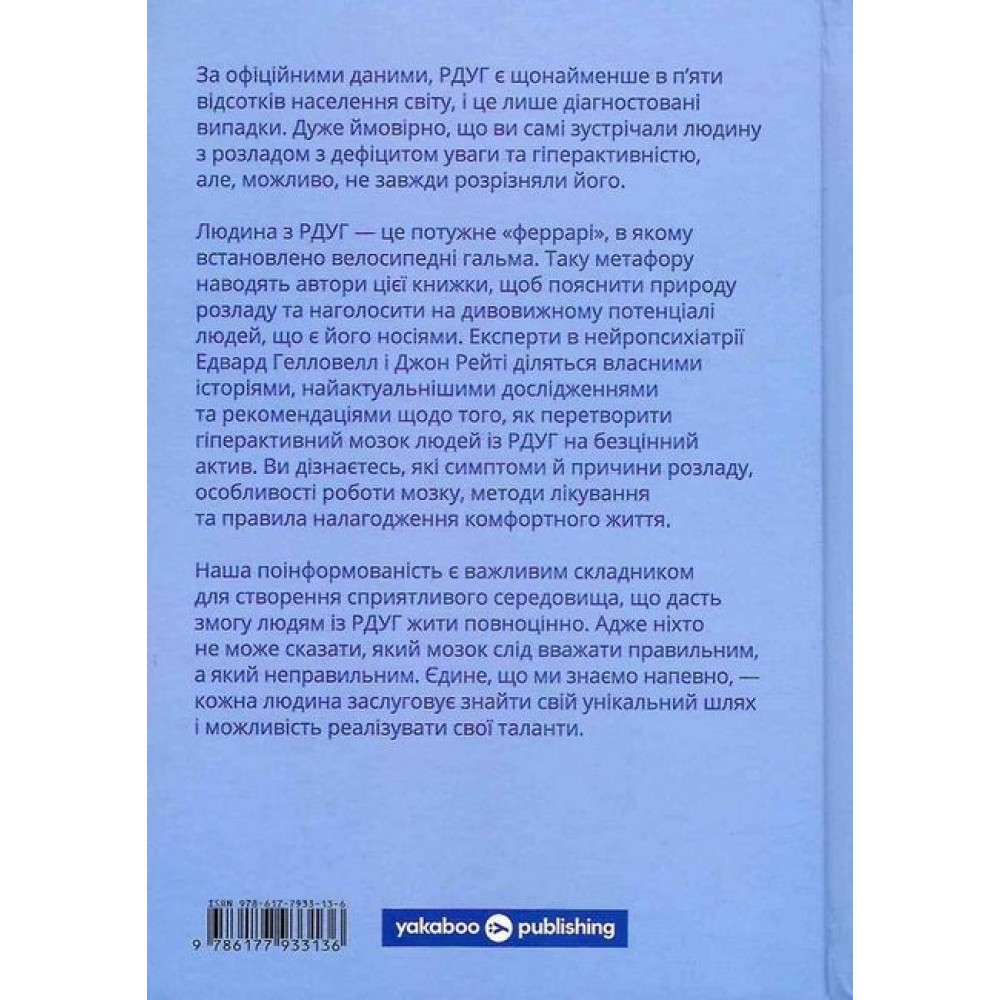 Автор | Едвард Гелловел, Джон Рейті Рік 2022 Мова Українська Жанр Психотерапія 400 ? КупитиВсе про “РДУГ: перезавантаження. Ефективні стратегії для повноцінного життя з розладом дефіциту уваги та гіперактивності в дітей і дорослих”Від видавця Більшість людей нині не раз зустрічали когось із РДУГ, подеколи не розуміючи суть цього розладу. Багато хто досі й гадки не має, яким складним і серйозним є цей розлад, як не знає й про те, який величезний стрибок у його розумінні та лікуванні зробила наука за останні роки. Розуміння РДУГ серед широкого загалу зазвичай або хибне, або оповите низкою стереотипів, що завдає шкоди мільйонам людей, які через це не звертаються по допомогу або не знають, яка саме допомога їм потрібна. Недостатня інформованість громадськості й досі залишається найстрашнішим ворогом РДУГ.Автори цієї книжки теж мають цей розлад і, окрім того, є сертифікованими психіатрами. У цій праці вони детально описують симптоми, причини та особливості РДУГ, розповідають про особливості роботи мозку та останні дослідження в нейробіології, показують, як організувати комфортне середовище людям із РДУГ, перетворити розлад на свою суперсилу та жити повноцінно. Рецензії 0 Всі характеристики БрендYakaboo Publishing |