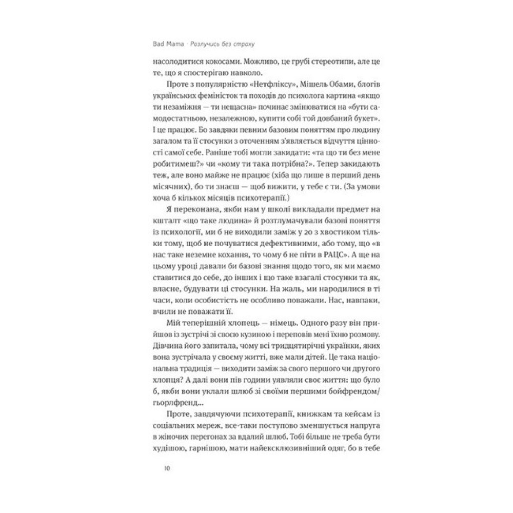 Що робити, коли ідея щасливого шлюбу не спрацювала? Як наважитися на розлучення? Не відчувати провину перед дітьми? Зрозуміти, як налагодити стосунки після розриву так, щоб усі були щасливі? Як знову повернутися у професію чи освоїти нову? Як не відчувати провину?Тема розлучення актуальна, але, на жаль, досі мало розкрита в українському суспільстві, а також сповнена осуду і звинувачень. Адже «довго і щасливо» часто є різним для чоловіка і дружини.Авторка на прикладі власного досвіду розповідає, що розлучення — це нормально, коли тебе не влаштовує твоє життя. Головне — усвідомити цей вибір і зробити перший крок. А з наступними допоможе впоратися ця книжка.