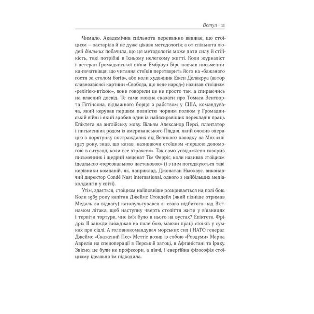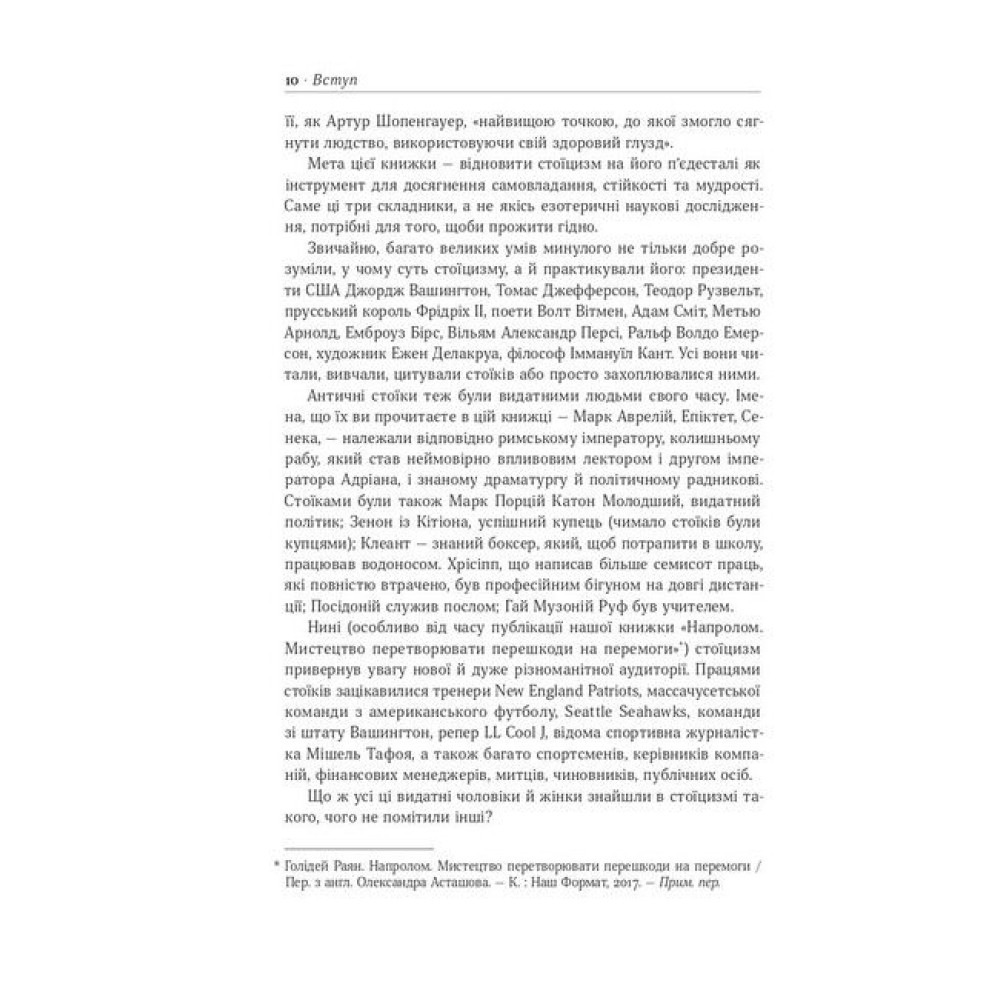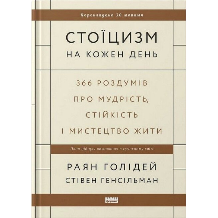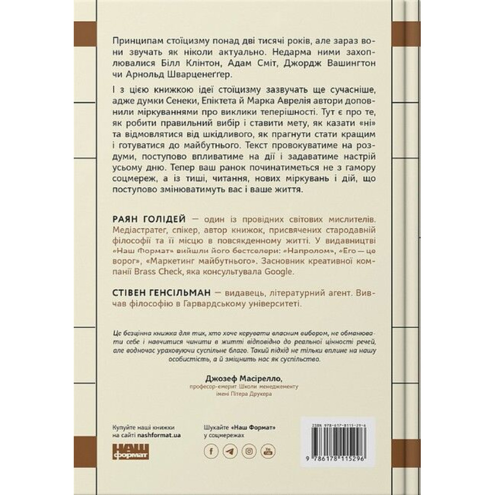 Є те, що ми можемо змінити, і те, що ні. Хоч би як сильно ми сварилися з представником авіакомпанії, яка скасувала рейс через погодні умови, це не зупинить шторм. Хоч би як ви нервувалися в заторі, ви не поїдете швидше. Ви не примусите техніку не ламатися в найневдаліший момент, не станете нижчим або вищим, не народитеся в іншій країні. Але нервуючись через те, що не змінити, ми витрачаємо сили, ресурси й час, які могли би спрямувати на те, на що справді можемо вплинути. ДЛЯ КОГО КНИЖКА "СТОЇЦИЗМ" Книжка для широкого кола читачів, усіх, хто шукає дієві поради, як позбутися відчуття стресу та спокійно сприймати кризові ситуації та повсякденні негаразди. ЧОМУ САМЕ ЦЕ ВИДАННЯ Ця книжка примусить по-іншому поглянути на реальність, яка вас оточує, а також навчить підходити до владнання будь-яких проблем із самовладанням та мудрістю. ПРО АВТОРІВ Раян Голідей — медіастратег і письменник. Працював директором з маркетингу в American Apparel. Засновник креативної компанії Brass Check, яка консультувала Google, TASER, Complex та інші успішні корпорації. Дописувач New York Times, AdAge, Fast Company, Thought Catalog і New York Observer. Автор бестселерів із маркетингу та саморозвитку, зокрема книжок «Напролом. Мистецтво перетворювати перешкоди на перемоги» («Наш Формат») та «Маркетинг майбутнього» («Наш Формат»). Стівен Генсільман — видавець, літературний агент. Вивчав філософію в Гарвардському університеті.
