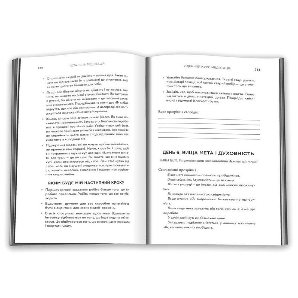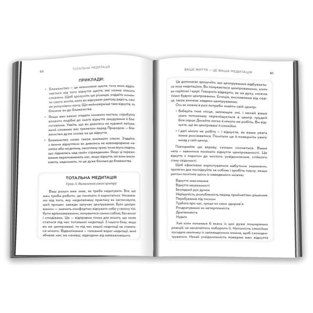 Упродовж останніх тридцяти років Діпак Чопра - духовний лідер, фахівець з інтегративної медицини та особистісної трансформації - перебуває на передньому краї революційних західних досліджень у царині медитації. "Тотальна медитація" - книга, яка закликає до глибокого вивчення і переосмислення фізичних, розумових, емоційних, стосункових і духовних переваг, що їх пропонує ця техніка. Автор підводить до розуміння того, як можна пробудитися до нових рівнів усвідомленості, що зрештою дасть ясне бачення, зцілить страждання розуму й тіла, допоможе пізнати своє істинне "Я". Завдяки трансформаційному процесу, який спонукає тіло, розум і дух до пробудження, читач матиме змогу двадцять чотири години на добу жити у стані відкритого, вільного, творчого й щасливого усвідомлення.