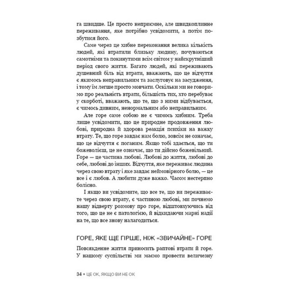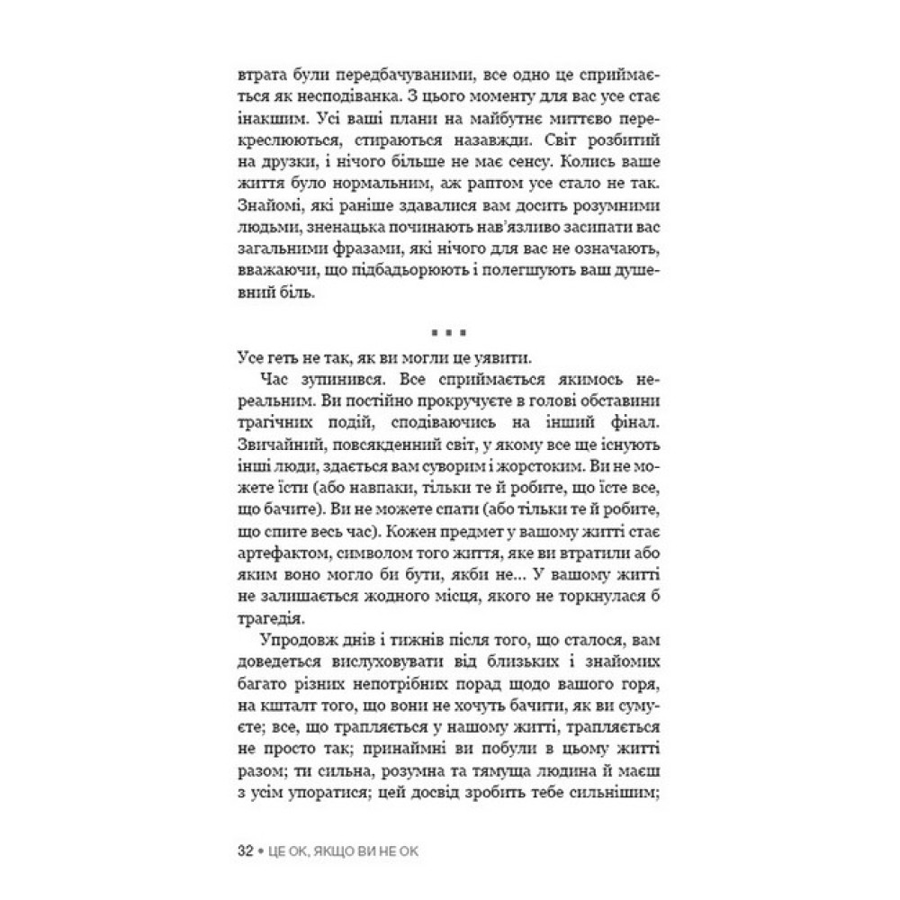 Втрата й горе вибивають нас із колії звичного життя, яке, втім, триває далі. І більшість людей закликають якомога швидше повернутися до нього. Однак втрата — це не проблема чи неприємний стан, від яких потрібно позбавитися. Горе насамперед потрібно «прожити». Саме цим умінням ділиться Меґан Девайн і як психотерапевт, і як жінка, яка пережила смерть коханого. Вона з глибоким розумінням пише про невисловлену скорботу, а також про любов і зцілення, ділиться своїм досвідом і пропонує методи та вправи, які допоможуть полегшити страждання й біль.Книга «Це ОК, якщо ви не ОК» допоможе тим, хто втратив близьку людину, пережити невимовне й знайти своє місце в житті, а також навчить тих, хто поряд, як підтримати, не зашкодивши.Про автора:Меґан Девайн — письменниця, спікерка й активна поборниця емоційних змін на рівні суспільства. Має ступінь магістра з консультативної психології. Після трагічної загибелі свого коханого у 2009 році Меґан стала провідним фахівцем світового рівня, який сміливо бореться за зміни у сфері підтримки людини у горі. Створений та розвинений Меґан сайт Refuge in Grief став прихистком для людей, які страждають від душевного болю, а також добрим порадником для тих, хто хоче допомогти своїм близьким пережити трагедію.